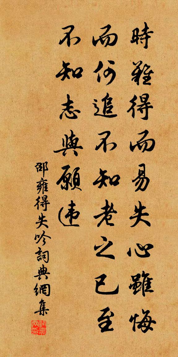 詩詞名句歷史字典書法欣賞書法字典國語詞典說文解字康熙字典古漢語字典標 題 作 者 詩 句 得失吟作者:邵雍 朝代:宋代得失吟原文時難得而易失,心雖悔而何追。不知老之已至,不知志與願違。詩詞問答問:得失吟的作者是誰?答:邵雍問:得失吟寫於哪個朝代?答:宋代邵雍得失吟書法欣賞得失吟書法作品詩詞推薦喜仲晦除江西憲二首劉克莊〔宋代〕江卿二皋除書下,不與尋常遣使同。玉佩懶隨小兒走,繡衣聊展丈夫雄。劍刀俗革田秋熟,貫索芒收圄夜空。想伴驀山溪(暮秋賞梨花)曾覿〔宋代〕凋紅減翠,正是清秋杪。深院裊香風,看梨花、一枝開早。瓏璁映面,依約認嬌顰,天淡淡,月溶溶,春意知多少霜天曉角徐君寶妻〔宋代〕雙巒斗碧,寒玉雕秋壁。兩道凝螺天半,橫無限、青青色。拍案濤聲急。似鼓臨邛瑟。窗下鏡台鸞去,空留得、春出塞四首借用秦少游韻陸游〔宋代〕符離既班師,北討意頗闌。志士雖有懷,開說常苦艱。諸將初北首,易水秋風寒。黃旗馳捷奏,雪夜奪榆關。虎丘分韻得落字潘牥〔宋代〕急雨成快晴,晚日射□薄。院靜轆轤聲,崖古楷杷落。澄泓有潛鱗,寥廓無歸鶴。明年當掛冠,吾志在丘壑。天台觀石簡記佚名〔唐代〕海水竭,台山缺,皇家寶祚無休歇。萍釋可齋〔宋代〕盆池本不種青萍,春杪無根也自生。人道一宵生九葉,不知誰數得分明。好事近汪莘〔宋代〕風日未全春,又是春來風日。不出方壺門戶,見東皇訊息。此時春事苦無多,春意最端的。卻被草牙引去,向柳梢呈許深父及之趙蕃〔宋代〕路入分宜縣,心馳月旦評。參差萬木合,曲折亂灘行。江右孰茂宰,斯人垂大名。鳧飛看公入,鳶墮黯余情。別庾七入蜀詩庾信〔南北朝〕峻岭拂陽烏。長城連蜀都。石銘懸劍壁。沙洲聚陣圖。山長半股斷。樹古半心枯。由來兄弟別。共念一荊株。次韻趙去華提乾夏日雜興七首蘇泂〔宋代〕植立不徒當日計,顛冥忍受一飢驅。吟成拙賦何曾拙,喚作愚溪豈是愚。夾漈草堂劉克莊〔宋代〕嶺絕瀑源窮,曾於此築宮。得知千載上,因住萬山中。廢址苔荒盡,遺書電取空。高皇南渡始,卻議及招弓。子都兄寄子濟兄詩借韻奉寄李洪〔宋代〕緘題千里候寒暄,悵恨郊荊獨我班。目斷檣烏五兩遠,書憑河鯉一雙還。金陵風月供吟嘯,鍾阜煙蘿想縱攀。盡把偈三十五首釋祖珍〔宋代〕向上一路,千聖不傳。學者勞形,如猿捉影。出郊王安石〔宋代〕川原一片綠交君,深樹冥冥不見花。風日有情無處著,初回光景到桑麻。頌古一○一首釋子淳〔宋代〕靈然不涉古來今,三界都盧一點心。檻外桃花春蝶舞,門前楊柳曉鶯吟。春聲碎(南浦送別自度腔)譚宣子〔宋代〕津館貯輕寒,脈脈離情如水。東風不管,垂楊無力,總雨顰煙寐。欄乾外。怕春燕掠天,疏鼓疊、春聲碎。劉郎易江城子秦觀〔宋代〕清明天氣醉游郎。鶯兒狂。燕兒狂。翠蓋紅纓,道上往來忙。記得相逢垂柳下,雕玉珮,縷金裳。春光還是舊春光清平樂·煙深水闊李白〔唐代〕煙深水闊,音信無由達。唯有碧天雲外月,偏照懸懸離別。盡日感事傷懷,愁眉似鎖難開。夜夜長留半被,待君魂贈張公洲革處士李白〔唐代〕抱瓮灌秋蔬,心閒遊天雲。每將瓜田叟,耕種漢水濆。時登張公洲,入獸不亂群。井無桔槔事,門絕刺繡文。長揖名句推薦不誘於譽,不恐於誹。荀子《荀子·非十二子》 忽大風起,塵氣莽莽然,城市依稀而已。蒲松齡《山市》 天不老,情難絕。張先《千秋歲·數聲鶗鴂》 時無英雄,使豎子成名!房玄齡《晉書·列傳·第十九章》 善有善報,惡有惡報。佚名《增廣賢文·上集》 折花逢驛使,寄與隴頭人。陸凱《贈范曄詩》 將軍發白馬,旌節度黃河。李白《發白馬》 忽聞歌古調,歸思欲沾巾。杜審言《和晉陵陸丞早春遊望》 若待得君來向此,花前對酒不忍觸。蘇軾《賀新郎·夏景》 有一言,無一行,胃(謂)之誣。佚名《黃帝四經·十大經·雌雄節》