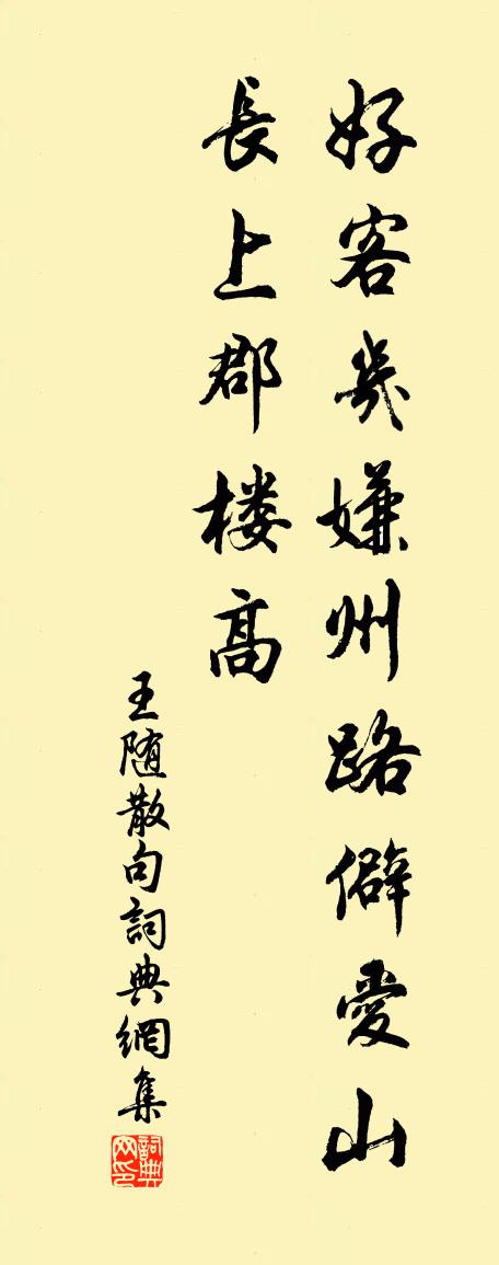 詩詞名句歷史字典書法欣賞書法字典國語詞典說文解字康熙字典古漢語字典標 題 作 者 詩 句 句作者:王隨 朝代:宋代句原文好客幾嫌州路僻,愛山長上郡樓高。詩詞問答問:句的作者是誰?答:王隨問:句寫於哪個朝代?答:宋代王隨句書法欣賞句書法作品詩詞推薦禁林讌會之什王旦〔宋代〕喜綴真仙讌禁林,玉堂新事好供吟。天章刻石興風雅,宸翰書牌耀古今。勢逸奪回龍鳳跡,調高流入管弦音。光凝南柯子侯善淵〔元代〕坐看華胥景,神遊玩寶方。一雙童子抱龍光。煥煥煌煌,撮聚入中央。產出靈仙子,功成入帝鄉。玉霄榜上應科場十四弟歸洪州賦莫如兄弟四章贈行黃庭堅〔宋代〕惱人自作樂,休休莫莫莫。相看將白頭,止有不如昨。宰予晝寢佚名〔唐代〕宰予晝寢,子曰:“朽木不可雕也,糞土之牆不可圬也!於予與何誅?”子曰:“始吾於人也,聽其言而信其行;太常引 壽高右丞自上都分省回張野〔元代〕巍然勳業歷台司。一柱盡能支。報國與憂時。怎瞞得、星星鬢絲。龍門山色,灤河雲影,添入介眉詩。沉醉莫推辭暮春聯句九首許月卿〔宋代〕清廟朱弦瑟,羔羊素緎風。釣竿漁艇小。園徑李蹊通。白酒渾忘送,皇天似不公。風檐開秀色,雪嶺現 * 。王化重宿紫芝杜耒〔宋代〕書窗隔湖水,寒氣倍馮陵。集宿因重到,新詩得再承。月明山入坐,滿渴夜敲冰。為爾二三友,令人去未能。頌古三十八首釋從瑾〔宋代〕鍾送黃昏雞報曉,趙州何用閒煩惱。裂破虛空作兩邊,古廟香爐出芝草。十六觀經頌勢至觀第十一釋遵式〔宋代〕次觀勢至菩薩身,量等觀音無有異。但於肉髻寶缾中,盛眾光明現佛事。山園屢種楊梅皆不成枇杷一株獨結實可愛戲作陸游〔宋代〕楊梅空有樹團團,卻是枇杷解滿盤。難學權門堆火齊,且從公子拾金丸。枝頭不怕風搖落,地上惟憂鳥啄殘。清曉宮詞四首劉克莊〔宋代〕先帝宮人總道妝,遙瞻陵柏淚成行。舊恩恰似薔薇水,滴在羅衣到死香。簡彥庸兄弟李處權〔宋代〕五年蹤跡似浮萍,豈料全家入畫屏。春去水田方漫漫,曉來山霧卻冥冥。可憐北客鬢毛白,尚啼主人眸子青。準擬次韻趙帥寒食四首陳造〔宋代〕散吏容陪漢鼎臣,隆隆恩意為誰新。重來畫戟凝香地,爛醉瓊枝璧月春。御街行王哲〔元代〕玉芝一味通賢聖。這藥治、真靈性。虛空臼內穩鋪排,金剛杵、*成精瑩。摩訶般若蜜多和,練熟後、搓為鋌。大淮白袁說友〔宋代〕未識淮鄉味,饕饞老不衰。及茲秋水張,已食小鮮肥。眾口雖難美,飢腸本易為。豈無鱸膾好,物以罕為奇。西江月張孝祥〔宋代〕汗鑄九金神鼎,隋書小字蓮經。剛風劫火轉清冥。護守應煩仙聖。昨夢歸來帝所,今朝壽我親庭。只將此寶伴長生三峽橋錢聞詩〔宋代〕生平有志在山水,得紱此邦非偶爾。行行白鹿書院來,小輿竹逕松陰里。輕雷急鼓山前聞,飛梁截截水下噴。有如舟中夜聞彈箏胡仲弓〔宋代〕艤舟尋近岸,餘興月明中。鼓瑟人何在,彈箏意略同。聲和隨去浪,調古動悲風。爭甲無由見,清音出繡櫳。山行見月作趙蕃〔宋代〕恨我無酒,負爾一醉。酌茲寒泉,兀爾忘睡。鳳時春(見殘梅)王質〔宋代〕標格風流前輩。才瞥見春風,蕭然無對。只有月娥心不退。依舊斷橋,橫在流水。我亦共、月娥同意。肯將情移在名句推薦綺席凝塵,香閨掩霧。晏殊《踏莎行·碧海無波》 秋霜欲下手先知,燈底裁縫剪刀冷。白居易《空閨怨》 虎踞龍蟠何處是,只有興亡滿目。辛棄疾《念奴嬌·登建康賞心亭呈史致道留守》 青冥浩蕩不見底,日月照耀金銀台。李白《夢遊天姥吟留別 / 別東魯諸公》 禍不妄至,福不徒來。司馬遷《史記·龜策列傳》 人有短,切莫揭。人有私,切莫說。李毓秀《弟子規·泛愛眾》 閒碾鳳團消短夢,靜看燕子壘新巢。周邦彥《浣溪沙·水漲魚天拍柳橋》 諫爭輔拂之人,社稷之臣也,國君之寶也,明君之所尊厚也荀子《荀子·臣道》 匝路亭亭艷,非時裛裛香。李商隱《十一月中旬至扶風界見梅花》 春風舉國裁宮錦,半作障泥半作帆。李商隱《隋宮 / 隋堤》
