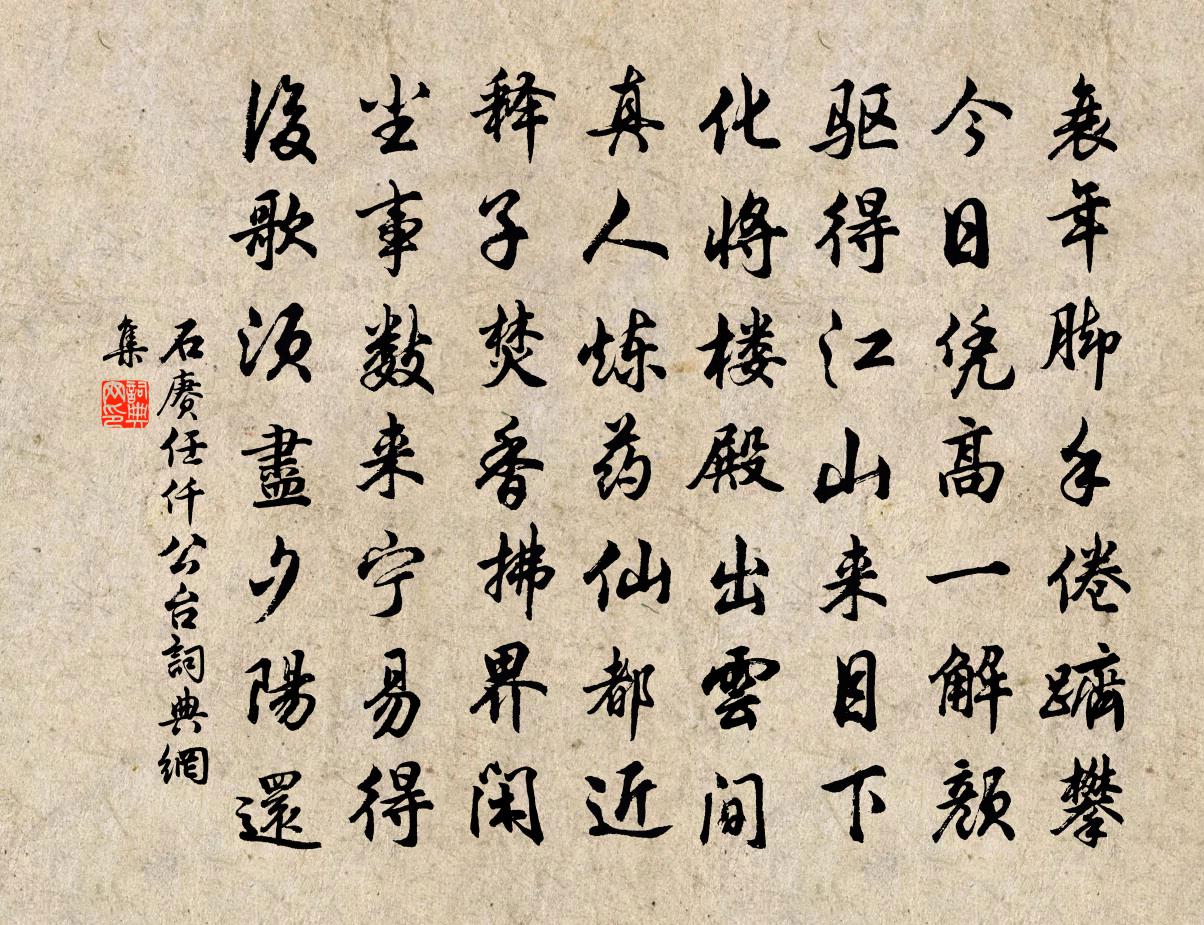 詩詞名句歷史字典書法欣賞書法字典國語詞典說文解字康熙字典古漢語字典標 題 作 者 詩 句 任仟公台作者:石賡 朝代:宋代任仟公台原文衰年腳手倦躋攀,今日憑高一解顏。驅得江山來目下,化將樓殿出雲間。真人煉藥仙都近,釋子焚香拂界閒。塵事數來寧易得,後歌須盡夕陽還。詩詞問答問:任仟公台的作者是誰?答:石賡問:任仟公台寫於哪個朝代?答:宋代石賡任仟公台書法欣賞任仟公台書法作品詩詞推薦和梅摯北池十詠蔣堂〔宋代〕池上有虛閣,翬檐迅若翔。百壺多盛集,四座仰惟良。蘚印文綦綠,蓮依桂楫香。何由陪嘯詠,敷袵納微涼。秋懷十首末章稍自振起亦古義也陸游〔宋代〕身如行腳僧,放包即為家;家如道邊店,蕭然寄天涯。居室如小舟,風扉櫓謳啞;坐傍陳琴書,庭下栽雜花。檢陋偶成楊公遠〔宋代〕世路崎嶇蜀道難,長年兀兀坐柴關。詩才得句心先喜,事不縈懷夢亦閒。已種蒼竿環碧沼,旋營矮屋傍青山。倘來再用前韻謝張濟之見和王之道〔宋代〕我欲訪蓬萊,長笑挹浮丘。此身插兩翼,冷然御颼颸。樓台聳瓊瑤,草木叢珠球。周旋於其間,不知塵世憂。願言水龍吟仇遠〔宋代〕曉星低射疏櫺,殢寒卻枕還慵起。炊煙逗屋,隔房人語,鐙前行李。霜滑平橋,霧迷衰草,時間流水。悵雕鞍獨擁送喬仝寄賀君六首蘇軾〔宋代〕垂老區區豈為身,微言一發重千鈞。始知不見高皇帝,正似商山四老人。題山居十絕雲臥胡仲弓〔宋代〕來尋高處臥吟身,泉石中間避世塵。莫把白雲都占斷,也分一半與閒人。宮詞王仲修〔宋代〕微涼殿閣慶雲邊,正是清和長養天。解慍阜財君德厚,薰風長泛舜琴弦。熙寧以後祀高禖六首佚名〔宋代〕容台講禮,禖宮立祠。司分屈後,帶刊陳閏。嘉祥萃止,靈馭來思。皇支蕃衍,永固邦基。紅藤杖(杖出南蠻)白居易〔唐代〕南詔紅藤杖,西江白首人。時時攜步月,處處把尋春。勁健孤莖直,疏圓六節勻。火山生處遠,瀘水洗來新。粗細廞庭自三山送荔枝分韻得緗字劉學箕〔宋代〕炎精孕秀儲氣詳,荔枝結實魁群芳。我有猶子客南服,千里眷念情不忘。星馳走寄一千顆,伏暑火熾勞取將。筠籃題次真東軒李處權〔宋代〕亂來身世任浮沉,宴豆南州幾盍簪。十頃菰蒲秋向晚,一池煙雨夜來深。詩成頗復蒙嘉賞,酒熟時須共滿斟。喚取上山李廌〔宋代〕登山蓋有道,迂叟真名論。不困在徐行,不跌由足穩。斯言可銘佩,萬事為節撙。推之為躬行,天下國家本。馬嵬二首李商隱〔唐代〕冀馬燕犀動地來,自埋紅粉自成灰。君王若道能傾國,玉輦何由過馬嵬。海外徒聞更九州,他生未卜此生休。空聞送薛居士和州讀書嚴維〔唐代〕孤雲獨鶴共悠悠,萬卷經書一葉舟,楚地巢城民舍少,煙村社樹鷺湖秋。蒿萊織妾晨炊黍,隅落耕童夕放牛。年少浣溪沙 詠橘蘇軾〔宋代〕菊暗荷枯一夜霜。新苞綠葉照林光。竹籬茅捨出青黃。香霧噀人驚半破,清泉流齒怯初嘗。吳姬三日手猶香。郡守宴狀元樂語姚勉〔宋代〕幾多文士踏槐黃,實出倫魁在瑞陽。千古河連留地讖,一聲臚唱破天荒。金釵笑擁龍頭客,寶篆濃薰燕寢香。方國暮秋雜興七首連文鳳〔宋代〕似隱還非隱,未能忘世情。山河亡國恨,風雨客棲聲。窮有天堪問,貧無地可耕。桃源窅何處,目斷故秦城。錢仲庸主簿入京三首裘萬頃〔宋代〕野梅官柳只供愁,空倚鄱江百尺樓。待倩天邊幾鴻雁,為傳訊息到皇州。逢牧梅堯臣〔宋代〕國馬一何多,來牧郊甸初。大群幾百雜,小群數十驅。或聚如斗蟻,或散如驚烏。或踐麥無根,或齧樹無膚。牧卒名句推薦樹曲木者,惡得直景劉向《說苑·君道》 春雲吹散湘簾雨,絮黏蝴蝶飛還住。納蘭性德《菩薩蠻·春雲吹散湘簾雨》 玉屏風冷愁人。醉爛漫、梅花翠雲。吳文英《柳梢青·與龜翁登研意觀雪懷癸卯歲臘朝斷橋並馬之游》 嗚呼!楚雖三戶能亡秦,豈有堂堂中國空無人!陸游《金錯刀行》 無智無以成奸,其智陰也。有善無以為奸,其知存也。來俊臣《羅織經·察奸卷第八》 舉頭紅日白雲低,四海五湖皆一望。唐寅《伯虎扮乞兒,作詩騙酒》 吾於天下,無去也,無就也,惟道之從。王通《中說·卷二·天地篇》 但東望、故人翹首。戴復古《賀新郎·寄豐真州》 琴瑟在御,莫不靜好。佚名《女曰雞鳴》 正雁水夜清,臥虹平帖。吳文英《暗香·送魏句濱宰吳縣解組分韻得闔字》