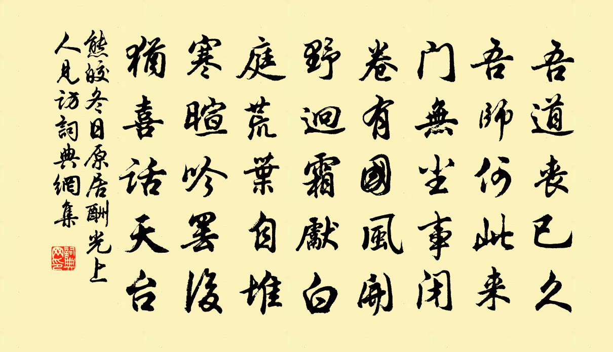 詩詞名句歷史字典書法欣賞書法字典國語詞典說文解字康熙字典古漢語字典標 題 作 者 詩 句 冬日原居酬光上人見訪作者:熊皎 朝代:唐代冬日原居酬光上人見訪原文吾道喪已久,吾師何此來。門無塵事閉,卷有國風開。野迥霜先白,庭荒葉自堆。寒暄吟罷後,猶喜話天台。詩詞問答問:冬日原居酬光上人見訪的作者是誰?答:熊皎問:冬日原居酬光上人見訪寫於哪個朝代?答:唐代問:冬日原居酬光上人見訪是什麼體裁?答:五律熊皎冬日原居酬光上人見訪書法欣賞冬日原居酬光上人見訪書法作品注釋全唐詩:卷737-20詩詞推薦謝人遺酥陳宓〔宋代〕廣寒春雪不能融,留得仙娥素手巾。白玉加香差可比,冰清乏潤遠難同。休將奼女塗丹臉,宜為儒生沃寸衷。多謝古石硯李山甫〔唐代〕追琢他山石,方圓一勺深。抱真唯守墨,求用每虛心。波浪因文起,塵埃為廢侵。憑君更研究,何啻直千金。南歸醉題家圃二首鄧肅〔宋代〕填海我如精衛,當車人笑螳螂。六合群黎有補,一身萬段何妨。遊學射山遇景道人陸游〔宋代〕肩輿適青郊,飛屐登翠麓。余霜未泫瓦,晨日初掛木。推門覓黃冠,避客似奔鹿。雖無與晤語,清坐意亦足。豈知句陳瓘〔宋代〕無金可寄東門傅,有齒能欺柱下蒼。次韻和康侍郎遊仙岩林季仲〔宋代〕林巒爭入馬蹄來,宿霧殘雲撥不開。石臥松根橫碧玉,瀑懸天外轉晴雷。仙家長鎖青春好,老子猶堪竟日陪。收拾賀樂丈先生南郭新居范成大〔宋代〕新堂燕雀喜,竹籬掛藤蘿。崩奔風濤里,得此巢龜荷。西山效爽氣,南浦供清波。會心不在遠,容膝何須多。先生句榮倪〔宋代〕多謝喧喧雀,時來破寂寥。入村方岳〔宋代〕閉門覓句每無悰,句在茅茨煙雨中。和煙和雨收拾取,等晴卻寫與東風。金縷詞/賀新郎石麟〔宋代〕欲上南樓壽。記當年、祥占玉燕。一陽生候。今數書雲猶七日,宮線未添刺繡。便草就、壽詞盈袖。合捧金荷稱鶴雉朝飛楊維楨〔元代〕雉朝飛,一雄挾一雌,雄死雌誓黃泥歸。衛女嫁齊子,未及夫與妻。青縭綰素結,一死與之齊。人言衛女盪且離,常祀五享三首真宗〔宋代〕奕奕清齋,昭穆定位。霜露增感,粢盛潔祭。神靈來格,福祉攸暨。追孝奉先,本支百世。送友人崔塗〔唐代〕登高迎送遠,春恨並依依。不得滄洲信,空看白鶴歸。聖人之孝十首孟子林同〔宋代〕如何年稍長,汲汲子思師。知是為兒日,三遷感母慈。句江萬里〔宋代〕不忍驟開還驟落,殷勤含蕊待君來。重贈星翁陳跛子艾性夫〔宋代〕拄拐蹣跚鬢雪明,向來小范亦分羹。十年不見疑先死,一旦相逢似再生。盡亂亦收詩卷上,長貧猶挾命書行。試言提壺蔡戡〔宋代〕斗酒千金未易沽,聲聲何事勸提壺。山禽豈解知人意,不道思家飯也無。支詩佚名〔先秦〕天之所支。不可壞也。其所壞亦不可支也。渭上送人南歸許棠〔唐代〕遠役與歸愁,同來渭水頭。南浮應到海,北去阻無州。楚雨天連地,胡風夏甚秋。江人如見問,為話復貧游。次韻鄭盱眙見寄並簡其甥劉君陸游〔宋代〕衣上空嗟京洛塵,故交半作白頭新。眾中初得見吾子,東觀已疑無若人。仗馬極知非久斥,沙鷗要是孰能馴?兩章名句推薦本分人,即是快活人,無奈做本分人者甚少。王永彬《圍爐夜話·第四則》 寒沙四面平,飛雪千里驚。范雲《效古詩》 梁園日暮亂飛鴉,極目蕭條三兩家。岑參《山房春事二首》 今日江頭兩三樹,可憐和葉度殘春。元稹《離思五首》 國之寶器,其在得賢。李大師、李延壽《北史·列傳·卷五十一》 楊柳千條送馬蹄,北來征雁舊南飛。納蘭性德《浣溪沙·楊柳千條送馬蹄》 石欄斜點筆,桐葉坐題詩杜甫《重過何氏五首》 借問漢宮誰得似,可憐飛燕倚新妝。李白《清平調·其二》 道雖邇,不行不至;事雖小,不為不成。荀子《荀子·修身》 何人解賞西湖好,佳景無時。歐陽修《採桑子·何人解賞西湖好》