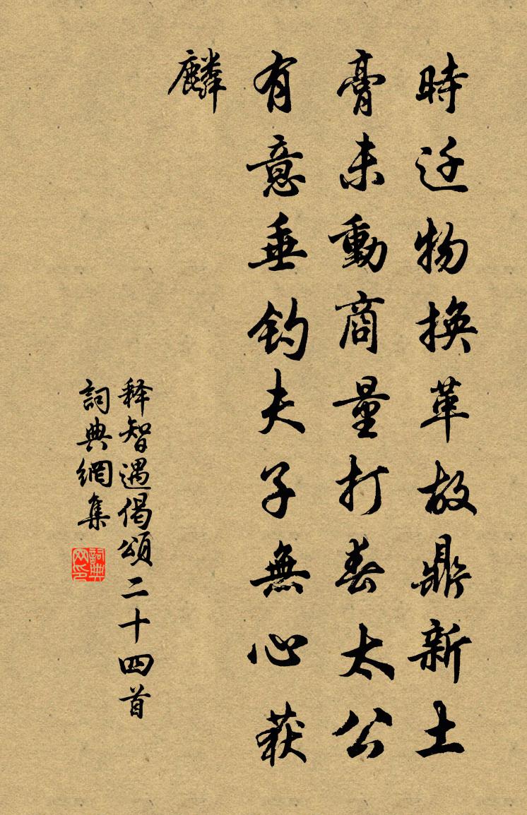 詩詞名句歷史字典書法欣賞書法字典國語詞典說文解字康熙字典古漢語字典標 題 作 者 詩 句 偈頌二十四首作者:釋智遇 朝代:宋代偈頌二十四首原文時遷物換,革故鼎新。土膏未動,商量打春。太公有意垂釣,夫子無心獲麟。詩詞問答問:偈頌二十四首的作者是誰?答:釋智遇問:偈頌二十四首寫於哪個朝代?答:宋代釋智遇偈頌二十四首書法欣賞偈頌二十四首書法作品詩詞推薦朝中措 寄雲中完顏公 永樂大典一萬四千三百耶律履〔元代〕何年仙節弭人寰。玉立紫雲間。氣吐虹霓千丈,辭源江漢翻瀾。金門大隱,管中誰見,位列清班。看取酒酣風味,示上元主簿釋心月〔宋代〕單提一字趙州無,三尺吹毛也不如。萬別千差齊斬斷,白雲不敢犯清虛。和汪仲嘉樓大防二尚書賀鄭貴和華文休致韻陳傅良〔宋代〕簪笏相摩入殿廬,人皆自笑此區區。豈無隻字踰華袞,未必千種勝飯蔬。君見北山多後倦,誰如東里竟先驅。追隨次韻楊明叔見餞十首黃庭堅〔宋代〕清靜草玄學,西京有子云。太尉死宗社,大鳥泣其墳。寂寞向千載,風流被仍昆。富貴何足道,聖處要策勛。秦州雜詩二十首·其十二杜甫〔唐代〕山頭南郭寺,水號北流泉。老樹空庭得,清渠一邑傳。秋花危石底,晚景臥鍾邊。俯仰悲身世,溪風為颯然。懷友人施樞〔宋代〕錦野重來已秀葽,雨肥梅杏粉痕銷。晚山四面子規叫,曉樹一聲婆餅焦。耐久交當如水淡,慣游身亦似蓬飄。老鶯盧行者偈宗澤〔宋代〕休問東西南北,莫說之乎者也。直饒神秀文□,不似老盧行者。點絳唇張掄〔宋代〕氣體沖融,四時長在陽春里。玉田瓊蕊。養就靈苗異。堪笑□□,□□□□□。□□□。□□流水。半落蒼□□。和野渡雪消二律衛宗武〔宋代〕雪晴吟弄句仍佳,滿紙鮫珠屢拜嘉。刻玉林林空楮葉,沾泥處處失楊花。消成滴瀝原歸舊,潤入根荄生有涯。賸洗入湧泉道中程師孟〔宋代〕因省先塋到故都,不妨閒步問耕天。水雲蒼莽遙連洞,田野低窪稍近湖。秋熟幾家收橘柚,日生眾口藉菰蒲。今朝書王定國所藏王晉卿畫著色山二首蘇軾〔宋代〕君歸嶺北初逢雪,我亦江南五見春。寄語風流王武子,三人俱是識山人。同宣卿和仲仲達游上封值雨百歸時上封辯病南胡寅〔宋代〕不到峰頭正一年,北游新客更超然。淨名不語元無病,惠遠同行定有緣。風雨不期相邂逅,雲山未許獨留連。歸途題請息齋六言范成大〔宋代〕洞門晝掛鐵鎖,閣道秋生綠苔。蓍下略同龜伏,瓜中且免蠅來。天香(龍涎香)周密〔宋代〕碧腦浮冰,紅薇染露,驪宮玉唾誰搗。麝月雙心,鳳雲百和,寶釧佩環爭巧。濃熏淺注,疑醉度、千花春曉。金餅寄顯道王安石〔宋代〕舟約刀頭止歲前,故人專使手書傳。出門江口問訊息,極目寒沙空渺然。北牆董羽水宋祁〔宋代〕萬疊雲濤墨海間,天機地軸共迴環。悠然便有滄溟意,況在靈鰲首冠山。再游用前韻一首王阮〔宋代〕十年不到此只園,又為支郎暫出村。犬認行蹤增踴躍,燕驚離恨苦埋冤。鬢邊但覺新絲長,壁上惟余舊墨存。但問和吳侍郎題賓應僧房白雞冠花宋庠〔宋代〕野卉秀禪庭,瑤華發素英。托根真不染,肖質似先鳴。露葉疑藏羽,煙蕤更作纓。何妨依忍草,休辯好丹名。春雪韓愈〔唐代〕看雪乘清旦,無人坐獨謠。拂花輕尚起,落地暖初銷。已訝陵歌扇,還來伴舞腰。灑篁留密節,著柳送長條。入鏡加頌蜀僧雪頌釋印肅〔宋代〕總是吾家入道門,無說說中聞不聞。步步透關田地穩,須彌{左足右孛}跳撞崑崙。名句推薦一條藤徑綠,萬點雪峰晴。李白《冬日歸舊山》 何處秋風至?蕭蕭送雁群。劉禹錫《秋風引》 相逢不飲空歸去,洞口桃花也笑人。佚名《增廣賢文·上集》 借問此何時?春風語流鶯。李白《春日醉起言志》 何日功成名遂了,還鄉,醉笑陪公三萬場。蘇軾《南鄉子·和楊元素時移守密州》 冷冷水向橋東去。漠漠雲歸溪上住。劉鎮《玉樓春·東山探梅》 雖然不如延年妹,亦是當時絕世人。李白《中山孺子妾歌》 軍合力不齊,躊躇而雁行。曹操《蒿里行》 勿自暴,勿自棄。聖與賢,可馴致。李毓秀《弟子規·餘力學文》 戀樹濕花飛不起,愁無比,和春付與東流水。朱服《漁家傲·小雨纖纖風細細》