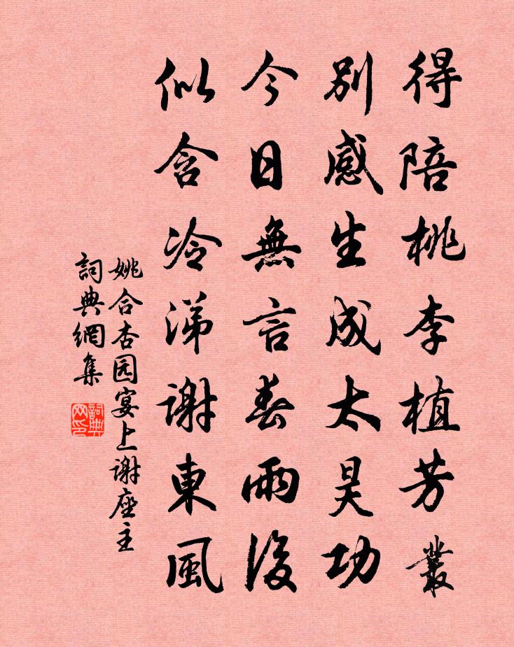 詩詞名句歷史字典書法欣賞書法字典國語詞典說文解字康熙字典古漢語字典標 題 作 者 詩 句 杏園宴上謝座主作者:姚合 朝代:唐代杏園宴上謝座主原文得陪桃李植芳叢,別感生成太昊功。今日無言春雨後,似含冷涕謝東風。詩詞問答問:杏園宴上謝座主的作者是誰?答:姚合問:杏園宴上謝座主寫於哪個朝代?答:唐代問:杏園宴上謝座主是什麼體裁?答:七絕姚合杏園宴上謝座主書法欣賞杏園宴上謝座主書法作品注釋全唐詩:卷501-46詩詞推薦引泉詩(睦州龍興觀老君院作)陸龜蒙〔唐代〕上嗣位六載,吾宗刺桐川。余來拜旌戟,詔下之明年。是時春三月,繞郭花蟬聯。嵐盤百萬髻,上插黃金鈿。授以秋思黃滔〔唐代〕碧嶂猿啼夜,新秋雨霽天。誰人愛明月,露坐洞庭船。次韻劉敷言新雁陳棣〔宋代〕倦飛聊復下江湖,此去衡陽萬里余。陣合魚麗司馬法,字排草聖右軍書。隨陽度塞身良苦,避繳銜蘆計已疏。一抹撫州被推昭雪答陸太祝三首戴叔倫〔唐代〕求理由來許便宜,漢朝龔遂不為疵。如今謗起翻成累,唯有新人子細知。貧交相愛果無疑,共向人間聽直詞。從古寄玉溪林逢吉六首戴復古〔宋代〕心腹相知會面稀,一春未有盍簪期。西窗風雨愁眠夜,夢到君家賦小詩。盤石林岊〔宋代〕捲菸閣西官道長,一水東注襟滄浪。山連踞虎岩如屋,棧接飛鸞石作梁。田野四時歌樂土,關何千里隔蠻鄉。我來遠意聯句皎然〔唐代〕家在炎州往朔方, ——疾(失姓)豈知于闐望瀟湘。 ——澄(失姓)曾經隴底復遼陽, ——巨川(失姓)更磨鏡陳耆卿〔宋代〕蠹蝕寧堪久,掛揩長恨遲。浮雲手底盡,明月眼中移。鑒垢渾能治,心塵不解醫。休雲磨者賤,此百主人師。【南呂】一枝花_詠莊宗行樂馬致遠〔元代〕詠莊宗行樂寵教坊荷葉杯,踏金頂蓮花爨;常忘了治國心,背記了《謁食酸》。鏡新磨無端,把李天下題名兒喚。晚晴便有春意鞏豐〔宋代〕風正波平可進橈,水光山影暮相交。殘陽欲去猶回首,一抹斜紅曳竹梢。端午帖子詞皇帝合汪應辰〔宋代〕躬行盛德基王化,密贊成謀授帝圖。福及萬方天所相,祛邪保假佩靈符。寒雨感懷呈斯遠三首趙蕃〔宋代〕少讀隱逸傳,雅意煙霞人。居官早自縛,半世幾沒身。青衫類枯葉,兩鬢如爛銀。人知趨走苦,己重疾病湮。歸微寄贈藍田韋少府先輩鄭谷〔唐代〕王畿第一縣,縣尉是詞人。館殿非初意,圖書是舊貧。斫冰泉竇響,賽雪廟松春。自此升通籍,清華日近身。酬方塘趙待制見贈汪元量〔宋代〕久謂儒冠誤,窮愁方棄書。十年心不展,萬里意何如。司馬歸無屋,馮驩出有車。吾曹猶未化,爛醉且窮廬。南樓登高陳杰〔宋代〕九日陰陰怯遠遨,南樓平壓騎台豪。輕颸吹帽何妨落,囂市登山易得高。烽火太平州送酒,檄書餘暇客題糕。歸來和寄仵判院八首趙希逢〔宋代〕便教老眼怎昏花,書債如何也不賒。更有一般春枕夢,合眸便到故人家。諭亡了姜特立〔宋代〕死固汝可憐,生亦我所愛。生死兩相繆,吾將解其會。及第謝恩徐元傑〔宋代〕聖朝天子薦臨軒,嘉與愚臣究本原。天地兩間拊景運,唐虞三代印微言。慙無一德酬清問,猥玷初班誤聖恩。一節己卯十月一日至燕越五日罹狴犴有感而賦文天祥〔宋代〕風前泣燈影,日下泣霜花。鍾信忽然動,屋陰俄又斜。悶中聊度歲,夢裡尚還家。地獄何須問,人間見夜叉。我思何所在李群玉〔唐代〕我思何所在,乃在陽台側。良宵相望時,空此明月色。歸魂泊湘雲,飄蕩去不得。覺來理舟楫,波浪春湖白。煙光名句推薦深宮桃李無人問,舊愛玉顏今自恨。元好問《玉樓春·驚沙獵獵風成陣》 仁義禮善之於人也,辟之若貨財粟米之於家也。荀子《荀子·大略》 路逢險處須迴避,事到臨頭不自由。佚名《增廣賢文·上集》 星點點,月團團。倒流河漢入杯盤。劉著《鷓鴣天·雪照山城玉指寒》 求之其本,經旬必得;求之其末,勞而無功。呂不韋《呂氏春秋·覽·孝行覽》 綠樹村邊合,青山郭外斜。孟浩然《過故人莊》 勤苦守恆業,始有數月糧。黃燮清《秋日田家雜詠》 應是天仙狂醉,亂把白雲揉碎。李白《清平樂·畫堂晨起》 十二闌乾,故國三千里。王庭筠《鳳棲梧·衰柳疏疏苔滿地》 因可勢,求易道。韓非及後人《韓非子·觀行》