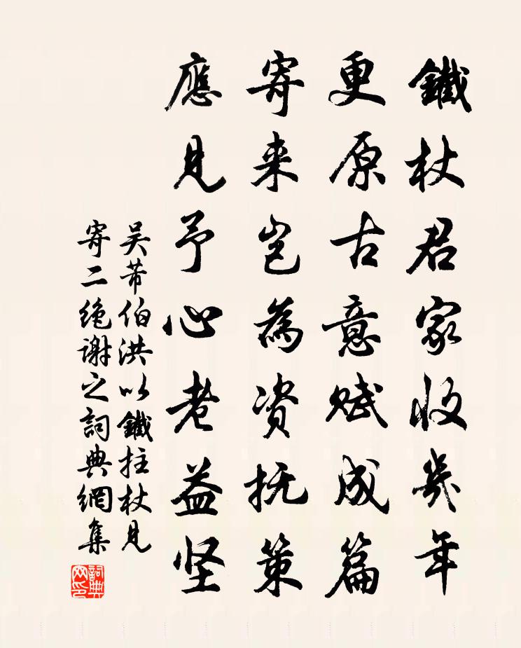 詩詞名句歷史字典書法欣賞書法字典國語詞典說文解字康熙字典古漢語字典標 題 作 者 詩 句 伯洪以鐵拄杖見寄二絕謝之作者:吳芾 朝代:宋代伯洪以鐵拄杖見寄二絕謝之原文鐵杖君家收幾年,更原古意賦成篇。寄來豈為資撫策,應見予心老益堅。詩詞問答問:伯洪以鐵拄杖見寄二絕謝之的作者是誰?答:吳芾問:伯洪以鐵拄杖見寄二絕謝之寫於哪個朝代?答:宋代吳芾伯洪以鐵拄杖見寄二絕謝之書法欣賞伯洪以鐵拄杖見寄二絕謝之書法作品詩詞推薦頌證道歌證道歌釋印肅〔宋代〕大悟不拘於小節,猛焰爐中撈霰雪。石頭垂足示長髭,修行有甚相交涉。偈頌七十六首釋師觀〔宋代〕唇上碧斑賓豹博,舌頭當的帝都丁。鴛鴦繡出從君看,不把金針度與人。菩薩蠻 飲山亭感舊劉因〔元代〕種花人去花應道。花枝正好人先老。一笑問花枝。花枝得幾時。人生行樂耳。今古都如此。急欲醉莓苔。前村酒未送龍詞邵普〔宋代〕四山迴環兮古龍湫,山木陰翳兮枝相樛。轟雷制電兮耀靈虬,膏澤滂霈兮歲有秋。怨王孫·湖上風來波浩渺李清照〔宋代〕湖上風來波浩渺,秋已暮、紅稀香少。水光山色與人親,說不勁無窮好。蓮子已成荷葉老,青露洗、苹花汀草。眠王晉卿得破墨三昧,又嘗聞祖師第一義,故畫蘇軾〔宋代〕前夢後夢真是一,彼幻此幻非有二。正好長松水石間,更憶前生後生事。題步生所居李復〔宋代〕君今移居澗水東,澗水暴漲侵近路。盡取澗石成垣牆,生鑿岸柳作橋柱。結茅構屋十數間,取次面勢分幾處。看山戀情深·玉殿春濃花爛熳毛文錫〔唐代〕玉殿春濃花爛熳,簇神仙伴。羅裙窣地縷黃金,奏清音。酒闌歌罷兩沉沉,一笑動君心。永願作鴛鴦伴,戀情深。雪中講堂賜酒二首楊萬里〔宋代〕袖手垂鞭出帝闉,萬花欄馬舞新春。是時也有青油繖,天上歸來雪滿身。朱叔止通判屢示詩詞綽有家法輒次年字韻一篇周必大〔宋代〕筆勢奔騰決大川,談鋒激烈敵丁年。花開共入長春苑,柯爛爭看不老仙。西笑君先聽漢履,上征我未拍洪肩。從今秋夜讀書示謙廖行之〔宋代〕百年詩種世科存,三載相望兩拜恩。主簿從渠稱大小,儒冠喜我到兒孫。立身正要先忠孝,力學尤須造本原。老矣送周正孺自考功郎中歸守梓潼兼簡呂元鈞三絕蘇轍〔宋代〕白髮熙寧老諍臣,凜然心膽大於身。吾儕坐看馮唐去,誰起雲中廢棄人。十年符竹守吾州,故吏相逢嘲土牛。毋謂白雪詞四首舒岳祥〔宋代〕半空紛下鶴,千尺矯游龍。再歌古人句,晴雪落長松。贈童道人蓋與予同甲子陸游〔宋代〕吾儕之生乙巳年,達者寥寥窮比肩。退士一生藜藿食,散人萬里江湖天。忍貧不變我自許,挾術自營君豈然?一事放言王禹偁〔宋代〕靜算人間事偶然,窮通未必在穹玄。關從白馬欺來度,赦被青蠅暗裡傳。禁樹罷吟紅爛漫,江蘺且詠綠芊綿。放言漢嗣唐彥謙〔唐代〕漢嗣安危係數君,高皇決意勢難分。張良口辨周昌吃,同建儲宮第一勛。祭方丘樂章順和褚亮〔唐代〕萬物資以化,交泰屬昇平。易從業惟簡,得一道斯寧。具儀光玉帛,送舞變鹹英。黍稷良非貴,明德信惟馨。慶元庚申華隱樓成其下明農堂新接牡丹亦盛開周必大〔宋代〕花接門園記洛川,明農堂畔識豐年。自量拾級身猶健,共約樓居意欲仙。倚檻聊舒千里目,舉頭應側萬人肩。那知寄盧少尹白居易〔唐代〕老誨心不亂,莊戒形太勞。生命既能保,死籍亦可逃。嘉肴與旨酒,信是腐腸膏。艷聲與麗色,真為伐性刀。補養月下笛姜夔〔宋代〕與客攜壺,梅花過了,夜來風雨。幽禽自語。啄香心,度牆去。春衣都是柔荑剪,尚沾惹、殘茸半縷。悵玉鈿似掃名句推薦回首天涯,一抹斜陽,數點寒鴉。張可久《折桂令·九日》 蚊蟲遭扇打,只因嘴傷人!佚名《增廣賢文·下集》 不見襄陽登覽,磨滅遊人無數,遺恨黯難收。陸游《水調歌頭·多景樓》 黑髮不知勤學早,轉眼便是白頭翁。佚名《增廣賢文·上集》 莫遣只輪歸海窟,仍留一箭射天山。李益《塞下曲》 故鄉今夜思千里,霜鬢明朝又一年。高適《除夜作》 雖慚老圃秋容淡,且看黃花晚節香。韓琦《九日水閣》 朝看水東流,暮看日西墜。錢福《明日歌》 天外鳳凰誰得髓?無人解合續弦膠。杜牧《讀韓杜集》 回頭流水小橋東,煙掃畫樓出。雷應春《好事近·梅片作團飛》