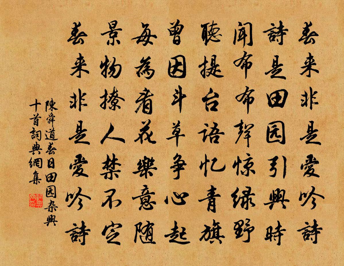 詩詞名句歷史字典書法欣賞書法字典國語詞典說文解字康熙字典古漢語字典標 題 作 者 詩 句 春日田園雜興十首作者:陳舜道 朝代:宋代春日田園雜興十首原文春來非是愛吟詩,詩是田園引興時。聞布布聲驚綠野,聽提台語憶青旗。曾因鬥草爭心起,每為看花樂意隨。景物撩人禁不定,春來非是愛吟詩。詩詞問答問:春日田園雜興十首的作者是誰?答:陳舜道問:春日田園雜興十首寫於哪個朝代?答:宋代陳舜道春日田園雜興十首書法欣賞春日田園雜興十首書法作品詩詞推薦葛洪丹灶釋清外〔宋代〕羽客昔眷此,煉液奪化功。至今寒雲色。掛樹復凝空。少年問白居易〔唐代〕少年怪我問如何,何事朝朝醉復歌?號作樂天應不錯,憂愁時少樂時多。題鄭氏北墅趙蕃〔宋代〕籃輿度浮梁,朝嵐尚蒙蒙。十有九日雨,得晴類投空。游岩既原適,訪隱亦好從。道傍得野舍,一逕幽且能。主人太常引姬翼〔元代〕情知萬事轉頭空。穎脫出樊籠。飲啄且從容。更不問、三山五峰。一丸丹藥,一枝藜杖,來往任西東。隨處雲朋。雜劇·金水橋陳琳抱妝盒佚名〔元代〕楔子(沖末扮殿頭官領校尉上,詩云)君起早,臣起早,來到朝門天未曉。長安多少富誼家,不識明星直到老。某約劉學錄同潘喻二丈集滄洲陳宓〔宋代〕一年擬待中秋夕,連日頻聞正午雷。天若有心開玉匣,月應無恨入金罍。素娥與我元無分,秀句憑君試為催。取出游東山二詠次李丞相韻榴花谷張元乾〔宋代〕公如謝傳暫閒身,我亦歸來效季真。山屐數陪銷暇日,詩篇常許和陽春。虛懷寄傲三休外,洗眼旁觀萬態新。谷口東歸留別幕中同舍孫應時〔宋代〕陳侯七閩秀,六年客西州。蘭荃自芳潔,應世良優遊。平生耐久朋,政復未易求。相期故不淺,抗節追前修。李審言遺酒梅堯臣〔宋代〕大梁美酒斗千錢,欲飲常被飢窘煎。經時一滴不入口,漱齒費盡華池泉。昨日靈昌兵吏至,跪壺曾不候報箋。赤泥浣溪沙·題李中齋舟中梅屏吳文英〔宋代〕冰骨清寒瘦一枝。玉人初上木蘭時。懶妝斜立澹春姿。月落溪窮清影在,日長春去畫簾垂。五湖水色掩西施。送長兒盤赴金陵典斛吳泳〔宋代〕援以書戒子,子竟不若翁。陶以詩責兒,兒只如頑童。房公豈不智,集此書屏風。堂基未及{左扌右勾},手澤俱次韻子由所居六詠蘇軾〔宋代〕堂前種山丹,錯落馬腦盤。堂後種秋菊,碎金收辟寒。草木如有情,慰此芳歲闌。幽人正獨樂,不知行路難。詩人寄上大兄(已後詩在邽林居作)白居易〔唐代〕秋鴻過盡無書信,病戴紗巾強出門。獨上荒台東北望,日西愁立到黃昏。千秋歲李之儀〔宋代〕休嗟磨折,看取羅巾血。殷勤且話經年別。庭花番悵望,檐雨同嗚咽。明半滅,燈光夜夜多如月。無復傷離別,共滿庭芳楊 * 〔宋代〕春過圍林,雨餘池沼,嫩荷點點青圓。晝長人靜,芳樹欲生煙。一徑幽通遂竹,松風漱、石齒濺濺。平生志,功名暗香張炎〔宋代〕羽音遼邈。怪四檐晝悄,近來無鵲。木葉吹寒,極目凝思倚江閣。不信相如便老,猶未減、當時遊樂。但趁他、斗桂江曹松〔唐代〕未識佳人尋桂水,水雲先解傍壺觴。筍林次第添斑竹,雛鳥參差護錦囊。乳洞此時連越井,石樓何日到仙鄉。如飛偈公六十五首釋鹹傑〔宋代〕持缽去,持缽歸。草鞋根斷通訊息,玲瓏八面盡光輝。游魔宮,入虎穴。當機撞著惡聱頭,直教心地頓休歇。送李文若歸修水並吊其兄商老之亡王銍〔宋代〕子去何淒斷,鄉關歲月新,荒山寒帶雨,古驛夜無人。生死風前燭,音容夢裹身。臨分感平昔,揮淚到松筠。秋蝶二首羅鄴〔唐代〕秦樓花發時,秦女笑相隨。及到秋風日,飛來欲問誰。似厭棲寒菊,翩翩占晚陽。愁人如見此,應下淚千行。名句推薦何事春風容不得?和鶯吹折數枝花。王禹偁《春居雜興·兩株桃杏映籬斜》 燕子欲歸時節,高樓昨夜西風。晏殊《破陣子·燕子欲歸時節》 正是天山雪下時,送君走馬歸京師。岑參《天山雪歌送蕭治歸京》 可堪更近乾龍節,眼中淚盡空啼血向子諲《秦樓月·芳菲歇》 以三寸之舌,彊於百萬之師。司馬遷《史記·平原君虞卿列傳》 遙知湖上一樽酒,能憶天涯萬里人。歐陽修《春日西湖寄謝法曹歌》 簾外雨潺潺,春意闌珊。李煜《浪淘沙令·簾外雨潺潺》 西登香爐峰,南見瀑布水。李白《望廬山瀑布水二首》 來日綺窗前,寒梅著花未。王維《雜詩三首 / 雜詠三首》 偏借其權勢,則上下易位矣,此言人臣之不可借權勢。韓非及後人《韓非子·備內》