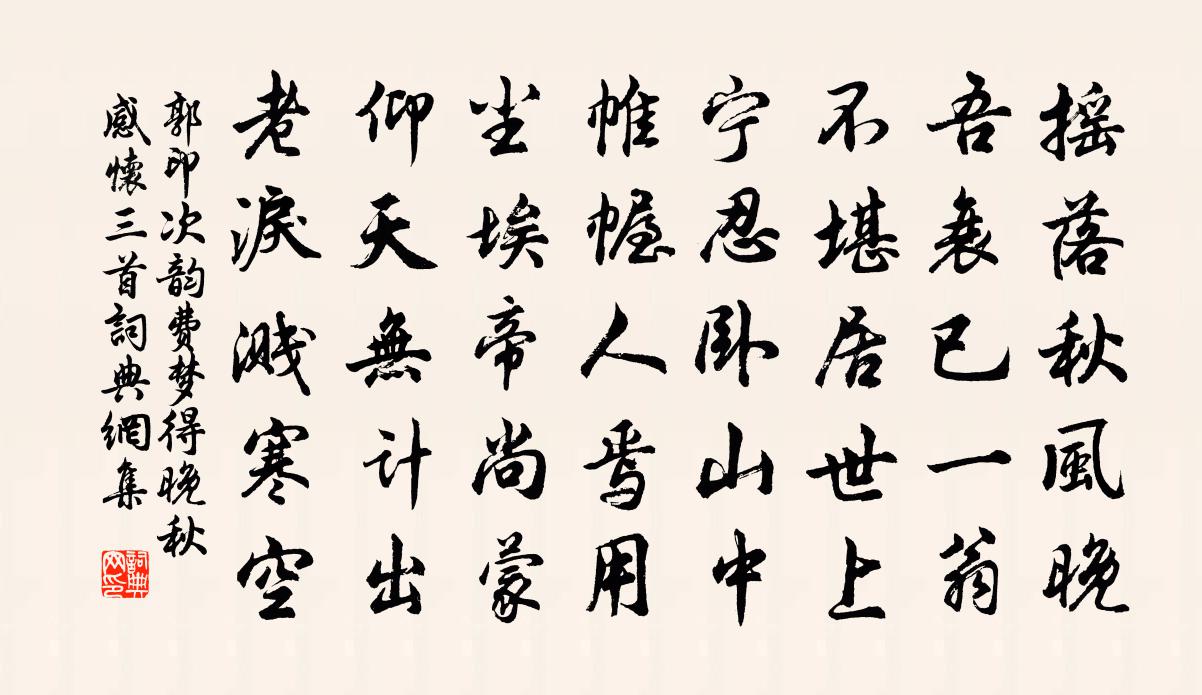 詩詞名句歷史字典書法欣賞書法字典國語詞典說文解字康熙字典古漢語字典標 題 作 者 詩 句 次韻費夢得晚秋感懷三首作者:郭印 朝代:宋代次韻費夢得晚秋感懷三首原文搖落秋風晚,吾衰已一翁。不堪居世上,寧忍臥山中。帷幄人焉用,塵埃帝尚蒙。仰天無計出,老淚濺寒空。詩詞問答問:次韻費夢得晚秋感懷三首的作者是誰?答:郭印問:次韻費夢得晚秋感懷三首寫於哪個朝代?答:宋代郭印次韻費夢得晚秋感懷三首書法欣賞次韻費夢得晚秋感懷三首書法作品詩詞推薦玉丁謂〔宋代〕誰負連城美,須思韞櫝藏。輝山知稟異,被褐喻韜光。呂釣時終至,虞求禍是防。寧為田父棄,莫作楚人傷。正月十日作宋庠〔宋代〕偶隨和氣上層台,河裡風煙已暗開。空說虎牢天地險,不知春色過關來。木蘭花令黃庭堅〔宋代〕庾郎三九常安樂。使有萬錢無處著。徐熙小鴨水邊花,明月清風都占卻。朱顏老盡心如昨。萬事休休休莫莫。樽前長乾寺同劉宮苑浴張舜民〔宋代〕人看浴出如枯木,我自無心類死灰。在處秋風吹鬢髮,不堪更上雨花台。送衛清叔著作提舉淮東樓鑰〔宋代〕虎榜先登到鳳池,前良多以十年期。雖知勇退急流去,壯歲功名會及時。減字木蘭花(許侍郎奕碩人生日十二月二十二日)魏了翁〔宋代〕新符舊曆。交割新年餘七日。誰識春華。元住東川太守家。一年一曲。擬盡形容無可祝。願似庭梅。長向春風伴斗從舅氏李公擇將抵京輔以歸江南初自淮之西猶黃庭堅〔宋代〕歸心搖搖若秋帶,哀操切切如蟬吟。百年雙鬢欲俱白,千里一書真萬金。秋思寇準〔宋代〕秋氣動天地,恍然情未窮。故園應墜葉,昨夜又西風。白草侵危堞,寒濤接遠空。搘頤當此景,無語夕陽中。題劉武翼息齋曾豐〔宋代〕天地一從開闢始,左旋右圍長不已。詰所以然氣使之,君獨不為氣所使。平生由氣今自由,三平二滿過即休。千里連夜書方回〔宋代〕獨倚西樓夜漸深,下弦月欲近觜參。立秋是日微微雨,病暑衰翁稍慰心。西林寺董嗣杲〔宋代〕地分連寺樹,逕掩隔牆苔。破屋無僧住,深秋有客來。號猿歸禿樹,飢鳥立香台。恝永當年塔,陰雲撥不開。諸君和篇摩壘致師不容閉壁再繹前韻鄭清之〔宋代〕平生周伯仁,耿耿空洞腹。翛然猿鶴姿,豈辨鳩鷹目。僕射不解事,居士偶題木。種柳僅成五,樂園祗可獨。皓首社日喜晴分韻得前字劉學箕〔宋代〕夜來急雨淙飛檐,脫驚紅日輝潭川。梨花有情朝露重,柳帶無力春風顛。傍簾新燕低拂涼,入檻戲蝶相聊翩。今晨春宵有感八首白玉蟾〔宋代〕春夜常如歲,何妨秉燭嬉。百花俱中酒,萬竹自吟詩。仆有書五千卷藏明恩山房亂後倖存胡山甫寄一舒岳祥〔宋代〕歲久殘僧屋,吾書故不塵。持經入深竹,分韻與閒人。花氣聞慈像,松涼施四隣。細思貧最好,懷璧每壯身。學士院入直賦景物二首王希呂〔宋代〕小池倒影弄餘輝,照耀虛檐極出奇。木杪不鳴風力軟,闖萍翻藻有魚嬉。鳳凰台戴復古〔宋代〕登臨舍老眼,弔古得淒涼。故國自龍虎,高台無鳳凰。浮雲多改變,喬木見興亡。往事渾休問,鐘山又夕陽。挽武龍蹇巡檢陽枋〔宋代〕仁者壽宜得,王臣忠可嘉。功名是有約,雲月自為家。義粟飢中糶,茲梁雨後斜。百年回首處,溪冷欲梅花。霜天曉角 此下原有促拍滿路花西風吹渭水一佚名〔宋代〕世事促促。莫勞心役役。棄塵早歸林下,蓋個低低茅屋。映窗疏竹。灑灑風生玉。萬疊青山為友,那管桑田翻覆。秋思陸游〔宋代〕看雲廬阜屏風疊,采樂嵩山冠子峰。行盡四方心未快,不如一棹醉吳松。名句推薦三教於是乎可一矣。王通《中說·卷五·問易篇》 失之毫釐,差以千里。班固《漢書·傳·東方朔傳》 不聞爺娘喚女聲,但聞黃河流水鳴濺濺。佚名《木蘭詩 / 木蘭辭》 我行殊未已,何日復歸來。宋之問《題大庾嶺北驛》 銀燭秋光冷畫屏,輕羅小扇撲流螢。杜牧《秋夕》 夜寒不近流蘇,只憐他、後庭梅瘦。毛滂《上林春令·十一月三十日見雪》 記得去年今夕,釃酒溪亭,淡月雲來去。文徵明《念奴嬌·中秋對月》 呼童烹雞酌白酒,兒女嬉笑牽人衣。李白《南陵別兒童入京》 漢家天子今神武,不肯和親歸去來。王之渙《涼州詞二首》 勝而不驕,敗而不怨。商鞅《商君書·戰法》