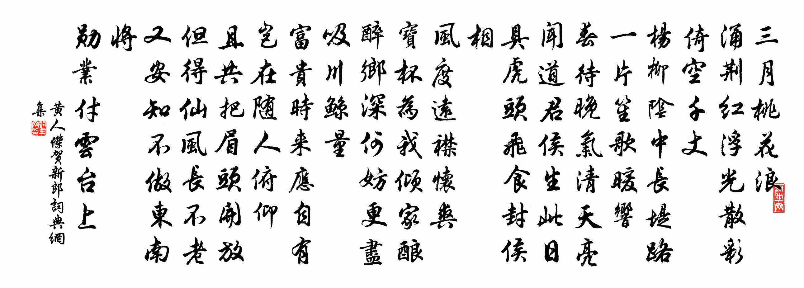 詩詞名句歷史字典書法欣賞書法字典國語詞典說文解字康熙字典古漢語字典標 題 作 者 詩 句 賀新郎作者:黃人傑 朝代:宋代賀新郎原文三月桃花浪。涌荊紅、浮光散彩,倚空千丈。楊柳陰中長堤路,一片笙歌暖響。春待晚、氣清天亮。聞道君侯生此日,具虎頭、飛食封侯相。風度遠,襟懷爽。寶杯為我傾家釀。醉鄉深,何妨更盡,吸川鯨量。富貴時來應自有,豈在隨人俯仰。且共把、眉頭開放。但得仙風長不老,又安知、不做東南將。勳業付,雲台上。詩詞問答問:賀新郎的作者是誰?答:黃人傑問:賀新郎寫於哪個朝代?答:宋代問:賀新郎是什麼體裁?答:詞黃人傑賀新郎書法欣賞賀新郎書法作品詩詞推薦詠績溪道中牡丹二種絲頭粉紅楊萬里〔宋代〕看盡徽蘇譜與園,牡丹未見冬粉君。春羅淺染醋紅色,王板蹙成裙摺紋。頭重醉余扶不起,肌香淑處澹仍芬。老夫次林卿檳榔韻二首劉克莊〔宋代〕錦衣旋剖苞中實,梔面俄回鏡里春。始信中華禁酒國,不如南粵主林神。金盤惟送渠矜貴,糟罋酣釀子任真。赤腳崔司錄宅燕大理李卿高適〔唐代〕多雨殊未已,秋雲更沉沉。洛陽故人初解印,山東小吏來相尋。上卿才大名不朽,早朝至尊暮求友。豁達常推海內題不欺室張魏公為王龜齡書也何子應賦詩王秬〔宋代〕君不見開元名相張九齡,歲寒松柏森蒼鱗。胡塵澒洞言始末驗,世間回首思忠臣。堂堂魏公忠貫日,志欲平戎獎王靖通菴白玉蟾〔宋代〕靖通菴外鎖晴雲,壁瑩飛瓊瓦疊鱗。野鳥無心一聲曉,岩花有意四時春。鑿開風月長生地,占斷煙霞不老身。虛靖公無渡河徐集孫〔宋代〕公無渡河,公無渡河,公必欲渡意如何。波濤洶湧何足畏,中原未復一身多。爭知平地有風波,人心之險險於河。偈頌二十四首釋智遇〔宋代〕勤儉樸起家,叢林麟鳳。入門一見,和氣可掬,知心不在頻叮囑。禪人寫真求贊釋正覺〔宋代〕畫工出脫它,精神較得些。草不萌,藏香象。匣無縫,吼青蛇。春雷開眾蟄,暖律發千華。想是平江人見笑,去年次韻魯山新居絕句陸游〔宋代〕短牆缺處插疏籬,巷劣容車堂對陂。天下有公殊可賀,坐中著我不妨奇。吹笛兒李中〔唐代〕隴頭休聽月明中,妙竹嘉音際會逢。見爾樽前吹一曲,令人重憶許雲封。劉仙岩呂願中〔宋代〕平明小隊出郊墟,盡日登臨據隼旟。聞道仙人屍解去,尚應猶學世間書。和襲美重題後池陸龜蒙〔唐代〕曉煙清露暗相和,浴雁浮鷗意緒多。卻是陳王詞賦錯,枉將心事托微波。代舊將賈島〔唐代〕舊事說如夢,誰當信老夫。戰場幾處在,部曲一人無。落日收病馬,晴天曬陣圖。猶希聖朝用,自鑷白髭鬚。雪後寄謝濟公、材翁聯騎來訪,進退格楊萬里〔宋代〕封胡連璧雨中來,目送皈鞍悵獨回。隱几讀書寒入骨,開門落雪皓平階。急尋火閣溫雙手,自喚兒郎共一杯。念汝古漁父詞十二首王銍〔宋代〕虞舜遺風遠可尋,煙波一棹古猶今。九疑蒼莽三湘闊,儘是雲山韶濩音。望蓬萊王哲〔元代〕聽我勸,公莫謾風流。猿馬不閒空踐野,光陰虛過度春秋。怎得免荒丘。如省悟,急急把心收。對景直須拋亡想,奉和御製郊外觀稼寇準〔宋代〕天苑清塵宿雨收,翠華觀稼慶盈疇。氣和玉燭成豐歲,露冷金莖凜素秋。日麗鮮原平杳杳,煙含嘉穀郁油油。共知東園張耒〔宋代〕浮雲蔽亭午,白日成蕭森。余涼入坐隅,蕭灑散煩襟。孟夏愛吾屋,秀木成佳陰。眾果頗已成,永日鳴山禽。杖履雪作陳元晉〔宋代〕簾卷虛堂曉,兒童笑語嘩。恍疑開月窟,渾是散天花。竹里聞清響,江邊看玉槎。訪梅好興去,著屐過鄰家。滿江紅(和徐叔至御帶)侯置〔宋代〕重到西湖,春拆信、露花酥滴。倚危欄、湖山佳處,短屏著色。擬泛一舟蒼莽岸,恐傷萬里羈遊客。賴款門、修竹名句推薦怒髮衝冠,憑欄處、瀟瀟雨歇。岳飛《滿江紅·寫懷》 世間行樂亦如此,古來萬事東流水。李白《夢遊天姥吟留別 / 別東魯諸公》 滿招損,謙受益佚名《尚書·虞書·大禹謨》 瀑布風前千尺影,疑瀉銀河一派。朱栴《念奴嬌·雪霽夜月中登樓望賀蘭山作》 百王之無變,足以為道貫。一廢一起,應之以貫,理貫不亂。不知貫,不知應變。荀子《荀子·天論》 前不見古人,後不見來者。陳子昂《登幽州台歌》 漢甲連胡兵,沙塵暗雲海。李白《經亂離後天恩流夜郎憶舊遊書懷贈江夏韋太守良宰》 嗟險阻,嘆飄零。關山萬里作雄行。劉克莊《玉樓春·戲林推》 畢竟年年用著來,何似休歸去。如晦《楚天遙過清江引·有意送春歸》 銅壺漏報天將曉,惆悵佳期又一年。羅隱《七夕》