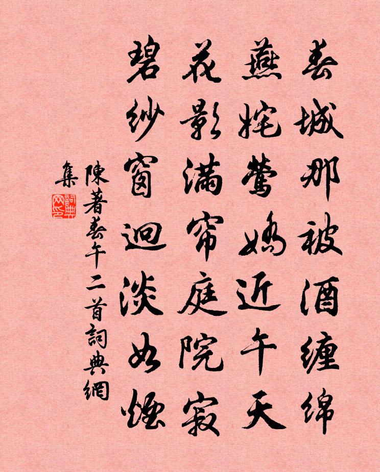 詩詞名句歷史字典書法欣賞書法字典國語詞典說文解字康熙字典古漢語字典標 題 作 者 詩 句 春午二首作者:陳著 朝代:宋代春午二首原文春城那被酒纏1|1綿,燕奼鶯嬌近午天。花影滿簾庭院寂,碧紗窗迥淡如煙。詩詞問答問:春午二首的作者是誰?答:陳著問:春午二首寫於哪個朝代?答:宋代陳著春午二首書法欣賞春午二首書法作品詩詞推薦人日代客子是日立春張繼〔唐代〕人日兼春日,長懷復短懷。遙知雙彩勝,並在一金釵。雜劇·凍蘇秦衣錦還鄉佚名〔元代〕楔子(沖末扮孛老同搽旦、卜兒、淨蘇大、大旦、二旦上)(孛老雲)錢會說話,米會搖擺。無米無錢,失光落彩句林逋〔宋代〕已作歸心即自寬。朝中措王之道〔宋代〕老窮無賴事成叢。短髮自髼鬆。坐想帝城當日,萬花繡出天宮。幾時臨賦,深浮綠蟻,緩唱黃鍾。莫獲追陪勝賞,過福禪師蘭若王維〔唐代〕岩壑轉微徑,雲林隱法堂。羽人飛奏樂,天女跪焚香。竹外峰偏曙,藤 * 更涼。欲知禪坐久,行路長春芳。子夜歌南朝民歌〔南北朝〕高山種芙蓉,復經黃檗塢。果得一蓮時,流離嬰辛苦。贈李守李洪〔宋代〕宗袞英名歷搢紳,傳家濟美不無人。采詩於蒍承親擢,樂職中和著牧民。鳳入潁川宜卜相,梅開東閣趁班春。九重重陽日獨居洨水君俞出遊杜曲惠詩酬以來韻李復〔宋代〕眾人有錢競沽酒,嗟我獨醒坐搔首。荒徑蓬蒿深映門,茅舍三間傍疏柳。南山奔騰呼欲來,雲散山容一笑開。何似春居雜興王禹偁〔宋代〕一夜春雷百蟄空,山家籬落起蛇蟲。無端蚯蚓爭頭角,觸破莓苔氣似虹。和於秘丞見召之什釋重顯〔宋代〕民瘼求來吏放閒,萬家深夜啟重關。齋中既是清涼國,應笑支公別買山。永嘉勸農歸舟中吳泳〔宋代〕使君每愛讀豳詩,稼事艱難亦粗知。水凍未聞身布野,年飢且喜麥生岐。坐間白叟真堪貴,眼底朱衣總是痴。趁刺春日夫人閣羅公升〔宋代〕君王著意在經帷,無復瓊林宴賞時。從此六宮休鬥草,碧紗窗下讀毛詩。臨江仙佚名〔宋代〕花影半簾初睡起,繡鞋著罷慵移。窺妝強把綠窗推。隔花雙蝶散,猶似夢初回。纖指彈甌呼女伴,出簾那共徘徊。偈頌一百四十一首釋師範〔宋代〕貍奴白牯,相共證明,大難大難。碧眼黃頭,亦須莽鹵。黃連甜,甘草苦,發機須千鈞弩。過元家履信宅白居易〔唐代〕雞犬喪家分散後,林園失主寂寥時。落花不語空辭樹,流水無情自入池。風盪宴船初破漏,雨淋歌閣欲傾欹。前庭奉和家大人將赴官舍留示及門之作孫應時〔宋代〕大學成功在九年,根牢乾長到參天。斯須廢棄終身困,稂莠從來易滿田。朝中措(艮翁生日)劉克莊〔宋代〕仙風道骨北山翁。萬卷著胸中。渙若宦情冰釋,作□醉面桃紅。千林凍槁,一枝雪艷,訊息先通。顏色□青精飯,從事中郎張彥明為中護軍奚世都為汲郡太守客陸雲〔魏晉〕思文有聖。叡哲配天。功濟生黎。道合上玄。休命發揮。有集惟賢。哲彼寤宿。澄此在淵。望夫詞二首施肩吾〔唐代〕看看北雁又南飛,薄倖征夫久不歸。蟢子到頭無信處,凡經幾度上人衣。何事經年斷書信,愁聞遠客說風波。西家海棠花王安石〔宋代〕綠嬌隱約眉輕掃,紅嫩妖饒臉薄妝。巧筆寫傳功未盡,清才吟詠興何長。名句推薦橫看成嶺側成峰,遠近高低各不同。蘇軾《題西林壁》 憶共人人睡魂蝶亂,夢鸞孤。趙長卿《更漏子·燭消紅》 白日麗飛甍,參差皆可見。謝朓《晚登三山還望京邑》 更可惜,雪中高樹,香篝熏素被。周邦彥《花犯·小石梅花》 槲葉落山路,枳花明驛牆。溫庭筠《商山早行》 試問閒愁都幾許?賀鑄《青玉案·凌波不過橫塘路》 風塵荏苒音書絕,關塞蕭條行路難。杜甫《宿府》 誠者,天之道也;思誠者,人之道也。孟子《孟子·離婁章句上·第十二節》 寒食後,酒醒卻咨嗟。蘇軾《望江南·超然台作》 漸老多憂百事忙,天寒日短更心傷。李覯《秋晚悲懷》