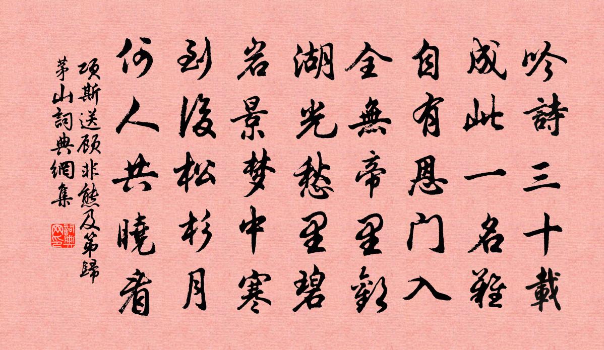 詩詞名句歷史字典書法欣賞書法字典國語詞典說文解字康熙字典古漢語字典標 題 作 者 詩 句 送顧非熊及第歸茅山作者:項斯 朝代:唐代送顧非熊及第歸茅山原文吟詩三十載,成此一名難。自有恩門入,全無帝里歡。湖光愁里碧,岩景夢中寒。到後松杉月,何人共曉看。詩詞問答問:送顧非熊及第歸茅山的作者是誰?答:項斯問:送顧非熊及第歸茅山寫於哪個朝代?答:唐代問:送顧非熊及第歸茅山是什麼體裁?答:五律項斯送顧非熊及第歸茅山書法欣賞送顧非熊及第歸茅山書法作品注釋全唐詩:卷554-70詩詞推薦紹興朝會十三首佚名〔宋代〕帝坐熒煌,延紳肅穆。對揚天休,各恭爾服。頌聲洋洋,彌文鬱郁。禮備樂成,永膺多福。訴衷情(因見早梅作)丘崈〔宋代〕十分風味似詩人。有些子太清生。只應最嫌俗子,消瘦卻盈盈。風乍靜,雪初晴。月微明。泊然疏淡,莫是無情,老病杜甫〔唐代〕老病巫山里,稽留楚客中。藥殘他日裹,花發去年叢。夜足沾沙雨,春多逆水風。合分雙賜筆,猶作一飄蓬。述懷二首宗澤〔宋代〕黃屋肇新巍巍。四方豪傑雲來。片言之悞天也,一見而決時哉。甲子語溪閔雨四首黃榦〔宋代〕檣頭五兩搖空飛,船頭百丈牽何遲。數篙塘水清可涉,故鄉千里歸何時。贈太慰呂惠穆公輓詞王珪〔唐代〕秦川歸騎照山紅,不覺悲簫起暮風。天上紫樞深北斗,人間金印獨三公。漢庭樽俎奇謀在,隴首旌旂殺氣空。見說滿庭芳許有壬〔元代〕槐院風清,蘚階塵淨,日長鎮掩衡門。葛帷藤簟,石枕竹夫人。不作南柯痴夢,要來往、月窟天根。花陰轉,閒關江口有懷二首白玉蟾〔宋代〕丹楓偷落風無覺,白鷺微行魚不知。兩地南樓今夜月,一般清皎百般思。岳州贈廣平公宋大夫張說〔唐代〕亞相本時英,歸來復國楨。朝推長孺直,野慕隱之清。傳節還閩嶂,皇華入漢京。寧思江上老,歲晏獨無成。又送道者王法圓作丐王之道〔宋代〕誓將三寸舌,求結萬人緣。寶剎成功日,當期道法圓。頌十玄談演教釋印肅〔宋代〕初說有空人盡執,未明理事虛勞力。念來年久轉 * ,心不負人徒面赤。送友人周賀〔唐代〕彈琴多去情,浮楫背潮行。人望豐壖宿,蟲依蠹木鳴。檣煙離浦色,蘆雨入船聲。如疾登雲路,憑君寄此生。項居士輓詞林季仲〔宋代〕老友從初歲,溫恭見隱居。誰雲不為政,只此是知書。末俗惟多偽,何人得似渠。春江照丹旐,恨亦到龜魚。聞禽獻詠舒岳祥〔宋代〕郭公莓熟郭公語,謝豹花開謝豹啼。萬斛愁消一樽酒,莊生物理底須齊。寄九峰覺老時自因勝退居王銍〔宋代〕京江別我正堅冰,拂袖歸來道更增。又見嶺梅來驛使,懶將庭柏對談們。半廓冷月溪山霧,一炷幽香殿閣燈。此亦宮詞百首和凝〔唐代〕紫燎光銷大駕歸,御樓初見赭黃衣。千聲鼓定將宣赦,竿上金雞翅欲飛。北闕晴分五鳳樓,嵩山秀色護神州。洛河寓京口四首答湯菊莊兼簡分司鄭料院鶻山武衍〔宋代〕屹然孤石蘚痕青,千古江湍洗不平。蒼鶻飛來復飛去,不知身為此山名。和鄭季南喜雪陽枋〔宋代〕木火盈爐破夜闌,茅庵烘暖覺身安。驕兒鼾寢僮眠卻,些子天真不奈歡。謝觀文理尚書惠西京牡丹歐陽修〔宋代〕京師輕薄兒,意氣多豪俠。爭夸朱顏年少,肯慰白髮將花插。尚書好事與俗殊,憐我霜毛苦蕭颯。贈以洛陽花滿盤醉落魄/一斛珠毛並〔宋代〕暮寒淒冽。春風探繞南枝發。更無人處增清絕。冷蕊孤香,竹外朦朧月。西洲昨夢憑誰說。攀翻剩憶經年別。新愁名句推薦野客預知農事好,三冬瑞雪未全消。戴復古《除夜》 小知不可使謀事,小忠不可使主法。韓非及後人《韓非子·飾邪》 種田不熟不如荒,養兒不肖不如無。馮夢龍《醒世恆言·卷十七》 幸非一人,專固害。來俊臣《羅織經·治下卷第三》 久雨寒蟬少,空山落葉深。秘演《山中》 昨夜狂風度,吹折江頭樹李白《長干行二首》 此路無知己,明珠莫暗投。高適《送魏八》 太乙近天都,連山接海隅王維《終南山》 樂聞過,罔不興;拒諫,罔不亂。宋祁、歐陽修、范鎮、呂夏卿等《新唐書·列傳·卷四十三》 最愛東山晴後雪,軟紅光里涌銀山。楊萬里《最愛東山晴後雪》