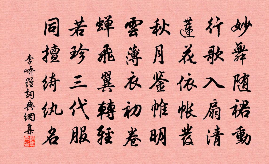 詩詞名句歷史字典書法欣賞書法字典國語詞典說文解字康熙字典古漢語字典標 題 作 者 詩 句 羅作者:李嶠 朝代:唐代羅原文妙舞隨裙動,行歌入扇清。蓮花依帳發,秋月鑒帷明。雲薄衣初卷,蟬飛翼轉輕。若珍三代服,同擅綺紈名。詩詞問答問:羅的作者是誰?答:李嶠問:羅寫於哪個朝代?答:唐代問:羅是什麼體裁?答:五律李嶠羅書法欣賞羅書法作品注釋全唐詩:卷60_7詩詞推薦搗練子沈瀛〔宋代〕放下著,須彌山。分明北斗面南看。沒絲毫,相阻攔。休儱侗,莫顢頇。含元殿上問長安。欲歸家,行路難。次韻二首劉克莊〔宋代〕老懶尤於筆硯疏,難陪騎省賦閒居。去周柱下誰為史,傳鄴侯家尚有書。台饋不煩公粟肉,戶租難辦客車魚。側旁病起別主人李群玉〔唐代〕益愧千金少,情將一飯殊。恨無泉客淚,盡泣感恩珠。路中問程知欲達青雲驛雍陶〔唐代〕行愁驛路問來人,西去經過願一聞。落日回鞭相指點,前程從此是青雲。戲和答禽語黃庭堅〔宋代〕南村北村雨一犁,新婦餉姑翁哺兒。田中啼鳥自四時,催人脫袴著新衣。著新替舊亦不惡,去年租重無袴著。為徐叔剛賦達齋張煒〔宋代〕男兒勁正氣,期谷展經綸。場屋求程藝,山林多隱人。學優宜必仕,道在不妨貧。快舉摩霄翮,聯翩立要津。偈頌二十四首釋智遇〔宋代〕人間無,天上有,往往無人脫窠臼。四海娟娟洗玉魂,九野茫茫白兔走。寒山子,不關口,也落馬駒群隊後。觀博平王志安少府山水粉圖李白〔唐代〕粉壁為空天,丹青狀江海。游雲不知歸,日見白鷗在。博平真人王志安,沉吟至此願掛冠。松溪石磴帶秋色,愁客次韻十一叔芍藥五絕杜范〔宋代〕寒暑回還日日新,數枝留得幾多春。君能彈壓憑佳句,一段清襟亦可人。偈頌一百零二首釋紹曇〔宋代〕西子湖邊泛渺茫,一堤寒綠看垂楊。誰知業債難逃避,開眼堂堂入鑊湯。金牛洞周文璞〔宋代〕凌兢下危梯,俯傴生深穴。回身避雲霧,偃面視日月。藥苗護谽谺,竹節截嶭嶭。安知幽蹊下,有此大奇絕。金牛挽胡季昭用王盧溪韻羅疸〔宋代〕百世期令固本支,一身寧復許安危。前瞻象郡賢方去,後有鶴山人效奇。地接宜陽山谷笑,舟回湘水屈原知。櫝中謝彥修攜具見過胡寅〔宋代〕識字深慚揚子云,載醪何以塞殷勤。山騰海浪兼天碧,雨薦秋聲映燭聞。秘藏未能窺佛界,劇談聊足張吾軍。浮蛆荔子歌劉子翬〔宋代〕炎精孕秀多靈植。荔子佳名聞自昔。絳囊剖雪出琱盤,尋常百果無顏色。閩天六月雨初晴,星火熒煌曜川澤。欻如題梅山雲悅樓羅永之〔宋代〕曾讀楊詩識懶雲,只今雲悅即雲孫。龍無怒色常歸匣,鶴有懽顏獨守門。春態樂尋吟客伴,心閒喜共野人言。要知八音詩權德輿〔唐代〕金谷盛繁華,涼台列簪組。石崇留客醉,綠珠當座舞。絲淚可銷骨,冶容竟何補。竹林諒賢人,滿酌無所苦。匏居幽趣十二首鄭剛中〔宋代〕幽趣無人會,須還我獨親。開書風為揭,得睡懶相因。雨後竹色淨,月中梅意貞。北山小園景,莫怨未歸人。小重山 述夢王哲〔元代〕夢見街前一隻牛。偏能行得穩,性溫柔。繩來牽拽便回頭。高峰上,臥月最風流。隨我任遨遊。調和真逸樂,沒憂句戴衢〔唐代〕坐落千門日,吟殘午夜燈。陳粹中再約重陽之集即不果赴以詩寄這二首王洋〔宋代〕酒熟招期勝士開,錦溪詞伯是仙才。衰顏野老無酬對,若有新詩卻寄來。名句推薦日往菲薇,月來扶疏。左思《三都賦》 砌下落梅如雪亂,拂了一身還滿。李煜《清平樂·別來春半》 夫萬事萬物之理,不外於吾心。王陽明《傳習錄·卷中·答顧東橋書》 泥融飛燕子,沙暖睡鴛鴦。杜甫《絕句二首》 花明柳暗繞天愁,上盡重城更上樓。李商隱《夕陽樓》 人無剛骨,安身不牢。施耐庵《水滸傳·第二十四回》 犯刑若履虎,不畏落爪牙。李白《秦女休行》 朝真暮偽何人辨,古往今來底事無。白居易《放言五首·其一》 勝人者有力,自勝者強。老子《老子·道經·第三十三章》 功遂身退,天之道老子《老子·道經·第九章》
