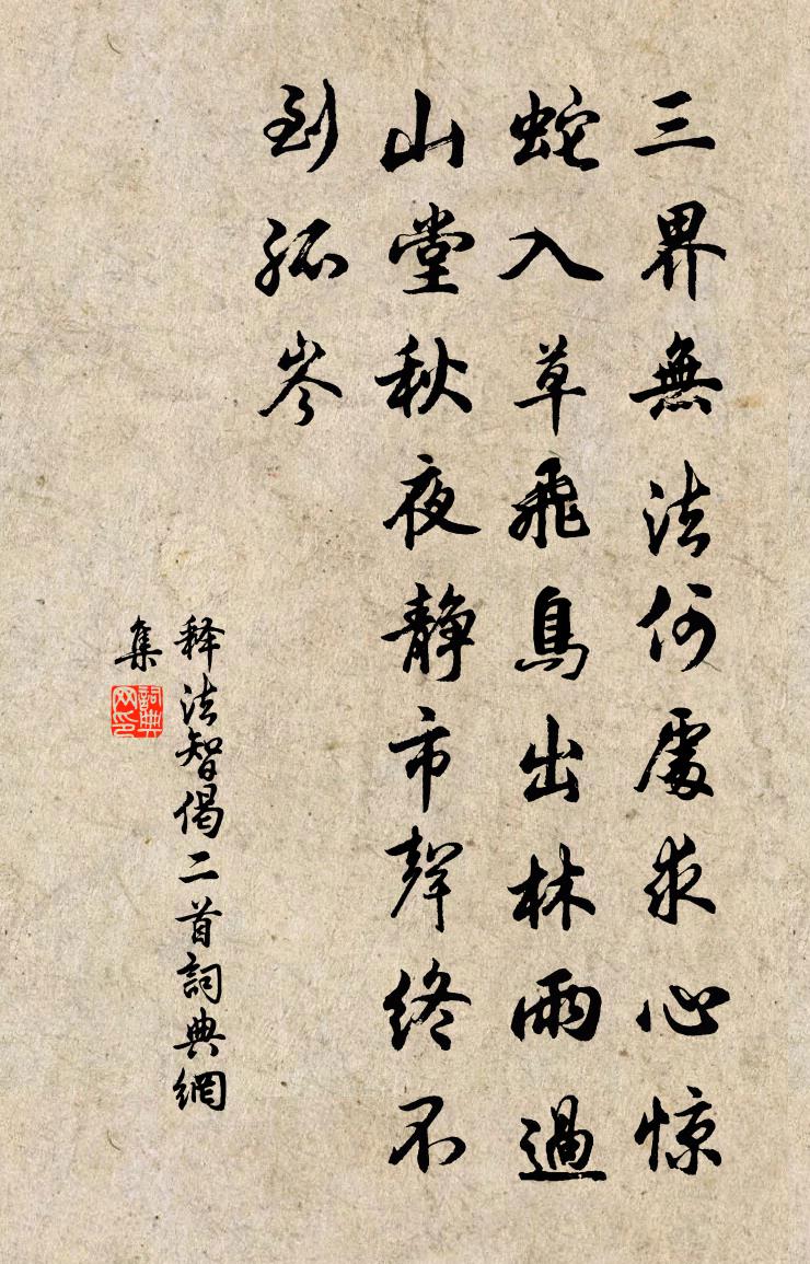 詩詞名句歷史字典書法欣賞書法字典國語詞典說文解字康熙字典古漢語字典標 題 作 者 詩 句 偈二首作者:釋法智 朝代:宋代偈二首原文三界無法,何處求心。驚蛇入草,飛鳥出林。雨過山堂秋夜靜,市聲終不到孤岑。詩詞問答問:偈二首的作者是誰?答:釋法智問:偈二首寫於哪個朝代?答:宋代釋法智偈二首書法欣賞偈二首書法作品詩詞推薦故鄉除夜周弘亮〔唐代〕三百六十日雲終,故鄉還與異鄉同。非唯律變情堪恨,抑亦才疏命未通。何處夜歌銷臘酒,誰家高燭候春風。詩成涼州詞王翰〔唐代〕秦中花鳥已應闌,塞外風沙猶自寒。夜聽胡笳折楊柳,教人意氣憶長安。過柘溪得西字劉黻〔宋代〕晴雨春無定,東風忽轉西。地肥桑眼大,天暖麥須齊。食頓尋幽所,舟行畏惡溪。野禽如避客,飛上半山啼。宿路北李廌〔宋代〕晚日明青嶂,春風送馬蹄。數朝秦嶺北,今夜洛陽西。禁水綠波滿,蕪城碧草齊。客心歸更速,解轡恨棲雞。宮詞王珪〔唐代〕瑣聲金制閱門環,簾卷真珠十二間。別殿春風呼萬歲,中丞新押散朝班。和三兄立冬祠太乙二首韓維〔宋代〕樓外蘭班曉斗垂,霜晴宮瓦濕琉璃。珠幢羽節嚴仙杖,桂酒椒漿潔祠儀。寒氣導迎通律管,神光飛動屬壇壝。定聞三月三十日前人有詩云共君今夜不須睡未到曉郭印〔宋代〕風雨年年橫,鶯花處處殘。衰顏隨節變,幽興與春闌。俗眼從渠白,孤衷只自丹。平生知任運,那復較暄寒。廟下候風呈同行孔武仲〔宋代〕楚水千百源,洞庭為壯觀。勢居七澤右,地裂荊吳半。而我泛扁舟,飄然一歸雁。來之豈為益,去赤未足算。胡不葉濤致遠見和二詩複次其韻(濤顛倒元韻。)蘇軾〔宋代〕平生無一女,誰復嘆耳耳。滯留生此兒,足慰周南史。那知非真實,造物聊戲爾。煩惱初無根,恩愛為種子。煩公和人憶鶴韓常侍〔唐代〕拂拂雲衣冠紫煙,已為丁令一千年。留君且伴居山客,幸有松梢明月天。立夏明日行園無客五首方回〔宋代〕愛栽竹樹愛栽花,新築船軒傍石斜。古廟炷香知某客,半山搖扇望吾家。閒看紅袖穿林去,可著冰紈作畫夸。說似靈山觀金燈吳龍翰〔宋代〕嵯峨靈金山,峭壁偕天長。巑屼萬蒼翠,無復敢頡頏。登臨勞遠目,久羈塵俗韁。天風送筇屐,此願今一償。所喜昨日趙蕃〔宋代〕昨日張帆著翼飛,今朝風送蹇驢騎。吳淞山水夙所愛,得意還教多賦詩。大暑久不請謁登南樓望成父西庵慨然奉思因成李彌遜〔宋代〕南郭子綦隱,西郊杜老居。風流如異代,臭味本吾廬。高閣深繙貝,虛堂靜散書。經旬想顏色,著雨問何如。再歸松溪舊居宿西林徐凝〔唐代〕五粒松深溪水清,眾山搖落月偏明。西林靜夜重來宿,暗記人家犬吠聲。佛郎國進天馬歌楊維楨〔元代〕龍德中,元氣昌,天王一統開八荒。十又一葉治久長,前年白雉來越裳。中國聖明日重光,仁聲極沓動嘉祥。烏桓對酒吟王禹偁〔宋代〕勸君莫把青銅照,一瞬浮生何足道。 * 又采東海桑,閬苑宮中養蠶老。任是唐虞與姬孔,蕭蕭寒草埋孤冢。我恐如夢令劉辰翁〔宋代〕落葉西風滿地。獨宿瓊樓丹桂。孤影抱蟾寒,寄與月明千里。休寄。休寄。粟粟蕊珠心碎。戲答史應之三首黃庭堅〔宋代〕老萊有婦懷高義,不厭夫家苜蓿盤。收得千金不龜藥,短裙漂絖暮江寒。雨中花/夜行船蘇泂〔宋代〕十載尊前,放歌起舞,人間酒戶詩流。盡期君凌厲,羽翮高秋。世事幾如人意,儒冠還負身謀。嘆天生李廣,才氣名句推薦愁雲淡淡雨瀟瀟。暮暮復朝朝。石孝友《眼兒媚·愁雲淡淡雨蕭蕭》 石澗凍波聲,雞叫清寒晨。李賀《自昌谷到洛後門》 處事要代人作想,讀書須切己用功。王永彬《圍爐夜話·第五則》 民之無良,相怨一方,受爵不讓,至於己斯亡。荀子《荀子·儒效》 卻愁宴罷青娥散,揚子江頭月半斜。韋莊《陪金陵府相中堂夜宴》 廄馬散連山,軍容威絕域。李白《君子有所思行》 積土成山,風雨興焉;荀子《勸學》 水何澹澹,山島竦峙曹操《觀滄海》 洛陽城東桃李花,飛來飛去落誰家?劉希夷《代悲白頭翁 / 白頭吟 / 有所思》 縱使文章驚海內,紙上蒼生而已。龔自珍《金縷曲·癸酉秋出都述懷有賦》
