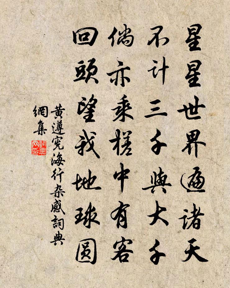 詩詞名句歷史字典書法欣賞書法字典國語詞典說文解字康熙字典古漢語字典標 題 作 者 詩 句 海行雜感作者:黃遵憲 朝代:清代海行雜感原文星星世界遍諸天,不計三千與大千。倘亦乘槎中有客,回頭望我地球圓。詩詞問答問:海行雜感的作者是誰?答:黃遵憲問:海行雜感寫於哪個朝代?答:清代問:海行雜感是什麼體裁?答:七絕黃遵憲海行雜感書法欣賞海行雜感書法作品詩詞推薦同游公玉伯氏季氏游水陸院濯纓閣以清斯濯纓李流謙〔宋代〕積雨泥斷道,扶筇將何之。愁蹲寡情味,竄壁如蠅痴。朝暾惠新晴,仟風起衰萎。振衣欲有詣,扣扉適相期。百步初夏即事十二解楊萬里〔宋代〕檻中紅藥趁春歸,瓶里苛留三兩枝。一片落來能戀我,葉梢閣住不教飛。和十一月十二日與諸君登西園亭榭懷舊書事二梅堯臣〔宋代〕莎徑依然見莎葉,蓮塘無復有蓮花。更看白水滿城下,說著當時龍骨車。題畫仇遠〔宋代〕紛紛雞鶩一冥鴻,全放全收旦暮同。各為稻粱飛不起,偶然相聚小池中。秋夜喜遇王處士王績〔唐代〕北場芸藿罷,東皋刈黍歸。相逢秋月滿,更值夜螢飛。呆物三首賈似道〔宋代〕飛蟲能鬭體輕盈,拔翅成瘡鬭負疼。可用剪刀裁內翅,自然百戰百番贏。即事張嵲〔宋代〕屐齒休令破紫苔,柴門無客不須開。雨余籬菊埋光去,木落前山獻體來。代意劉筠〔宋代〕華池阿閣不相容,濁水清塵恨莫窮。明月自新班女扇,行雲無柰楚王風。乳鶯啼曉銷蘭炷,媚蝶傷春失蕙叢。縱使禽言梟羅公升〔宋代〕人誰獨無母,汝母良可悲。汝飽詎幾乎,亦有生子時。喜雨陸游〔宋代〕雨聲蕭蕭集庭樹,雨氣森森入窗戶。玉川茆屋久不葺,破漏無復施床處。我於萬事本悠悠,危坐讀書忘百憂。明朝恭和御製玉津園宴射曾懷〔宋代〕名園佳氣靄非煙,冠佩朝宗似百川。五品並令陪宴射,四鍭端欲序賓賢。恩涵春意魚翻藻,威入秋聲雁落弦。竣事送高麗二僧南遊齊己〔唐代〕日邊鄉井別年深,中國靈蹤欲遍尋。何處碧山逢長老,分明認取祖師心。夢後得宋中道書梅堯臣〔宋代〕宵夢宋子語,晝得宋子書。書意與夢語,曾不異往初。昔我遭家難,逢子亦在廬。我南君大梁,千里非隔疏。念處秋懷陸游〔宋代〕星斗闌乾河漢流,建州風物更禁秋。年來多病題詩嬾,付與鳴蛩替說愁。次韻雲岩許月卿〔宋代〕權輿於我屋渠渠,久敬如君世莫如。明月清風詩滿案,好天良夜酒連車。樽前遠韻輕盈菊,醉後分題爛慢書。凡此平時兄弟間十三章四句送定叟弟之官桂林張栻〔宋代〕嗚呼忠獻公,典則垂後裔。遺言故在耳,夕陽當自厲。夜坐獨酌陸游〔宋代〕玉宇沉沉夜向闌,跨空飛閣倚高寒。一壼清露來雲表,聊為幽人洗肺肝。題王季安主簿佚老堂二首楊萬里〔宋代〕造物那能惱我曹,軟紅塵里漫徒勞。是中卻有商量處,且道青原幾許高。晨炊浦村楊萬里〔宋代〕水出何村尾,橋橫亂筱叢。隔溪三四屋,對面一雙峰。過午非常暖,疑他不是冬。疏梅照清淺,作意為誰容?離合州驛晚宿茆城驛李流謙〔宋代〕稍喜川原豁,遙看草樹明。惡灘猶夢怖,平地始身輕。場圃收遺秉,溝塍勸早耕。得歸萬事好,漂泊豈人情。名句推薦但去莫復問,白雲無盡時。王維《送別》 燕子重來,往事東流去。吳文英《點絳唇·時霎清明》 情知已被山遮斷,頻倚闌乾不自由。辛棄疾《鷓鴣天·晚日寒鴉一片愁》 坑灰未冷山東亂,劉項原來不讀書。章碣《焚書坑》 浮雲遊子意,落日故人情。李白《送友人》 此時卻羨閒人醉,五馬無由入酒家。白居易《早冬》 此處不留人,自有留人處。馮夢龍《喻世明言·卷三》 一自胡塵入漢關,十年伊洛路漫漫。陳與義《詠牡丹》 別來半歲音書絕,一寸離腸千萬結。韋莊《應天長·別來半歲音書絕》 尋常百種花齊發,偏摘梨花與白人。元稹《離思五首》