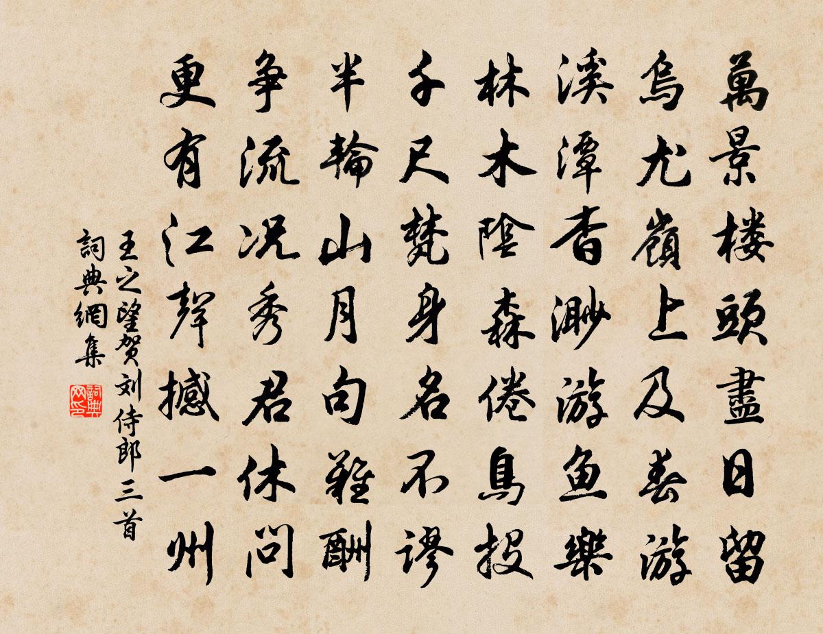 詩詞名句歷史字典書法欣賞書法字典國語詞典說文解字康熙字典古漢語字典標 題 作 者 詩 句 賀劉侍郎三首作者:王之望 朝代:宋代賀劉侍郎三首原文萬景樓頭盡日留,烏尤嶺上及春遊。溪潭杳渺游魚樂,林木陰森倦鳥投。千尺梵身名不謬,半輪山月句難酬。爭流況秀君休問,更有江聲撼一州。詩詞問答問:賀劉侍郎三首的作者是誰?答:王之望問:賀劉侍郎三首寫於哪個朝代?答:宋代王之望賀劉侍郎三首書法欣賞賀劉侍郎三首書法作品詩詞推薦盛山十二詩隱月岫韋處厚〔唐代〕初映鉤如線,終銜鏡似鉤。遠澄秋水色,高倚曉河流。和警齋侍郎二首劉克莊〔宋代〕家傳豈有枕中方,敢向堯朝議大章。難入高賢真率社,且尋童子釣游鄉。有西疇事咨衡宇,無北山移誚草堂。獨恨七娘子黃大臨〔宋代〕畫堂銀燭明如晝。見林宗、巾墊羞蓬首。針指花枝,線賒羅袖。須臾兩帶還依舊。勸君倒戴休令後。也不須、更漉送閻少隱同其弟伯子宣子赴試淮南為一月之別仲並〔宋代〕二難晚出材無敵,老將從來勇冠軍。一月望公三捷至,秋風不惜暫離群。水調歌頭 寄洪大參馬需庵〔元代〕關山渺無際,何處認三韓。遼陽煙樹千里,回首路漫漫。暫屈元龍湖海,坐鎮東方雅俗,心與野雲閒。姓字九天上李伯時畫十古圖鄭尚明作詩詩辭多振絕因為同劉子翬〔宋代〕胡床二女執市裾,長揖高陽舊酒徒。不是蒼皇能輟洗,溺冠何異昔坑儒。讀陸雲西志供定城墓有感書呈子勉總乾三首釋道璨〔宋代〕一艇東來公已仙,午天花柳為誰妍。深培根本存生意,把握春風有阿連。曉登燕公樓陳與義〔宋代〕欄乾納清曉,拄杖追黃鵠。燕公不相待,使我立於獨。霧收天落川,日動春浮木。舉手謝時人,微風吹野服。慈聖光獻皇太后輓詞二首曾鞏〔宋代〕山河德履孚潛顯,江漢仁風被邇遐。已輔乾坤成化育,終符日月繼光華。和熹朱寤還威柄,明德猶疏抑外家。欲次遣興二首張嵲〔宋代〕人生何必論才良,賢否窮通脫未量。運否較龍猶蠖屈,時來鳥雀亦鷹揚。王侯螻蟻同歸盡,鐘鼎山林各所藏。何用或以詩送來禽次韻奉酬陳傅良〔宋代〕連年栽樹未成陰,赬實堆盤慰我心。手把新詩堪永日,休夸法帖送來禽。王詵都尉寶繪堂詞蘇轍〔宋代〕侯家玉食繡羅裳,彈絲吹竹喧洞房。哀歌妙舞奉清觴,白日一醉萬事忘。百年將種存慨慷,西取庸蜀踐戎羌。戰袍代書答朝中舊友邵雍〔宋代〕少日治文章,亦曾觀國光。山林雖不返,畎畝未嘗忘。麋鹿寧無志,鵷鴻自有行。還知今日事,大故索思量。御閣端午帖子夏竦〔宋代〕仙園採藥回彫輦,禁殿迎祥啟鳳闈。四海樂康民富壽,穆清無事永垂衣。賀新郎王千秋〔宋代〕短艇橫煙渚。夢驚回、淒涼尚記,緣蓑鳴雨。拍塞愁懷人不解,只有黃鸝能語。復擬待、乘槎重去。無奈東君剛留和胡公謹游李寺丞北園韓維〔宋代〕春郊不數到,俯爺恨流景。李侯有嘉招,滯念茲一聘。名園帶喬樹,亭榭散清影。解我塵中衣,觴行日舒永。花團浣溪沙(八之一)鄧肅〔宋代〕雨入空階滴夜長。月行雲外借孤光。獨將心事步長廊。深鎖重門飛不去,巫山何日夢襄王。一床衾枕冷淒香。題金山寺許棠〔唐代〕四面波濤匝,中樓日月鄰。上窮如出世,下瞷忽驚神。剎礙長空鳥,船通外國人。房房皆疊石,風掃永無塵。劍舞史浩〔宋代〕聲之融曳,思舞態之飄颻。爰有仙童,能開寶匣。佩干將莫邪之利器,擅龍泉秋水之嘉名。鼓三尺之瑩瑩,雲間閃叔父給事輓詞十首黃庭堅〔宋代〕三晉山河數十州,頻年水旱不能秋。我公出把司農節,粟麥還於地上流。名句推薦年年郡縣送征人,將與遼東作丘坂。王建《遼東行》 目送征鴻飛杳杳,思隨流水去茫茫。孫光憲《浣溪沙·蓼岸風多橘柚香》 白馬金羈遼海東,羅帷繡被臥春風。李白《春怨》 喃喃教言語,一一刷毛衣。白居易《燕詩示劉叟》 湖上春既早,田家日不閒。丘為《題農父廬舍》 大堤欲上誰相伴,馬踏春泥半是花。竇鞏《襄陽寒食寄宇文籍》 中人以上,可以語上也;中人以下,不可以語上也。孔子弟子《論語·雍也篇》 湖闊兼雲霧,樓孤屬晚晴。杜甫《陪裴使君登岳陽樓》 恐是仙家好別離,故教迢遞作佳期。李商隱《辛未七夕》 竹里繰絲挑網車,青蟬獨噪日光斜。李賀《南園十三首》