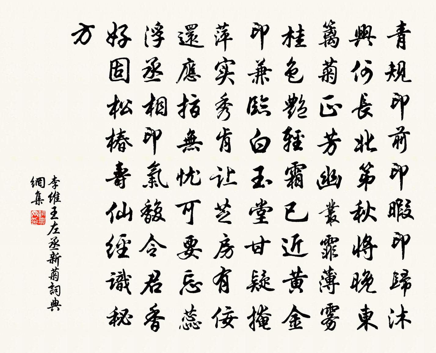 詩詞名句歷史字典書法欣賞書法字典國語詞典說文解字康熙字典古漢語字典標 題 作 者 詩 句 王左丞新菊作者:李維 朝代:宋代王左丞新菊原文青規印前印暇,印歸沐興何長。北第秋將晚,東籬菊正芳。幽叢霏薄霧,桂色艷輕霜。已近黃金印,兼臨白玉堂。甘疑掩萍實,秀肯讓芝房。有佞還應指,無憂可要忘。蕊浮丞相印,氣馥令君香。好固松椿壽,仙經識秘方。詩詞問答問:王左丞新菊的作者是誰?答:李維問:王左丞新菊寫於哪個朝代?答:宋代李維王左丞新菊書法欣賞王左丞新菊書法作品詩詞推薦緣識宋太宗〔宋代〕紫檀金線槽偏蹙,撥弄朱弦敲冰玉。指法從來天下聞,翻成盡入昇平曲。傳之世上五音足,希夷道聽化民俗。盤龍人日出遊湖上十首楊萬里〔宋代〕城中雪一尺,山中雪一丈。地上都巳消,卻在松梢上。田父吟五首葉茵〔宋代〕桃花深映水邊莊,夫婦相攜笑語香。耕耨有糧蠶有種,丁男戽水婦要桑。紹興祀九宮貴神十首佚名〔宋代〕[姑洗為羽]練時吉良,聿崇明祀。粢盛潔豈,牲碩酒旨。肅唱和聲,來燕來止。嘉承天休,麥及含齒。贈方山人二首吳芾〔宋代〕故山久已辦菟裘,得去欣聞止在秋。涉世安能長戚戚,收心只欲罷休休。宿姚合宅寄張司業籍賈島〔唐代〕閒宵因集會,柱史話先生。身愛無一事,心期往四明。松枝影搖動,石磬響寒清。誰伴南齋宿,月高霜滿城。次季和宿龍泉寺遇雪韻孫應符〔宋代〕同人如提宿,初從城市歸。雪輕渾欲舞,雲棟不成飛。客去尋溪棹,僧來叩竹扉。籬邊一枝玉,漏匯化丁機。合路馬坊,年年四月殿前諸軍牧馬於此,十月楊萬里〔宋代〕地迥湖寬春草酥,年年此地牧天馰。玉花驄里龍歸去,金粟堆前鳥自呼。苑廄尚虛三萬柱,柳林集得許多烏。即今連雪不已復作絕句詠之及六而止殆未免不愁凍趙蕃〔宋代〕不假丹青手,居成水墨圖。莫嗟玄尚白,靡嘆糞難污。柳噪竹楊億〔宋代〕好在碧壇灣,叢底度歲寒。何堪栽鳳律,祇好製魚竿。拂水煙稍潤,含風劍葉攢。芳蔭聊奉庇,君試仰天看。次韻牟監薄方岳〔宋代〕秋聲滿院有誰來,亦欲從君話老懷。隔竹已敲茶臼雪,不知何日又清齋。句歐陽鈇〔宋代〕夢回千里外,燈轉一窗深。和毛生瑞香胡寅〔宋代〕久雨妨園涉,奇芬待客吹。今朝搴翠幄,晴日麗繁枝。一一花相簇,翩翩蝶未知。薰篝蒙紫錦,香過每輕披。喜文潛自淮南歸招飲西岡呈坐客晁補之〔宋代〕春回三楚冰生漪,銀台春夢歸心馳。莫言上水百丈苦,淮渚東風一月期。都城經春雪蔽地,百花不放須君至。清晨經筵講詩徹章進詩樓鑰〔宋代〕聖主承丕祚,於今歲幾遷。昭回光飾物,剛健位乘乾。善治新更化,當陽獨攬權。誅鉏及共鯀,擢任列閎顛。曩日感皇恩(元夕後二日,同彥敬郎中飲洪宣慰山園紅梅下,得感皇恩二關)張侃〔宋代〕住處記曾游,十年重到。罨畫湖山最春早。紅梅幾樹,一夜東風開了。矮松脩竹外,依然好。玉色醺酣,香團嬌小題昭應溫泉孫叔向〔唐代〕一道溫泉繞御樓,先皇曾向此中游。雖然水是無情物,也到宮前咽不流。贈王山人白居易〔唐代〕玉芝觀里王居士,服氣餐霞善養身。夜後不聞龜喘息,秋來唯長鶴精神。容顏盡怪長如故,名姓多疑不是真。貴重聲聲慢(殘夢和兒韻)趙功可〔宋代〕情痴倦極,天闊歸遲,吟魂無力隨風。月落牆陰,一屏睡睫濛濛。邯鄲平生難記,記花前、猶醉金鍾。留連處,忽秋日游南汰二首王之道〔宋代〕松篁團野色,葭薍接江氛。芳菊開新雨,晴天掃片雲。村醪過寺共,風袂轉山分。邂逅梅夫子,清談得致勤。名句推薦四牡何時入,吾君憶履聲。張九齡《奉和聖制送尚書燕國公赴朔方》 望千門如晝,嬉笑遊冶。周邦彥《解語花·上元》 君看六幅南朝事,老木寒雲滿故城。韋莊《金陵圖》 一番桃李花開盡,惟有青青草色齊。曾鞏《城南·雨過橫塘水滿堤》 前庭一葉下, 言念忽悲秋。敬括《省試七月流火》 仁者愛萬物而智者備禍於未形,不仁不智,何以為國?司馬遷《史記·趙世家》 竹影和詩瘦,梅花入夢香。王庭筠《絕句·竹影和詩瘦》 古人不見今時月,今月曾經照古人。佚名《增廣賢文·上集》 金槳木蘭船,戲采江南蓮。劉孝威《採蓮曲·金槳木蘭船》 少婦今春意,良人昨夜情。沈佺期《雜詩三首·其三》