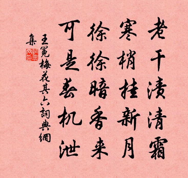 詩詞名句歷史字典書法欣賞書法字典國語詞典說文解字康熙字典古漢語字典標 題 作 者 詩 句 梅花 其六作者:王冕 朝代:元代梅花 其六原文老乾漬清霜,寒梢掛新月。徐徐暗香來,可是春機泄?詩詞問答問:梅花 其六的作者是誰?答:王冕問:梅花 其六寫於哪個朝代?答:元代問:梅花 其六是什麼體裁?答:五絕問:王冕的名句有哪些?答:王冕名句大全王冕梅花 其六書法欣賞梅花 其六書法作品詩詞推薦雷杜甫〔唐代〕巫峽中宵動,滄江十月雷。龍蛇不成蟄,天地劃爭回。卻碾空山過,深蟠絕壁來。何須妒雲雨,霹靂楚王台。送曹子方福建轉運判官二首一晁補之〔宋代〕談經草檄鬢華生,初擁閩山傳節行。江入桐廬青欲斷,溪從劍浦碧來迎。茶雖戶種租宜薄,鹽不家煎價欲平。要使次韻賈文學見贈李石〔宋代〕方舟不似逆風船,船上燒香穩坐禪。五鼓紞如隨鳥動,一春老矣學蠶眠。黃梅半熟雨不止,白髮也應天見憐。賴有遲暮陸游〔宋代〕遲暮固多感,況此歲崢嶸。霜霰忽已集,夜聞絡緯鳴。青燈不解語,依依有餘情。銅瓶煮寒泉,中作笙簫聲。沈憂六月十夜風月佳甚起坐中庭有作陸游〔宋代〕曼膚汗雨不勝揮,夜景泠然暫解圍。漱罷寒泉甘齒頰,夢回斜月入窗扉。荷翻小浦孤螢度,露濕危巢倦鶴歸。我亦青州夏竦〔宋代〕日上西山舞鸞鶴,波翻碧海斗蛟龍。直鉤到了成何事,消得君王四履封。行淮東第六十文天祥〔宋代〕客子中夜發,月照白水山。悲辛但狂顧,浩蕩前後間。水仙初花方岳〔宋代〕叢叢低綠玉參差,抱瓮春畦手自冶。地暖乍離煙雨氣,歲寒不改雪霜姿。太真妃以香為骨,虢國人嫌粉涴眉。莫道舟中和陳子東王柏〔宋代〕幾年不蹋玉京埃,今日因何走一回。怪石怒吞寒瀨急,短篷衝破暮煙閒。賴他清笑千餘度,否則浩歌三四杯。寄語玉京秋·煙水闊周密〔宋代〕長安獨客,又見西風,素月丹楓悽然其為秋也,因調夾鍾羽一解煙水闊。高林弄殘照,晚蜩淒切。碧碪度韻,銀床詠桃种放〔宋代〕習習香薰薄薄煙,杏遲梅早不同妍。山齋盡日無鸞□,只與幽人伴醉眠。詠梅五十首呈史尚書釋紹嵩〔宋代〕舍南舍北雪猶存,誠對東風問小園。一夜小園開似雪,暗香浮動月黃昏。游慈雲似齡叟陳著〔宋代〕我來景照堂,主人一笑領。蔬筍充我飢,芎朮療我病。坐久不知晚,留以夜榻並。世事方東流,人情入西暝。茲逢聞徐師川自京師還豫章林之奇〔宋代〕九衢塵裹無停舟,君居陋巷不出遊。滿城惡少弋鳧雁,對面故人風馬牛。別後天寒燈火夜,歸來眠冷江湖秋。馮歡孟蜀宮妓圖唐寅〔明代〕蓮花冠子道人衣,日侍君王宴紫徽。花開不知人已去,年年斗綠與爭緋。偈頌一百六十首釋宗杲〔宋代〕今夜喚明朝作來,明朝喚今夜作去歲。即稱來年今夜合來,既號去歲明朝合去。來年今夜不見來,去歲明朝定不去感皇恩(駕霄亭觀月)張鎡〔宋代〕詩眼看青天,幾多虛曠。雨過涼生氣蕭爽。白雲無定,吹散作、鱗鱗瓊浪。尚餘星數點,浮空上。明月飛來,寒光鷓鴣天晁端禮〔宋代〕不得目睹盛事,姑詠所聞萬一而已霜壓天街不動塵。千官環珮賀成禋。三竿閶闔樓邊日,五色蓬萊頂上雲。隨步輦寄廣西漕陳魯叟誥院戴復古〔宋代〕回首元龍百尺樓,一時詩酒記同游。好山歷歷在人眼,流水滔滔任客舟。歸雁欲從何處去,落花恨不為春留。錦囊偶成陳必復〔宋代〕繞屋栽梅亦可人,最憐夏月綠陰清。前村雨過山如洗,深徑風來竹自鳴。滌硯不嫌池水冷,寫書受傍午窗明。近吟名句推薦涓涓不壅,終為江河佚名《孔子家語·觀周》 楚雖三戶能亡秦,豈有堂堂中國空無人!陸游《金錯刀行》 君子周而不比,小人比而不周。孔子弟子《論語·為政篇》 雲鬢花顏金步搖,芙蓉帳暖度春宵。白居易《長恨歌》 耽於女樂,不顧國政,則亡國之禍也。韓非及後人《韓非子·十過》 曲岸持觴,垂楊系馬,此地曾經別。辛棄疾《念奴嬌·書東流村壁》 裳裳者華,其葉湑兮。佚名《裳裳者華》 天門中斷楚江開,碧水東流至此回。李白《望天門山》 可惜一溪風月,莫教踏碎瓊瑤。蘇軾《西江月·頃在黃州》 思悠悠,恨悠悠,恨到歸時方始休。白居易《長相思·汴水流》