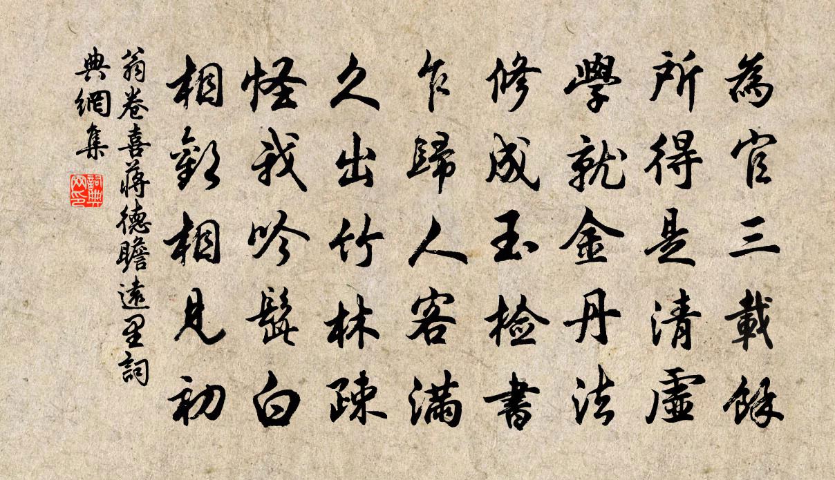 詩詞名句歷史字典書法欣賞書法字典國語詞典說文解字康熙字典古漢語字典標 題 作 者 詩 句 喜蔣德瞻遠里作者:翁卷 朝代:宋代喜蔣德瞻遠里原文為官三載余,所得是清虛。學就金丹法,修成玉檢書。乍歸人客滿,久出竹林疎。怪我吟髭白,相歡相見初。詩詞問答問:喜蔣德瞻遠里的作者是誰?答:翁卷問:喜蔣德瞻遠里寫於哪個朝代?答:宋代翁卷喜蔣德瞻遠里書法欣賞喜蔣德瞻遠里書法作品詩詞推薦除日答夢得同發楚州白居易〔唐代〕共作千里伴,俱為一郡回。歲陰中路盡,鄉思先春來。山雪晚猶在,淮冰晴欲開。歸歟吟可作,休戀主人杯。雜曲歌辭。樂府顧況〔唐代〕暖谷春光至,宸游近甸榮。雲隨天仗轉,風入御簾輕。翠蓋浮佳氣,朱樓倚太清。朝臣冠劍退,宮女管弦迎。細草贈陳龍湖姚勉〔宋代〕蜿蜒寒碧卷深清,一灑甘霖澤萬生。此際莫驚蟠蟄好,近冬時節不妨晴。木蘭花(汝陰湖上同東坡用六一韻)陳師道〔宋代〕湖平木落搖空闊。葉底流泉鳴復咽,酒邊清漏往時同,花里朱弦縴手抹。風光過手春冰滑。十事違人常七八。不將枕上聞子規二首楊萬里〔宋代〕去年借宅寄生兒,今歲群兒又學伊。差面見他鶯與鷰,向人強道不如歸。次韻胡景參制機見壽二首陳著〔宋代〕南風吹笠走長須,一軸新詩一幅書。虎榜陳人有韓愈,鶴山佳婿得肩吾。行年八十死將似,求活須臾計已疏。慚愧奉和李相公早朝於中書候傳點偶書所懷奉呈門下…鄭相公呂溫〔唐代〕禁門留騎吹,內省正衣冠。稍辨旂常色,尚聞鐘漏殘。九天爐氣暖,六月玉聲寒。宿霧開霞觀,晨光泛露盤。致君上元陸游〔宋代〕細細香塵暗六街,魚鱗淺碧暮雲開。新妝褰幕全身見,誤馬隨車一笑回。酒釅頓忘風力峭,夜長猶恨漏聲催。京華自遣劉兼〔唐代〕未上亨衢獨醉吟,賦成無處博黃金。家人莫問張儀舌,國士須知豫讓心。照乘始堪沽善價,陽春爭忍混凡音。鵾鵬和答魯復一高士晁補之〔宋代〕四觀以為鄰,朝霞以為灶。贈我不知名,千古岩下草。句諶祜〔宋代〕萬壑松風天鼓吹,四圍花月錦簾櫳。衛生羅與之〔宋代〕屏去雞壅與豕零,試聽我誦衛生經。兩忘寵辱心源淨,一掃榮枯眼界明。酖毒不令生厚味,奸邪寧使出繁聲。冥鈞至南陵答皇甫岳王昌齡〔唐代〕與君同病復漂淪,昨夜宣城別故人。明主恩深非歲久,長江還共五溪濱。除棘黎廷瑞〔宋代〕萬甲綠未動,棘叢已蓁蓁。所害雖尚微,剪薙當及辰。舍鋤忽三嘆,念爾亦一春。是中留復難,惻然為之顰。築垣哭友人故校書王君夷仲員興宗〔宋代〕天台書插天天一色,先生乃在山之側。擁書萬卷日逍遙,戶外絕無塵土客。自跡詩書分戰場,垂垂六甲皆科郎。治送李少府貶峽中王少府貶長沙高適〔唐代〕嗟君此別意何如?駐馬銜杯問謫居。巫峽啼猿數行淚,衡陽歸雁幾封書。青楓江上秋帆遠,白帝城邊古木疏。新地嘆花 / 悵詩杜牧〔唐代〕自是尋春去校遲,不須惆悵怨芳時。狂風落盡深紅色,綠葉成陰子滿枝。詠漁父徐僑〔宋代〕占得江湖汗漫天,了無鄉縣掛民編。賣魚買酒醉日日,長是太平無事年。李節推亭子曾鞏〔宋代〕盱江郭東門,江水湛虛碧。東南望群峰,連延倚天壁。長林相蔽虧,蒼翠浮日夕。青冥窗戶寒,居者非咫尺。子初沖佑安撫郎中張公輓詞葉適〔宋代〕誰憐張太守,思職更憂邊。濠水中間月,交山盡處天。人應迷往事,我獨采遺編。莽莽乾坤里,冥知想慨然。名句推薦斷送一生憔悴,只銷幾個黃昏。趙令畤《清平樂·春風依舊》 知者樂水,仁者樂山。孔子弟子《論語·雍也篇》 雞聲茅店月,人跡板橋霜。溫庭筠《商山早行》 拆桐花爛漫,乍疏雨、洗清明。柳永《木蘭花慢·拆桐花爛漫》 山中一夜雨,樹杪百重泉。王維《送梓州李使君》 夜深知雪重,時聞折竹聲。白居易《夜雪》 道人庭宇靜,苔色連深竹。柳宗元《晨詣超師院讀禪經》 流水孤村,荒城古道。陳霆《踏莎行·晚景》 追亡事、今不見,但山川滿目淚沾衣辛棄疾《木蘭花慢·席上送張仲固帥興元》 料峭春風吹酒醒,微冷,山頭斜照卻相迎。蘇軾《定風波·三月七日》