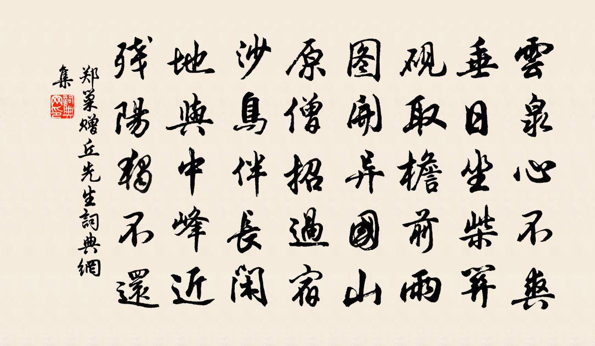 詩詞名句歷史字典書法欣賞書法字典國語詞典說文解字康熙字典古漢語字典標 題 作 者 詩 句 贈丘先生作者:鄭巢 朝代:唐代贈丘先生原文雲泉心不爽,垂日坐柴關。硯取檐前雨,圖開異國山。原僧招過宿,沙鳥伴長閒。地與中峰近,殘陽獨不還。詩詞問答問:贈丘先生的作者是誰?答:鄭巢問:贈丘先生寫於哪個朝代?答:唐代問:贈丘先生是什麼體裁?答:五律鄭巢贈丘先生書法欣賞贈丘先生書法作品注釋全唐詩:卷504-20詩詞推薦挽曹夫人劉黻〔宋代〕一見豐碑已愴情,大家名重乞誰銘。金花屢錫華封誥,白髮重看禁從榮。三世種成庭上桂,一生讀盡藏中經。當年壽參政翁合〔宋代〕鳳凰巢定萬年枝,陶鑄蒼生盡未遲。六丈語言同輩服,二郎官職乃翁知。味因春茗甘方永,春到寒花淡更奇。十有定風波·南海歸贈王定國侍人寓娘蘇軾〔宋代〕王定國歌兒曰柔奴,姓宇文氏,眉目娟麗,善應對,家世住京師。定國南遷歸,余問柔:“廣南風土, 應是不好題椰子樹沈佺期〔唐代〕日南椰子樹,香裊出風塵。叢生調木首,圓實檳榔身。玉房九霄露,碧葉四時春。不及塗林果,移根隨漢臣。觀兗文忠公家六一堂圖書陳師道〔宋代〕生世何用早,我已後此翁。頗識門下士,略已聞其風。中年見二子,已復歲一終。呼我過其廬,所得非所蒙。先朝滁城對雪韋應物〔唐代〕晨起滿闈雪,憶朝閶闔時。玉座分曙早,金爐上煙遲。飄散雲台下,凌亂桂樹姿。廁跡鴛鷺末,蹈舞豐年期。今朝苦雨張耒〔宋代〕伏盡暑初變,西風作秋聲。瀟瀟晚雨急,達旦聲不停。陰暝雞失警,微涼肅晨興。湍流昌階闥,積潦被門庭。仰視林徽猷挽間二首曹勛〔宋代〕昔處朝廷日,堅持諫諍風。宰司資大政,帝座識孤忠。烏府無前匹,龍驤有舊功。中興追錄處,耆德晨淵衷。送志彌師往淮南皇甫冉〔唐代〕已能持律藏,復去禮禪亭。長老偏摩頂,時流尚誦經。獨行寒野曠,旅宿遠山青。眷屬空相望,鴻飛已杳冥。雷逸老以仿石鼓文見遺因呈祭酒吳公梅堯臣〔宋代〕石鼓作自周宣王,宣王發憤搜岐陽。我車我馬攻既良,射夫其同弓矢張。舫舟又漁縛鱮魴,何以貫之維柳楊。從官裂衣書詩寄弟趙卯發〔宋代〕城池不高深,無財又無兵。惟有死報國,來生作弟兄。感懷二首文天祥〔宋代〕伏龍欲夾太陽飛,獨柱擎天力弗支。北海風沙漫漢節,浯溪煙雨暗唐碑。書空已恨天時去,惜往徒懷國士知。抱膝雨中作陸游〔宋代〕淅淅連江雨,愔愔一室幽。茶甘留齒頰,香潤上衣裘。泥滓將雛鴨,林樊喚婦鳩。短章雖漫興,聊足散吾愁。江西投謁所知為典客所阻因賦劉魯風〔唐代〕萬卷書生劉魯風,煙波萬里謁文翁。無錢乞與韓知客,名紙毛生不肯通。六月六日侄孫輩同食大麥二首錢時〔宋代〕大麥新炊苜蓿盤,一壺春酒小團欒。金丹九死生靈命,莫作尋常糲飯看。碧桃春 壽廣微天師程文海〔元代〕瑟琶峰上曉雲光。遙聞薇露香。雲中王母九霞觴。碧桃今日嘗。開大國,佩重章。舊家張子房。青山虎踞復龍驤。翻經台趙湘〔唐代〕勝事如飛去不還,無人更立白雲間。西風落盡貝多葉,明月自來天竺山。岩桂影寒泉暗滴,玉爐香減蘚空斑。孤猿題襄陽圖徐安貞〔唐代〕畫得襄陽郡,依然見昔游。峴山思駐馬,漢水憶回舟。丹壑常含霽,青林不換秋。圖書空咫尺,千里意悠悠。念奴嬌范成大〔宋代〕十年舊事,醉京花蜀酒,萬葩千萼。一棹歸來吳下看,俯仰心情今昨。強倚雕闌,羞簪雪鬢,老恐花枝覺。揩摹愁行香子杜安世〔宋代〕黃金葉細,碧玉枝纖。初暖日、當乍晴天。向武昌溪畔,於彭澤門前。陶潛影,張緒態,兩相牽。數株堤面,幾樹名句推薦君子愛財,取之有道。佚名《增廣賢文·上集》 拜華星之墜幾,約明月之浮槎。文天祥《回董提舉中秋請宴啟》 凡與敵戰,若有形勢便利之處,宜爭先據之,以戰則勝。佚名《百戰奇略·第四卷·爭戰》 強龍不壓地頭蛇。吳承恩《西遊記·第四十五回》 說大人,則藐之,勿視其巍巍然。孟子《孟子·盡心章句下·第三十四節》 終然獨不見,流淚空自知。李白《獨不見》 南國辛居士,言歸舊竹林孟浩然《都下送辛大之鄂》 樓兒忒小不藏愁。幾度和雲飛去、覓歸舟蔣捷《虞美人·梳樓》 千里孤墳,無處話淒涼。蘇軾《江城子·乙卯正月二十日夜記夢》 一曲當筵落淚,重掩羅巾。晏殊《山亭柳·贈歌者》