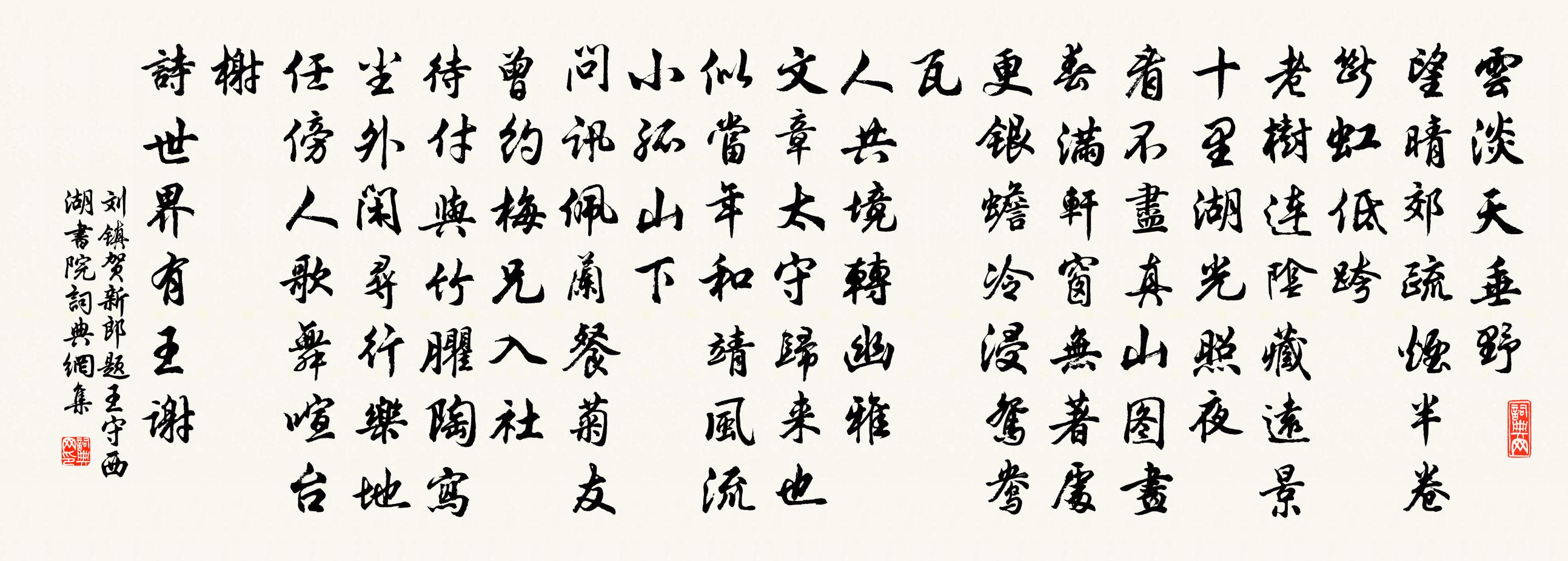 詩詞名句歷史字典書法欣賞書法字典國語詞典說文解字康熙字典古漢語字典標 題 作 者 詩 句 賀新郎(題王守西湖書院)作者:劉鎮 朝代:宋代賀新郎(題王守西湖書院)原文雲淡天垂野。望晴郊、疏煙半卷,斷虹低跨。老樹連陰藏遠景,十里湖光照夜。看不盡、真山圖畫。春滿軒窗無著處,更銀蟾、冷浸鴛鴦瓦。人共境,轉幽雅。文章太守歸來也。似當年、和靖風流,小孤山下。問訊佩蘭餐菊友,曾約梅兄入社。待付與、竹臞陶寫。塵外閒尋行樂地,任傍人、歌舞喧台榭。詩世界,有王謝。詩詞問答問:賀新郎(題王守西湖書院)的作者是誰?答:劉鎮問:賀新郎(題王守西湖書院)寫於哪個朝代?答:宋代問:賀新郎(題王守西湖書院)是什麼體裁?答:詞劉鎮賀新郎(題王守西湖書院)書法欣賞賀新郎(題王守西湖書院)書法作品詩詞推薦送陳侗同年知陝府蘇轍〔宋代〕上書乞江淮,得請臨關河。所得非所願,親友或相訶。丈夫志四方,所遇常逶迤。況當國西屏,形勝古來多。昆渠偈頌二百零五首釋正覺〔宋代〕靈雲卻解見桃華,老眼如今冷淡些,拈卻面前案山子,柱門路直不橫斜。題環翠閣何異〔宋代〕環翠閣邊無點埃,盡收清致助吟才。溪頭月落漁煙散,岸口城低野色來。斜檻半依秋樹出,小窗知為北山開。沙禽大風范成大〔宋代〕颶母從來海若家,青天白地忽飛沙。煩將殘暑驅除盡,只莫顛狂損稻花。摸魚兒(送陳太史東歸)伍梅城〔宋代〕極知君、腰騎鶴,此心與水相似。梧桐葉上黃昏雨,恨殺無情流水。滔滔地。今日大江頭,明日人千里。君思往事頌古七首釋道謙〔宋代〕賢聖劫來未曾殺,而今斷這一刀休。果然葛怛胸中落,笑殺靈山老比丘。句鄭域〔宋代〕九里花田地。奉和王相公早春登徐州城皇甫冉〔唐代〕落日憑危堞,春風似故鄉。川流通楚塞,山色繞徐方。壁壘依寒草,旌旗動夕陽。元戎資上策,南畝起耕桑。月夜登閣避暑白居易〔唐代〕旱久炎氣盛,中人若燔燒。清風隱何處,草樹不動搖。何以避暑氣,無如出塵囂。行行都門外,佛閣正岧嶢。清涼空王子釋慧空〔宋代〕空王子之空而靈,拈起缽飯忘了羹。一生看經不識字,總十二部為一句。一生說禪不動口,噴嚏也成師子吼。阿呵龍潭太室一筍穿入露滿其上因賦之樓鑰〔宋代〕一筍入屋照座寒,凌晨仍有清露漙。益信露珠自根起,正如真水朝泥丸。廈屋不應為汝穿,不肯屈節斜倚欄。乾霄詩寄趙九新娶陳著〔宋代〕風擺柳梢雲未乾,痴雲妒日正嬌寒。儇香公子新鴛侶,那肯興心客路難。與梁左藏會飲傅國埔家蘇軾〔宋代〕將軍破賊自草檄,論詩說劍俱第一。彭城老守本虛名,識字劣能欺項籍。風流別駕貴公子,欲把笙歌暖鋒鏑。紅旆舟過樊江憩民家具食陸游〔宋代〕旅食何妨美蕨薇,夕陽來叩野人扉。蕭蕭短鬢秋初冷,寂寂空村歲荐饑。蓼岸刺船驚雁起,煙陂吹笛喚牛歸。詩情金剛隨機無盡頌如理實見分第五釋印肅〔宋代〕赤水珠難隱,無限人撈捃。罔象性無求,得了何憑準。懷慶朔堂范仲淹〔宋代〕慶朔堂前花自栽,便移官去未曾開。年年憶著成離恨,祇托春風管句來。點絳唇元好問〔金代〕玉蕊輕明,洗妝偏費春風手。韻香襟袖。別是閨房秀。錦瑟華年,□醉東園酒。西歸後。舊家花柳。誰得何郎瘦。初過隴山途中,呈宇文判官岑參〔唐代〕一驛過一驛,驛騎如星流。平明發鹹陽,暮及隴山頭。隴水不可聽,嗚咽令人愁。沙塵撲馬汗,霧露凝貂裘。西來寒食雨中,同舍約游天竺,得十六絕句呈陸務楊萬里〔宋代〕雨里匆匆怨出郊,晴時不出卻誰教。西湖北畔名園裡,無數桃花只見梢。兩浙轉運使呂少卿輓辭強至〔宋代〕卿月無光沒使星,屬封涕淚逐霜零。敝裯舊服從身殮,素節清風到目瞑。澄汰濁流師孟博,誅求橫賦罪延齡。塵埃名句推薦眾中聞謦欬,未語知鄉里。蘇軾《送金山鄉僧歸蜀開堂》 傷心秦漢經行處,宮闕萬間都做了土。張養浩《山坡羊·潼關懷古》 斜陽獨倚西樓。遙山恰對簾鉤。晏殊《清平樂·紅箋小字》 水滿有時觀下鷺,草深無處不鳴蛙。陸游《幽居初夏》 山中夜來月,到曉不曾看。元好問《倪莊中秋》 微微風簇浪,散作滿河星。查慎行《舟夜書所見》 垂柳依依惹暮煙,素魄娟娟當繡軒。王元鼎《憑欄人·閨怨》 寬柔以教,不報無道,南方之強也。君子居之。子思《中庸·第十章》 山無陵,江水為竭,冬雷震震,夏雨雪,天地合,乃敢與君絕。佚名《上邪》 覆巢之下,復有完卵劉義慶《世說新語·言語》