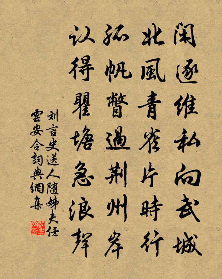 詩詞名句歷史字典書法欣賞書法字典國語詞典說文解字康熙字典古漢語字典標 題 作 者 詩 句 送人隨姊夫任雲安令作者:劉言史 朝代:唐代送人隨姊夫任雲安令原文閒逐維私向武城,北風青雀片時行。孤帆瞥過荊州岸,認得瞿塘急浪聲。詩詞問答問:送人隨姊夫任雲安令的作者是誰?答:劉言史問:送人隨姊夫任雲安令寫於哪個朝代?答:唐代問:送人隨姊夫任雲安令是什麼體裁?答:七絕劉言史送人隨姊夫任雲安令書法欣賞送人隨姊夫任雲安令書法作品注釋全唐詩:卷468-56詩詞推薦歲暮皈自城中,一病垂死,病起遣悶四首楊萬里〔宋代〕出郭雲尚明,及郊日忽暮。不思日略短,卻信雲色誤。駿奔六七里,逢店破亦住。澆愁幸殘尊,照睡聊短炬。荒雞扇子詩李石〔宋代〕拈花示病元來怕,遇酒逃禪卻未真。三古絕編徒自聖,二王書法恐非臣。贈孤山道士二首周文璞〔宋代〕九霄象簡手中擎,豈是閒人愛列卿。洞裡石田春漠漠,有田多與種黃精。永王東巡歌·其七李白〔唐代〕王出三山按五湖,樓船跨海次陪都。戰艦森森羅虎士,征帆一一引龍駒。晚自台中歸永寧里南望山色悵然有懷呈上右司十一兄竇群〔唐代〕白髮侵侵生有涯,青襟曾愛紫河車。自憐悟主難歸去,馬上看山恐到家。莊子與惠子游於濠梁佚名〔先秦〕莊子與惠子游於濠梁之上。莊子曰:“鯈魚出遊從容,是魚之樂也。”惠子曰:“子非魚,安知魚之樂?”莊子曰十六夜再登月台吳芾〔宋代〕虛度中秋頗動懷,今宵卻事上高台。強延風月雖聊爾,一對江山亦快哉。小子仍攜竹葉至,同僚還折桂枝來。老夫淳化中朝會二十三首佚名〔宋代〕大君隆至化,興運契千齡。觀禮俄班瑞,夷寅盡實庭。成文調露樂,奉聖拱辰星。舞佾方更進,朝陽上楚萍。醉花陰王庭珪〔宋代〕紅塵紫陽春來早。晚市煙光好。燈發萬枝蓮,華月光中,天淨開蓬島。老人舊日曾年少。年少還須老。今夕在天涯頌古三十二首釋明辯〔宋代〕轉位投機覓更難,回途復妙豈相關。新豐洞口翻波浪,一掃須教徹底乾。減字採桑子 詞中有誤字侯善淵〔元代〕嗟恨這形骸。百般做、紐捏狂乖。如今省也尋歸路,冰清玉潔,昂霄峻鄂,奚失俗崖。心靜若冰台。靈光瑩、不梁余床帳為過兵捲去答梅山弟用餘韻見寄陳著〔宋代〕一床破帳護衰翁,席捲俄隨掠騎東。與婦同圍膚炭火,呼兒排作肉屏風。從來不起羊羔想,困倒何妨蝶夢通。亂世贈劉惠卿二首楊萬里〔宋代〕活卻千人藥一囊,陰功吹作滿城香。靈椿丹桂君家有,莫羨燕山竇十郎。大孤山黃庶〔宋代〕彭蠡百里南國襟,萬頃蒼煙插孤岑。不知天星何時落,春秋不書不可尋。石怪木老鬼所附,茲乃與水同浮沉。鳴鴟偈頌一百四十一首釋師範〔宋代〕木中有火,鑽之始明。礦中有金,煉之始精。諸人分上各各有無價之寶,如何甘自溺於陰入之坑。郡守勸駕樂語姚勉〔宋代〕主人合作紫薇郎,引領群仙覲玉皇。滿袖風雲生羽翮,排空牛斗避光芒。錦江家讖聲名在,金榜巍科姓字香。典貢蠟梅楊公遠〔宋代〕一種孤芳別樣奇,化工鎔蠟雪霜時。正憐粉蝶歸何處,卻怪黃蜂集滿枝。衣效道妝香惹袖,面侔拂相臉無脂。清名宮詞宋白〔宋代〕去年因戲賜霓裳,權戴金冠奉玉皇。久著淡黃心覺大厭,春來不敢便紅妝。木犀五首清張明中〔宋代〕冶蕊倡花浪說馨,艷姚妖魏眩雙明。黃金四出薰蘭麝,個是花中第一清。得子侄書喻鳧〔唐代〕遠書來阮巷,闕下見江東。不得經史力,枉拋耕稼功。雁天霞腳雨,漁夜葦條風。無復琴杯興,開懷向爾同。名句推薦陌上深深,依舊年時轍。王國維《蝶戀花·滿地霜華濃似雪》 春色邊城動,客思故鄉來。何遜《邊城思》 若待得君來向此,花前對酒不忍觸。蘇軾《賀新郎·夏景》 千年史冊恥無名,一片丹心報天子。陸游《金錯刀行》 財物輕,怨何生。言語忍,忿自泯。李毓秀《弟子規·出則弟》 鳳凰台上鳳凰游,鳳去台空江自流。李白《登金陵鳳凰台》 江上旗亭,送君還是逢君處吳大有《點絳唇·送李琴泉》 兒女此情同。往事朦朧。湘娥竹上淚痕濃。辛棄疾《浪淘沙·賦虞美人草》 夫為將之道,必順天、因時、依人以立勝也。諸葛亮《將苑·卷一·智用》 侵陵雪色還萱草,漏泄春光有柳條。杜甫《臘日》