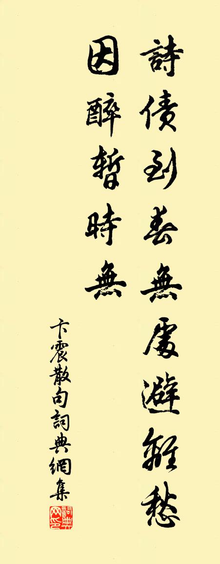 詩詞名句歷史字典書法欣賞書法字典國語詞典說文解字康熙字典古漢語字典標 題 作 者 詩 句 句作者:卞震 朝代:宋代句原文詩債到春無處避,離愁因醉暫時無。詩詞問答問:句的作者是誰?答:卞震問:句寫於哪個朝代?答:宋代卞震句書法欣賞句書法作品注釋見《春日偶題》詩詞推薦雜詩曹植〔魏晉〕西北有織婦,綺縞何繽紛。明晨秉機杼,日昃不成文。太息經長夜,悲嘯入青雲。妾身守空閨,良人行從軍。自期踏莎行佚名〔宋代〕點點瓊酥,初寒乍結。看來未忍輕輕折。園林正告久蕭條,春工著意饒先發。眼底不凡,枝頭自別。也知徹苦宜霜漁父詞一十八首延壽呂岩〔唐代〕子午常餐日月精,玄關門戶啟還扃。長如此,過平生,且把陰陽子細烹。登龍昌上寺望江南山,懷錢舍人白居易〔唐代〕騎馬出西郭,悠悠欲何之?獨上高寺去,一與白雲期。虛檻晚瀟灑,前山碧參差。忽似青龍閣,同望玉峰時。因詠雪中雪坡十憶姚勉〔宋代〕欲折梅花寄故人,驛無來使草成茵。輕風細雨分寒暖,已是江南數日春。奇見華岳〔宋代〕紅牙催拍燕飛忙,一片行雲繞畫堂。眉黛蹙成遊子恨,臉紅燒故人腸。榆錢不買千金笑,柳帶何須百寶妝。舞罷隔重陽後五日再和叔愚葛紹體〔宋代〕不對黃花酒,還添白苧衣。沼鱗空細詠,林翼奮高飛。氣概今誰是,才華昔已非。最憐多病後,衣帶褪重圍。題玉澗八景八首王柏〔宋代〕居淡經營中,落筆景已換。不見片帆歸,危檣還泊岸。寄林太守張繼先〔宋代〕長生門戶誰不愛,只要自己下功大。九宮台上黃芽生,白玉池邊蟠桃在。撞動一磋鬼神伏,撥轉地軸陰魔敗。河車玉樓春(冬日上江西漕魯大卿)石孝友〔宋代〕漢皇受禪新堯統。沼躍潛魚儀舞鳳。五雲色備觀台書,萬世功成賢相用。江湖襟帶蠻荊控。摩撫民勞輸土貢。願傾句釋本逸〔宋代〕罥鶴顛崖上,沖天昧米民。壽徐意一參政方蒙仲〔宋代〕紅雲朵里紫霞杯,敕使今朝四度來。意一堂中開九袠,太微星里現三台。三峰王耿殿丞將移陝下通理先已同袁刑部以唱魏野〔宋代〕蜀出多才信不虛,淹翔猶未佩銀符。民間惠愛應長有,馬上歌詩豈暫無。休話卜鄰來草澤,即看得路去蓬壺。申湖題蘇州楞伽寺張祜〔唐代〕樓台山半腹,又此一經行。樹隔夫差苑,溪連勾踐城。上坡松徑澀,深坐石池清。況是西峰頂,淒涼故國情。西園晚秋見寄宋祁〔宋代〕中園秋物曉,清玩日無窮。暝篠深留翠,寒花淺作紅。鶴鳴殘滴露,蜩咽已涼風。誰伴調絲管,心知憶戴崇。壽成惠聖慈佑太皇太后閣春帖子衛涇〔宋代〕刁斗轅門五夜深,思齊文母正關心。身臨大練無他費,湯沐先捐鉅萬金。春日絕句陸游〔宋代〕吏來屢敗喔詩興,雨作常妨載酒行。忽見家家插楊柳,始知今日是清明。鳳棲梧 天台石橋張可久〔元代〕兩袖剛風凌倒景。小磴松聲,獨上招提境。碧水流雲三百頃。白龍飛過青天影。折腳鐺中留苦茗。野菊生花,猶記秦刑篇楊維楨〔元代〕秦刑悖聖教,其律毒如兵。大漢解倒懸,文網舒急繩。朝儀取雜用,千載罵鄙生。燕石覓玉質,鄭調求韶聲。如何秋懷五首簡陳巽叔徐伯老王炎〔宋代〕西風脫數葉,木末秋有聲。團扇內篋中,肅肅庭戶清。公退頗無事,解衣坐車榮。本乏霄漢心,未斷丘壑情。日月名句推薦秋草六朝寒,花雨空壇。朱彝尊《賣花聲·雨花台》 故先民以時生財,固本而用財,則財足。墨子《墨子·05章 七患》 風水人間不可無,也須陰騭兩相扶。馮夢龍《醒世恆言·卷一》 小軒獨坐相思處,情緒好無聊。石孝友《眼兒媚·愁雲淡淡雨瀟瀟》 遲遲鐘鼓初長夜,耿耿星河欲曙天。白居易《長恨歌》 一朝春盡紅顏老,花落人亡兩不知。曹雪芹《紅樓夢·第二十七回》 窮且益堅,不墜青雲之志。王勃《滕王閣序》 紫菊氣,飄庭戶,晚煙籠細雨。李煜《謝新恩·冉冉秋光留不住》 枯枝無醜葉,涸水吐清泉李白《長歌行》 簾控鉤,掩上珠樓,風雨替花愁喬吉《春閨怨·不系雕鞍門前柳》