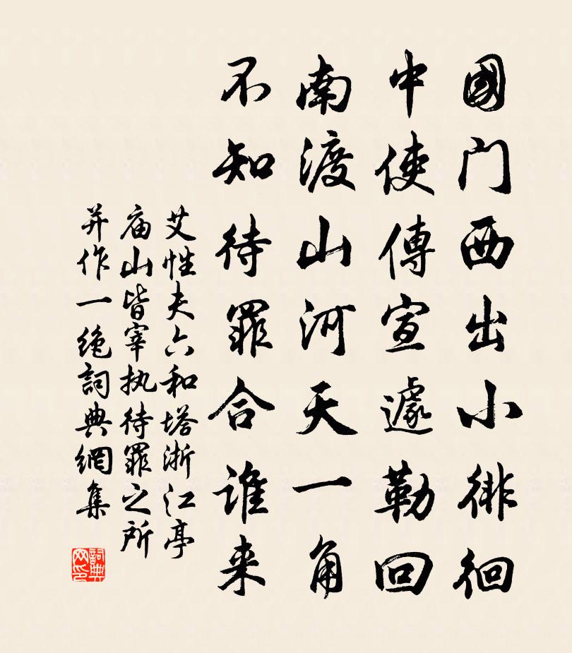 詩詞名句歷史字典書法欣賞書法字典國語詞典說文解字康熙字典古漢語字典標 題 作 者 詩 句 六和塔浙江亭廟山皆宰執待罪之所並作一絕作者:艾性夫 朝代:宋代原文國門西出小徘徊,中使傳宣遽勒回。南渡山河天一角,不知待罪合誰來。詩詞問答問:《六和塔浙江亭廟山皆宰執待罪之所並作一絕》的作者是誰?答:艾性夫問:該詩寫於哪個朝代?答:宋代問:該詩是什麼體裁?答:七絕書法欣賞六和塔浙江亭廟山皆宰執待罪之所並作一絕書法作品詩詞推薦導引(一曲·虞主回京雙調四曲)范祖禹〔宋代〕思齊文母,盛烈對皇天。演寶祚千年。卿雲復旦治功全。厭人世登仙。龍輿忽掩三川。彩仗屬車旋。維清象舞告英送新除國博徐員外知婺州徐鉉〔唐代〕憐君盡室泛安流,職重官新未白頭。楚老歡迎歸舊里,春風留戀過揚州。逢時肯更嗟庭樹,屬詠還應上郡樓。宗黨假山小池陸游〔宋代〕連獲三峰寺,桃源一路分。池偷鏡湖月,石帶澳州雲。魚隊深猶見,琴聲靜更聞。嚴幽林箐密,疑可下湘君。依韻和王安之卿六老詩仍見率成七邵雍〔宋代〕林下狂歌不帖腔,帖腔安得謂之狂。小車行處鶯花鬧,大筆落時神鬼忙。門掩柴荊闤闠遠,牆開瓮牖薜蘿香。一般次韻酬子之孟見贈張鎡〔宋代〕相逢未問有詩新,識得全然少得人。莫怪世間多不愛,翰林憔悴少陵貧。偈傾一百六十九首釋智朋〔宋代〕卒風暴雨,鼓盪無前。石裂崖崩,迴避不及。總教喪盡生涯,方見時清道泰。功不浪施。句張釜〔宋代〕家傳活國有良方。卜運算元歐陽修〔宋代〕極得醉中眠,迤邐翻成病。莫是前生負你來,今世里、教孤冷。言約全無定。是誰先薄倖。不慣孤眠慣成雙,奈奴用夾穀子括吳山晚眺韻十首方回〔宋代〕湖共江寬更海寬,遙天縱玩復橫觀。雅知山對吟肩瘦,未怯霜欺醉面寒。感召豐登饒粒食,撫摩瘦敝起雕殘。生靈奉和詠風應魏王教虞世南〔唐代〕逐舞飄輕袖,傳歌共繞樑。動枝生亂影,吹花送遠香。酹江月侯善淵〔元代〕貪財競色,利名牽、縈系何時休歇。鎮日忙忙如夢想,顛倒心猿馬劣。昧地謾天,多能已會,以巧翻為拙。萬般虛滿庭芳黃庭堅〔宋代〕北苑龍團,江南鷹爪,萬里名動京關。碾深羅細,瓊蕊暖生煙,一種風流氣味,如甘露、不染塵凡。纖纖捧,冰瓷自詠二首蔡沆〔宋代〕一病觀書歇,終朝藥餌親。焚香葆靜性,咬菜適清神。落燕巢低屋,飢烏噪近人。覓仙難換骨,貧瘦得吾真。和劉後村雜興胡仲弓〔宋代〕冬深差喜病根除,藥裹猶親酒盞疎。門對好山純種竹。園通活水可澆疏。檐牙帶濕霜晴後,簾額移陰日出初。時有又和六首劉克莊〔宋代〕鄉縣俱叨析爵封,弟兄麾節愧慆悰。腐紅有兆寬枵腹,新淥無端照醜容。青草池荒休去蟈,黃梅雨歇近分龍。即今頌古十四首七處徵心釋可湘〔宋代〕七處徵它天外天,毫光直射阿難肩,瞿曇忒煞憐兒切,逼得鮎魚上竹竿。夢中作得六句覺後足成張嵲〔宋代〕山中茅屋好,況復竹籬新。一逕往來客,萬山迎送人。葉殷渾欲染,冬暖卻疑春。近得幽棲地,時來岸角巾。峽路山行即事十首袁說友〔宋代〕浩蕩東風晚更嚴,黃埃得得上霜髯。細題今日山中景,更有前頭萬點尖。秋夜出門觀月陸游〔宋代〕六十衰翁適得閒,一秋無事掩柴關。雁來慘澹沙場外,月出蒼茫雲海間。飲酒已衰猶愛客,著書初畢可藏山。此生小松(一作杜荀鶴詩,非)羅隱〔唐代〕已有清陰逼座隅,愛聲仙客肯過無。陵遷谷變須高節,莫向人間作大夫。名句推薦隨意春芳歇,王孫自可留。王維《山居秋暝》 居高聲自遠,非是藉秋風。虞世南《蟬》 取次花叢懶回顧,半緣修道半緣君。元稹《離思五首·其四》 若為化得身千億,散上峰頭望故鄉。柳宗元《與浩初上人同看山寄京華親故》 荊江日落陣雲低,橫戈躍馬今何時。納蘭性德《送蓀友》 楊柳散和風,青山澹吾慮。韋應物《東郊》 鶯嘴啄花紅溜,燕尾點波綠皺。秦觀《如夢令·春景》 若待上林花似錦,出門俱是看花人。楊巨源《城東早春》 生而知之;或學而知之;或困而知之:及其知之,一也。子思《中庸·第二十章》 欹枕數秋天,蟾蜍下早弦。納蘭性德《菩薩蠻·蕭蕭幾葉風兼雨》