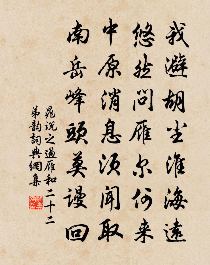 詩詞名句歷史字典書法欣賞書法字典國語詞典說文解字康熙字典古漢語字典標 題 作 者 詩 句 過雁和二十二弟韻作者:晁說之 朝代:宋代過雁和二十二弟韻原文我避胡塵淮海遠,悠然問雁爾何來。中原訊息須聞取,南嶽峰頭莫謾回。詩詞問答問:過雁和二十二弟韻的作者是誰?答:晁說之問:過雁和二十二弟韻寫於哪個朝代?答:宋代晁說之過雁和二十二弟韻書法欣賞過雁和二十二弟韻書法作品詩詞推薦落花三首廖行之〔宋代〕春深處處有花妍,已覺春工興浩然。投曉憑欄枝上看,飄零贏得舞容翩。念奴嬌洪咨夔〔宋代〕香山花老矣,正花商量不下,去留蠻素。獨立躊躇腸欲斷,一段若耶溪女。水底新妝,空中香袖,斜日疏風浦。向水調歌頭(十之四)夏元鼎〔宋代〕真一北方氣,玄武產先天。自然感合,蛇兒卻把黑龜纏。便是蟾烏遇朔,親見虎龍吞啖,頃刻過崑崙。赤黑達表里次韻徐縣丞送行項安世〔宋代〕用之索句苦,字字嚴以清。嚼之有永味,悠然寄深情。去年作一詩,如聽湘樂樂。聲翻楚客思,曲罷游魚寬。今年至啟休沐之中靜專一室病不復飲無心慰懷性且李至〔宋代〕朱門多好景,五月亦清涼。地勝長膏潤,泉甘劇蔗漿。樹深無日到,逕僻有莎荒。但恐裴中令,虛誇綠野堂。贈青陽士友王遂〔宋代〕離紅百顆橘千頭,何似南枝雪未收。國為和羹思是晏,士因止渴憶興周。笑談谷口終當隱,出處胸中要熟籌。夜月墨梅三絕張子文〔宋代〕憶昨江湖倒載歸,暗香夾路雨霏微。誰人貌得春風景,遠看如煙近卻非。古行宮章孝標〔唐代〕瓦煙疏冷古行宮,寂寞朱門反鎖空。殘粉水銀流砌下,墮環秋月落泥中。鶯傳舊語嬌春日,花學嚴妝妒曉風。天子滿庭芳佚名〔宋代〕命似清風,性如朗月,瑩然獨見輝輝。靈光普照,何日不歸依。常在無明之處,任升騰、斗轉星移。通真理,不無次韻和文潛暮春即事晁補之〔宋代〕南歸見君百事足,如何一官曾不閒。寒沖雪泥暑鄣日,老面只今如纈斑。憐君與我自同調,久渫不食猶寒泉。功名瑤台月 違終南山 其中疑有脫誤。王哲〔元代〕摧雲放肆投閒路,清風明月長載。迴光返照,瑩徹澄波青黛。仿佛里、遠望嘉山,靜至收歸寧海。前生約,今生在青玉案(徐侍郎生辰)楊無咎〔宋代〕芝蘭桃李環圍著。擁和氣、浮簾幕。壽斝交飛爭滿酌。一聲珠丳,數敲牙板,應有梁塵落。腰金雖重何曾覺。更看太上皇帝合端午帖子詞汪應辰〔宋代〕冷泉堂上湖山勝,聚景園中草木芳。萬物欣欣供燕樂,自然祥暑變清涼。月臨關胡仲弓〔宋代〕長笛一聲天地寒,不堪回首月臨關。山河不二無全影,莫說前頭桂可攀。偈頌七首釋南雅〔宋代〕生是死之生,死是生之死。兩路坦然平,無彼亦無此。頌古二首釋善能〔宋代〕古殿無人到者稀, * 端坐有誰知。不因院主通訊息,爭得寒光萬里輝。頌古十二首釋法泰〔宋代〕十分風采露堂堂,玉蘂瓊華未比量。剛被傍人論好醜,因茲難嫁與潘郎。挽喬民瞻王洋〔宋代〕楚鄉槐市憶當年,錦繡文章六藝先。朱紱哀憐應有在,白頭故舊各悽然。修文地下埋英骨,遺愛江城付彩編。造化郊廟歌辭。德明興聖廟樂章。迎俎李紓〔唐代〕盛牲實俎,涓選休成。鼎煁陽燧,玉盥 * 。有飶嘉豆,既和大羹。侑以清樂,細齊人情。次韻子永雪後見贈范成大〔宋代〕雪瓴待伴半陰晴,竟日檐冰溜雨聲。九陌泥乾塵未動,南山石露塔猶明。稍聞吉語占農事,便覺歸心勝宦情。想得名句推薦芳林新葉催陳葉,流水前波讓後波。劉禹錫《樂天見示傷微之敦詩晦叔三君子皆有深分因成是詩以寄》 把酒看花想諸弟,杜陵寒食草青青。韋應物《寒食寄京師諸弟》 無為在歧路,兒女共沾巾。王勃《送杜少府之任蜀州 / 送杜少府之任蜀川》 浮雲遊子意,落日故人情。李白《送友人》 不務天時,則財不生;不務地利,則倉廩不盈管仲《管子·牧民》 天涯也有江南信。梅破知春近。黃庭堅《虞美人·宜州見梅作》 積土成山,風雨興焉;荀子《勸學》 美言可以市尊,美行可以加人。老子《老子·德經·第六十二章》 北風夜卷赤亭口,一夜天山雪更厚。岑參《天山雪歌送蕭治歸京》 陽月南飛雁,傳聞至此回。宋之問《題大庾嶺北驛》