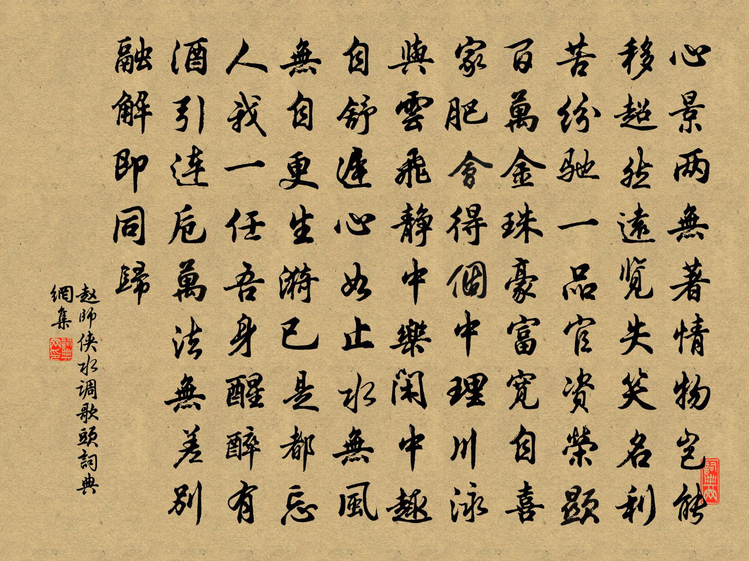 詩詞名句歷史字典書法欣賞書法字典國語詞典說文解字康熙字典古漢語字典標 題 作 者 詩 句 水調歌頭作者:趙師俠 朝代:宋代水調歌頭原文心景兩無著,情物豈能移。超然遠覽失笑,名利苦紛馳。一品官資榮顯,百萬金珠豪富,寬自喜家肥,會得箇中理,川泳與雲飛。靜中樂,閒中趣,自舒遲。心如止水,無風無自更生漪。已是都忘人我,一任吾身醒醉,有酒引連卮。萬法無差別,融解即同歸。詩詞問答問:水調歌頭的作者是誰?答:趙師俠問:水調歌頭寫於哪個朝代?答:宋代趙師俠水調歌頭書法欣賞水調歌頭書法作品詩詞推薦哭吳興柳惲詩何遜〔南北朝〕南州擅荊梓。上國稱羽儀。伊人以載德。李公傷在期。遠識內無慍。深衰外有規。清文窮麗則。弘論盡高奇。多能初冬山居即事十首吳芾〔宋代〕我愛山居好,冬來愜野情。檐前朝日暖,谷口暮雲橫。柏子當軒墮,蕉花傍檻生。自堪安樸拙,何苦慕塵纓。西湖史彌忠〔宋代〕碧波青嶂對紅樓,千古西湖樂未休。試把腰纏 * 色,不知世上有揚州。玉葉重黃晁端禮〔宋代〕玉纖初拈梅花蕊。早憶著、上元天氣。重尋舊曲聲韻,收拾放燈歡計。況人生、百歲能幾。任東風、笑我雙鬢里。書窗梅花數枝病起再見瓶中盛開因作王洋〔宋代〕書堂籬落冷如灰,十日相忘亦自猜。初訝凍枝無艷脈,那知寒室自花開。銅瓶結實元非種,蔀屋迎春似有媒。方信九日都下黃雀食新楊萬里〔宋代〕九日新霜薄,群飛一網遮。裘披楊柳絮,色染木犀花。下箸欣鄉味,知儂憶故家。金杯浮菊蕊,相映兩光華。梅花黃庭堅〔宋代〕障羞半面依篁竹,隨意淡妝窺野塘。飄泊風塵少滋味,一枝猶傍故人香。定風波·感舊蘇軾〔宋代〕莫怪鴛鴦繡帶長,腰輕不勝舞衣裳。薄倖只貪遊冶去,何處,垂楊系馬恣輕狂。花謝絮飛春又盡,堪恨。斷弦塵管僑居一首蘇籀〔宋代〕匆匆五十化,已往固莫及。祠官閴中隱,歉歲屍糝粒。毀方非瓦合,知白無伊鬱。世悅鄒駱駝,我賢揚執戟。浮雲治塗田釋正覺〔宋代〕棋局未散芭蕉仙,樵夫柯爛海成田。長堤抗潮人得路,淡水沒脛牛加鞭。天雲晚晴深似綺,禾稻日藏濃如煙。白米秋懷二首王炎〔宋代〕朅來雲夢澤南州,風物蕭蕭兩見秋。三徑草荒真左計,一官冰冷更何求。莫招毛潁論時事,且喚曲生澆客愁。短艇慈雲四景甘露泉蘇軾〔宋代〕階下有龍潭,一泓寒且碧。不須撫兩掌,流出仙人液。落梅盧梅坡〔宋代〕自負孤高伴歲寒,玉堂茆舍一般看。頑風摧剝君知否,鐵笛一聲人倚欄。隔浦蓮白居易〔唐代〕隔浦愛紅蓮,昨日看猶在。夜來風吹落,只得一回採。花開雖有明年期,復愁明年還暫時。行園僧約同飲方回〔宋代〕晴向小園窺,今朝忽有詩。乳鵝餚菜葉,躍鵲顫花枝。春氣寒終暖,愁人老更衰。醉僧約同飲,徇俗未容辭。重憶山居六首。羅浮山(番禺連帥所遺)李德裕〔唐代〕龍伯釣鰲時,蓬萊一峰坼。飛來碧海畔,遂與三山隔。其下多長溪,潺湲淙亂石。知君分如此,贈逾荊山璧。次韻王忠玉游虎丘絕句三首蘇軾〔宋代〕舞衫歌扇轉頭空,只有青山杳靄中。若共吳王鬥百草,使君未敢借驚鴻。春晴虞儔〔宋代〕萬里陰雲一戰收,怪生和氣襲兼裘。崑山龍過初銜燭,暘谷烏飛不傍舟。曝背爬搔疑挾纊,凍軀傴僂快伸鉤。老農羽氣俞桂〔宋代〕羽氣於詩卻未除,盡教人笑治生疎。功夫若到[窮吟地,雖是居貧富不如。滿庭芳(酬葉憲)洪适〔宋代〕殢酒銷愁,逢場作戲,何曾擇地伸眉。詩筒來往,如我與君稀。喜得青春有閏,添日月、款曲臨池。洲盤有,山餚名句推薦侵夜鸞開鏡,迎冬雉獻裘。李商隱《陳後宮》 人誰無過?過而能改,善莫大焉。左丘明《左傳·宣公·宣公二年》 海風吹不斷,江月照還空。李白《望廬山瀑布水二首》 洞庭春溜滿,平湖錦帆張。陰鏗《渡青草湖》 見善如不及,見不善如探湯孔子弟子《論語·季氏篇》 遙看孟津河,楊柳郁婆娑。佚名《折楊柳歌辭五首》 隔水氈鄉,落日牛羊下,區脫縱橫。張孝祥《六州歌頭·長淮望斷》 獨夜憶秦關,聽鍾未眠客。韋應物《夕次盱眙縣》 梨花風起正清明,遊子尋春半出城。吳惟信《蘇堤清明即事》 鴻羽難憑芳信短,長安猶近歸期遠。盧祖皋《倦尋芳·香泥壘燕》