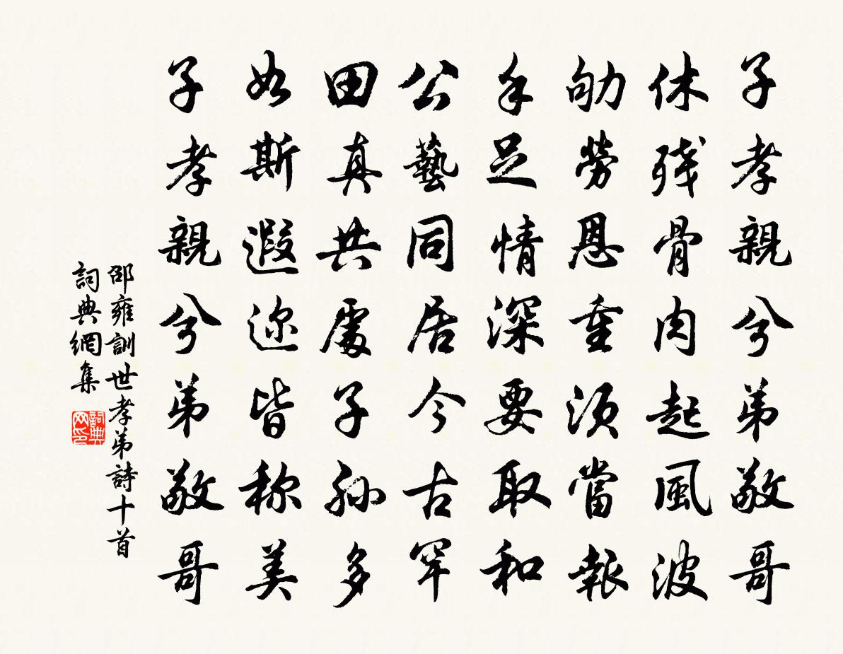 詩詞名句歷史字典書法欣賞書法字典國語詞典說文解字康熙字典古漢語字典標 題 作 者 詩 句 訓世孝弟詩十首作者:邵雍 朝代:宋代訓世孝弟詩十首原文子孝親兮弟敬哥,休殘骨肉起風波。劬勞恩重須當報,手足情深要取和。公藝同居今古罕,田真共處子孫多。如斯遐邇皆稱美,子孝親兮弟敬哥。詩詞問答問:訓世孝弟詩十首的作者是誰?答:邵雍問:訓世孝弟詩十首寫於哪個朝代?答:宋代邵雍訓世孝弟詩十首書法欣賞訓世孝弟詩十首書法作品詩詞推薦題琳老所攜二蘇書帖毛滂〔宋代〕道人此書欲在眼,扁舟一宿亦隨身。霽月光風開玉軸,千年彷佛見斯人。乙巳三月十五日監察御史王東溪節宿戒方回萬方回〔宋代〕世間春暖此間寒,萬樹陰陰萬竹攢。驄馬來遊人不避,畫龍誰寫我頻看。餘生久已忘三黜,高會猶容預四難。閒賞臨石步港徐鉉〔唐代〕碕岸隳縈帶,微風起細漣。綠陰三月後,倒影亂峰前。吹浪遊鱗小,黏苔碎石圓。會將腰下組,換取釣魚船。聽歌武元衡〔唐代〕月上重樓絲管秋,佳人夜唱古梁州。滿堂誰是知音者,不惜千金與莫愁。隆興書堂自警三十五首陳淳〔宋代〕開卷必起敬,肅容正冠襟。如侍聖賢側,親承謦欬音。頌古十一首釋普濟〔宋代〕示疾毗耶問訊疏,知音惟有老文殊。問來答去膠投漆,一病翻成兩病夫。卻歸睦州至七里灘下作劉長卿〔唐代〕南歸猶謫宦,獨上子陵灘。江樹臨洲晚,沙禽對水寒。山開斜照在,石淺亂流難。惆悵梅花發,年年此地看。潼關口號李隆基〔唐代〕河曲回千里,關門限二京。所嗟非恃德,設險到天平。雙調望江南(壽王秋水)劉辰翁〔宋代〕齊眉舉,彩侍紫霞卮。天上九朝鳧冉冉,尊前一笑玉差差。人唱自家詞。籬下菊,醉把一枝枝。花水乞君三十斛,次韻程堯仲風雨詩項安世〔宋代〕春來長是雨相禁,春事能消幾日陰。一夜小桃紅削跡,明朝芳草綠驚心。牆溝{左氵中孚右虎}{左氵中孚右虎}清平樂俞國寶〔宋代〕數聲烏鵲。院宇寒蕭索。楊柳梢頭秋過卻。無葉可供風落。可人猶有芙蕖。向人泠澹妝梳。雲外征鴻過盡,夕陽依寄端書記釋如珙〔宋代〕青猿長短聲,獨自倚廊柱。三際俱不來,一片冷泉水。非唯無眾生,無佛亦無己。短句與長吟,遣興適意耳。半夜漁家傲黃庭堅〔宋代〕靜後,小葫蘆入大葫蘆。”又云:“大葫蘆乾枯,小葫蘆行沽。一住金仙宅,一住黃公壚。有此通大道。無此令人萱草李鹹用〔唐代〕芳草比君子,詩人情有由。只應憐雅態,未必解忘憂。積雨莎庭小,微風蘚砌幽。莫言開太晚,猶勝菊花秋。睡軒三首朱翌〔宋代〕意馬心猿不用忙,睡鄉深處解行裝。華山聞有希夷子,安得斯人與對床。息影釋文珦〔宋代〕息影塵埃表,安心靜默間。若為消白日,長是對青山。流水欲窮處,野猿相與還。孤雲時起滅,未必似余閒。湘月姜夔〔宋代〕起幽適。丙午七月既望,聲伯約予與趙景魯、景望、蕭和父、裕父、時父、恭父大舟浮湘,放乎中流。山水空寒,史供奉群鶴梅堯臣〔宋代〕出珥銀貂侍太清,回看雙鶴舞中庭。翩翩曾是仙人驥,兩兩尚儀君子形。靜夜欲還緱嶺月,終朝思啑太湖萍。莫將山寺題壁羊士諤〔唐代〕物外真何事,幽廊步不窮。一燈心法在,三世影堂空。山果青苔上,寒蟬落葉中。歸來還閉閣,棠樹幾秋風。數詩分題二首孔武仲〔宋代〕一邑臨襄漢,青衫正少年。二毛侵鬢髮,披霧始窺天。三接龍光遠,瞳矓白日邊。四門方雜沓,羔雁賁林泉。五斗名句推薦紗窗日落漸黃昏,金屋無人見淚痕。劉方平《春怨》 日暮鄉關何處是?煙波江上使人愁。崔顥《黃鶴樓 / 登黃鶴樓》 學之乃知,不問不識。王充《論衡·卷二十六·實知篇》 北斗酌美酒,勸龍各一觴。李白《短歌行》 見性志誠,念念回首處,即是靈山。吳承恩《西遊記·第二十四回》 自聞穎師彈,起坐在一旁。韓愈《聽穎師彈琴》 春草明年綠,王孫歸不歸?王維《送別 / 山中送別 / 送友》 白日登山望烽火,黃昏飲馬傍交河。李頎《古從軍行》 千載琵琶作胡語,分明怨恨曲中論。杜甫《詠懷古蹟五首·其三》 矜高倨傲,無非客氣降伏得,客氣下而後正氣伸洪應明《菜根譚·概論》