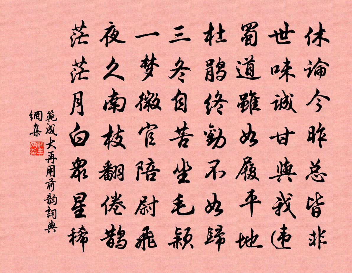 詩詞名句歷史字典書法欣賞書法字典國語詞典說文解字康熙字典古漢語字典標 題 作 者 詩 句 再用前韻作者:范成大 朝代:宋代再用前韻原文休論今昨總皆非,世味誠甘與我違。蜀道雖如履平地,杜鵑終勸不如歸。三冬自苦坐毛穎,一夢微官陪尉飛。夜久南枝翻倦鵲,茫茫月白眾星稀。詩詞問答問:再用前韻的作者是誰?答:范成大問:再用前韻寫於哪個朝代?答:宋代問:范成大的名句有哪些?答:范成大名句大全范成大再用前韻書法欣賞再用前韻書法作品詩詞推薦送建州通判沈太博梅堯臣〔宋代〕昔聞醉翁吟,是沈夫子所作。今聽醉翁吟,是沈夫子所彈。聲如冰凘下石灘,嚼齧碎玉遶齒寒。四坐整衣容色端,逢故人張籍〔唐代〕山東一十餘年別,今日相逢在上都。說盡向來無限事,相看摩捋白髭鬚。輕薄篇李益〔唐代〕豪不必馳千騎,雄不在垂雙鞬。天生俊氣自相逐,出與鵰鶚同飛翻。朝行九衢不得意,下鞭走馬城西原。忽聞燕雁留城寄曠翁艾性夫〔宋代〕六年不見雲巢老,端擬此來消渴心。花落鳥啼春事闊,不知何處倚闌吟。胡羊二首岳珂〔宋代〕{左冗上加丶右辱}毛吹朔雪,細肋臥晴沙。曉牧尾搖扇,春遊項引車。湩流便逐草,酪膩正需茶。日夕歸棲處,雜曲歌辭苦熱行僧皎然〔唐代〕六月金數伏,茲辰日在庚。炎曦曝肌膚,毒霧昏檐楹。安得奮翅翮,超遙出雲征。不知天地心,如何匠生成。火德江行四首陳造〔宋代〕帆桅飛去東空明,人倚東風兩翼生。世事快人如此否,日斜三百不留行。無相贊釋師範〔宋代〕重如山,靜如水。輕輕觸著,雙眉剔起。題陳秀才園林司馬光〔宋代〕劇談驚滿座,音貌獨琅然。可惜酈生老,誰知蘇季緊。青囊世外藥,碧幕醉中天。不佩黃金印,都緣負郭田。訪隱者葉紹翁〔宋代〕開門迎客著山袍,井畔獼猴一樹桃。兒向草間尋落果,妻從牆角過香醪。舊栽松子今能大,新起茅堂不甚高。歷遍薌岩山居孟夏二十絕舒岳祥〔宋代〕鳥鳴青溪中,人行彩虹外。洗藥歸去來,聲跡兩幽晦。和石學士直舍晨興宋祁〔宋代〕高閣休殘暝,層梁逼早暾。芳風萬年樹,殘月九重閽。枕歇淵魚夢,裘貪睡貉溫。星杓壓城角,天漢落河源。肅唱官冷仇遠〔宋代〕不負平生下澤車,宦遊卜宅亦村墟。家貧累重須乾祿,官冷身閒可讀書。高柳每聞鶯婭奼,破籬時度竹蕭疏。西南客吟釋行海〔宋代〕花落花開春自述,白雲流水客東西。獨眠野店無燈火,雨濕黃昏杜宇啼。和吉父贈谹父詩王洋〔宋代〕瘧有黎邱競出奇,操矛不報主人知。問渠去處終無定,與我周旋便有期。貧似淵明猶愛酒,瘦如工部只緣詩。但教竹溪直院盛稱起予草堂詩之善暇日覽之多有可劉克莊〔宋代〕祖席為誰設,諸公愧二疏。雖無人主眷,賴有史官書。故里山川近,都門供帳初。百城圖畫筆,幾兩送寒車。老氏挽崔舍人方有開〔宋代〕士有千齡遇,名傳百世榮。文章肇權直,淮海出儒英。紫禁菸花邃,黃麻黼黻明。方深丹扆眷,痛惜掩佳城。明發黃土龕過高路楊萬里〔宋代〕又過崢嶸雨峽間,也無溪水也無田。嶺雲放腳寒垂地,山麥掀髯翠拂天。碧玉屏風吹不倒,青綾步障買無錢。詩人論語絕句一百首張九成〔宋代〕富貴要之不可求,求之無不反招尤。何如且只從吾好,他若來時不自由。漁父詞趙孟頫〔元代〕渺渺煙波一葉舟。西風落木五湖秋。盟鷗鷺,傲王侯。管甚鱸魚不上名句推薦羈心積秋晨,晨積展游眺。謝靈運《七里瀨》 今年游寓獨游秦,愁思看春不當春。杜審言《春日京中有懷》 秋菊堪餐,春蘭可佩,留待先生手自栽。辛棄疾《沁園春·帶湖新居將成》 小時不識月,呼作白玉盤。李白《古朗月行》 今朝北客思歸去,回入紇那披綠羅。劉禹錫《竹枝詞二首·其二》 得成比目何辭死,願作鴛鴦不羨仙。盧照鄰《長安古意》 還將兩行淚,遙寄海西頭。孟浩然《宿桐廬江寄廣陵舊遊》 明妃一朝西入胡,胡中美女多羞死。李白《于闐採花》 斷送一生憔悴,只銷幾個黃昏。趙令畤《清平樂·春風依舊》 君不密則失臣,臣不密則失身,幾事不密則害成。是以君子慎密而不出也。佚名《易傳·繫辭傳上·第八章》