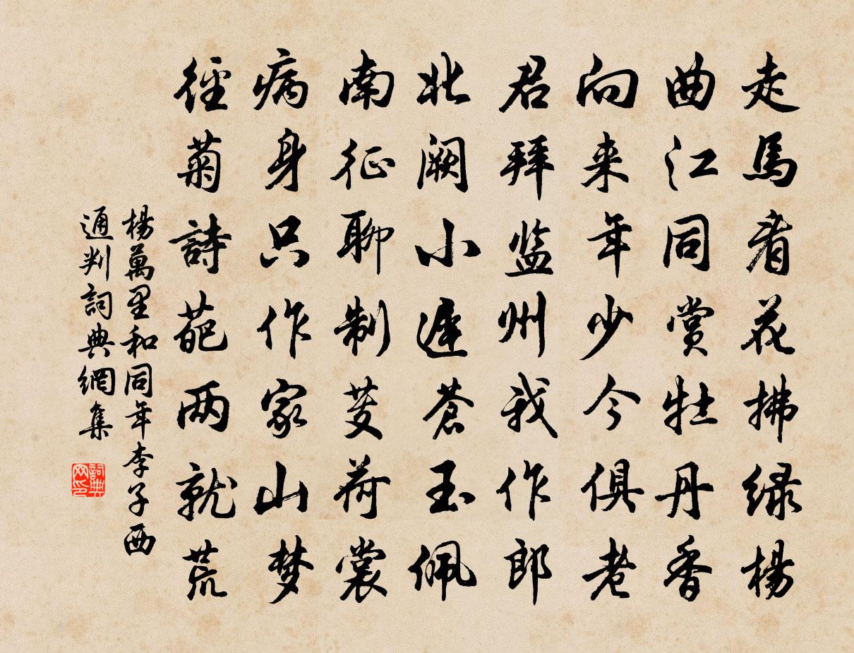 走馬看花拂綠楊,曲江同賞牡丹香。向來年少今俱老,君拜監州我作郎。