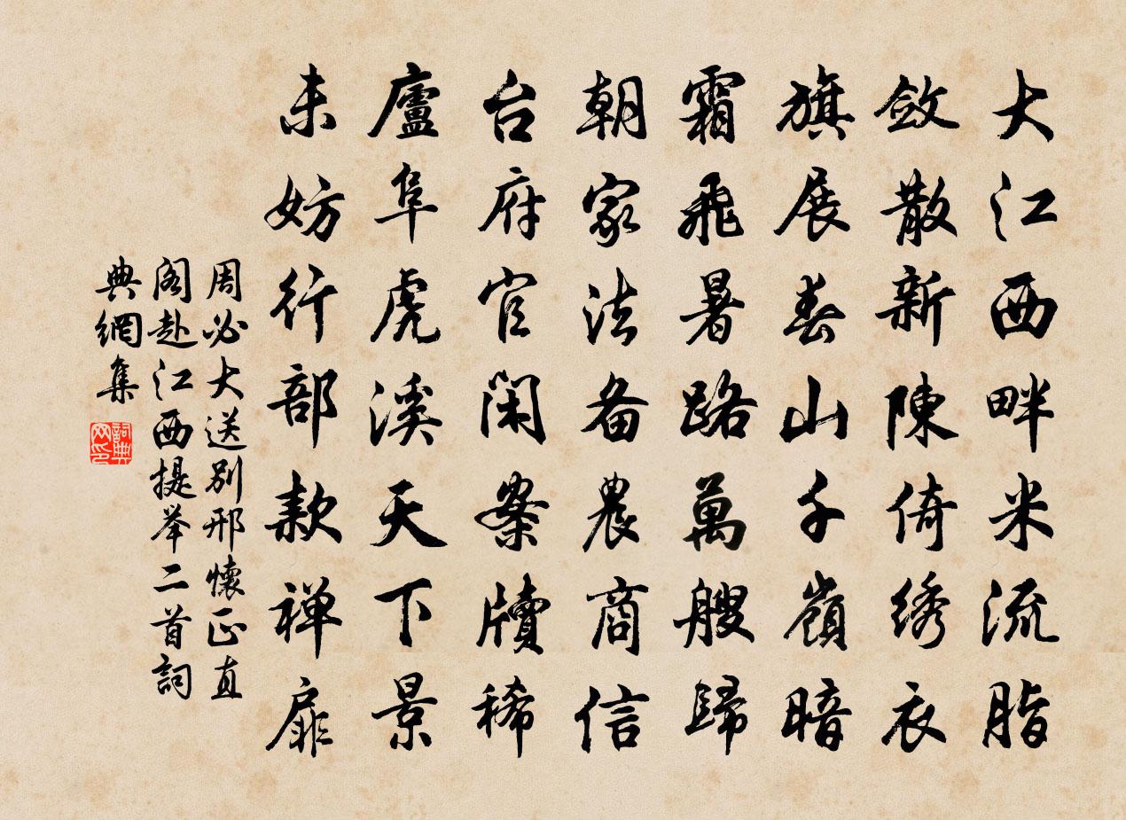 詩詞名句歷史字典書法欣賞書法字典國語詞典說文解字康熙字典古漢語字典標 題 作 者 詩 句 送別邢懷正直閣赴江西提舉二首作者:周必大 朝代:宋代原文大江西畔米流脂,斂散新陳倚繡衣。旗展春山千嶺暗,霜飛暑路萬艘歸。朝家法備農商信,台府官閒案牘稀。廬阜虎溪天下景,未妨行部款禪扉。詩詞問答問:《送別邢懷正直閣赴江西提舉二首》的作者是誰?答:周必大問:該詩寫於哪個朝代?答:宋代書法欣賞送別邢懷正直閣赴江西提舉二首書法作品詩詞推薦挽殷君二首劉宰〔宋代〕市人於利較毫釐,之子能權取與宜。此去窮閻風雨夜,歲多愁坐憶年時。水龍吟 暇日過田學士村居,乃父為司徒張野〔元代〕翠微冷浸清溪,洞天惟許仙家住。主人新葺,柳亭梅塢,竹軒松戶。綠野風煙,東山泉石,少人知處。怕椿翁早晚滿庭芳曹冠〔宋代〕榴艷噴紅,槐陰凝綠,薰風初扇微涼。新荷舒蓋,翠色映波光。時見金鱗戲躍,聽鶯聲、巧囀垂楊。誰知我,身閒浣溪沙周邦彥〔宋代〕雨過殘紅濕未飛,疏籬一帶透斜暉,游蜂釀蜜竊香歸。 金屋無人風竹亂,衣篝盡日水沈微,一春須有憶人時。次韻戴帥初見寄二首陳著〔宋代〕胸次玲瓏達事端,入山買屋貯清寒。奉親最樂危時見,與俗相忘實處看。閒輟琴書翻兔冊,旋添竹樹隔牛闌。疏衣禮四祖大醫禪師塔釋正覺〔宋代〕祖道已傳,黃梅妙齡。幻泡忽滅,白淨無形。真相堂堂照膏火,教音默默鳴風鈴。老松掛月寒方夜,凍鶴巢雲夢未金剛隨機無盡頌莊嚴淨土分第十釋印肅〔宋代〕溪山曉來深,片光萬物新。相識滿天下,知心能幾人。久雨二首李彌遜〔宋代〕帶雨山雲不肯明,草泥封徑斷人行。竹林縱有鳥飛路,十日不聞鶗鴃聲。歌吳彩鸞〔唐代〕若能相伴陟仙壇,應得文簫駕彩鸞。自有繡襦並甲帳,瑤台不怕雪霜寒。閒居釋行海〔宋代〕屋頭煙樹綠婆娑,最愛樵鄰夜唱歌。獨坐小窗山寂寂,不知門外月明多。吳姬曲五首戴表元〔宋代〕吳姬歸,潮光燭影紅輝輝。中心有語不敢吐,安得作月生汝衣。送仲連梅堯臣〔宋代〕別緒如亂絲,欲理還不可。卻悲嬌女詩,寧戀更效左。是時遠道懷,紛紛上歸舸。憐君正如此,豈任風雨俀。出微王峽讀子厚詩恍然偶作二絕句張嵲〔宋代〕驚湍絕壁窮天險,山水如斯世莫知。林邑峰巒瘴江水,發揮須待柳州詩。上知府大同王太尉六首魏野〔宋代〕五等諸侯稀五福,三朝官只欠三台。下車一變熙熙景,賓合多開印少開。風雨陸游〔宋代〕七十年來樂太平,白頭父子事春耕。因思世事悲身事,更聽風聲雜雨聲。四海故人強半死,一襟清淚對誰傾?新春毀馮雲山書館中偶像洪秀全〔清代〕神天之外更無神,何故愚頑假作真!只為本心渾天卻,焉能超出在凡塵。和李子儀韻四首吳芾〔宋代〕我自吾兒病,匆匆去若逃。天寒霜似雪,山險石如刀。已得平安信,寧辭往復勞。故園歸去也,醉里甚游遨。點絳唇邵亨貞〔元代〕萼綠仙人,孤山雪後相逢處。舊時村路。璨璨琅*樹。玉出藍田,不受纖塵*。長懷古。羅浮風度。夢逐麼禽去。念奴嬌(登平江齊雲樓,夜飲雙瑞堂,呈雷吏部)張鎡〔宋代〕東吳名勝,有高樓直在,浮雲齊處。十二闌乾邀遠望,歷歷斜陽煙樹。香徑人稀,屧廊山繞,往事今何許。一天和月下杲飲七首楊萬里〔宋代〕坐久輕雲次第開,月光飛入酒林來。今霄只有半邊月,一半桂枝何處栽。名句推薦江流石不轉,遺恨失吞吳。杜甫《八陣圖》 聞君有兩意,故來相決絕。卓文君《白頭吟》 強龍不壓地頭蛇。吳承恩《西遊記·第四十五回》 金風玉露一相逢,便勝卻人間無數。秦觀《鵲橋仙·纖雲弄巧》 聽於無聲,視於無形。戴聖《禮記·曲禮上》 相思休問定何如。情知春去後,管得落花無。晁沖之《臨江仙·憶昔西池池上飲》 謗書盈篋不復辯,脫身來看江南山。謝逸《送董元達》 唯有長江水,無語東流。柳永《八聲甘州·對瀟瀟暮雨灑江天》 聽風聽雨過清明。愁草瘞花銘。吳文英《風入松·聽風聽雨過清明》 禮輕情意重,千里送鵝毛!緬伯高《千里送鵝毛(將鵝貢唐朝)》