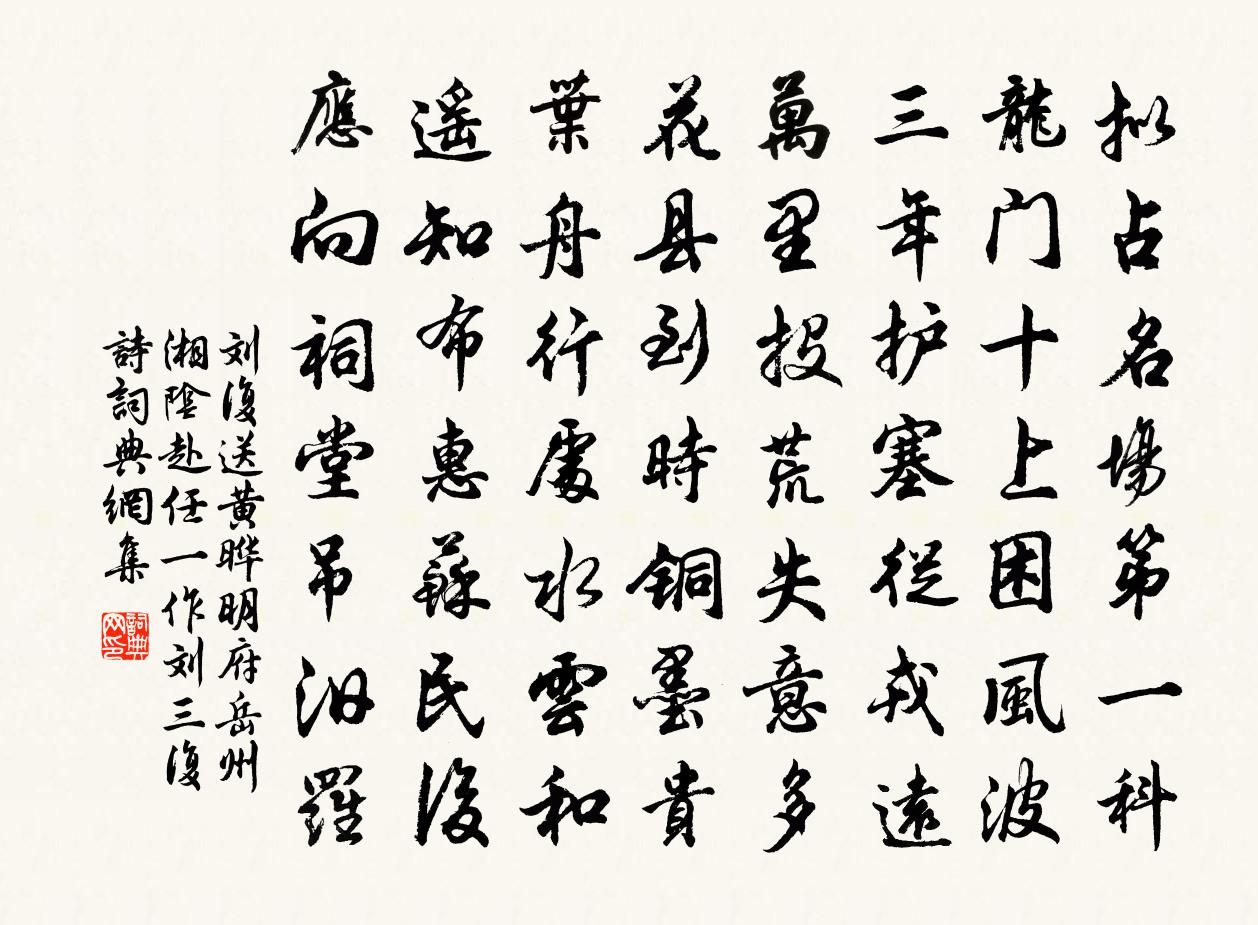 詩詞名句歷史字典書法欣賞書法字典國語詞典說文解字康熙字典古漢語字典標 題 作 者 詩 句 送黃曄明府岳州湘陰赴任(一作劉三復詩)作者:劉復 朝代:唐代原文擬占名場第一科,龍門十上困風波。三年護塞從戎遠,萬里投荒失意多。花縣到時銅墨貴,葉舟行處水雲和。遙知布惠蘇民後,應向祠堂吊汨羅。詩詞問答問:《送黃曄明府岳州湘陰赴任(一作劉三復詩)》的作者是誰?答:劉復問:該詩寫於哪個朝代?答:唐代問:該詩是什麼體裁?答:七律書法欣賞送黃曄明府岳州湘陰赴任(一作劉三復詩)書法作品注釋全唐詩:卷305-22詩詞推薦賦得彭祖樓送楊德宗歸徐州幕盧綸〔唐代〕四戶八窗明,玲瓏逼上清。外欄黃鵠下,中柱紫芝生。每帶雲霞色,時聞簫管聲。望君兼有月,幢蓋儼層城。望江南/憶江南方岳〔宋代〕梅欲老,撐月過南徐。家口縱多難減鶴,路程不遠易攜書。只是廢春鋤。霜滿袖,茶灶借僧廬。湖海甚豪今倦矣,登快哉亭有屬賀鑄〔宋代〕南浦東風拂水文,汀洲芳草綠羅裙。桃花舊葉應相望,楊葉新聲我獨聞。酸鼻可憐香欲絕,斷腸不待酒初醺。斜陽新移北廳因貽同院諸公兼呈暢博士盧綸〔唐代〕華軒邇台座,顧影忝時倫。弱質偃彌曠,清風來亦頻。恩輝坐凌邁,景物恣芳新。終乃愧吾友,無容私此身。贈孫顯世詩陸雲〔魏晉〕制動以靜。秘景在隆。雲根可棲。樂此隈岑。墨梅三絕張於文〔宋代〕年端喚醒玉梅魂,滿袖春風不見痕。未許捲簾新月上,卻教煙雨惱黃昏。李寅之招飲同登九江城方回〔宋代〕覆卻罔攸測,理亂非所任。兀兀兔株意,哀哀鶯谷音。識驥伯樂眼,放麑西巴心。懷惠在夙昔,觀過匪斯今。園櫻傷老也司馬光〔宋代〕個性泛舟,載縱載橫。白日淨傾,飄風載驚。嗟我老矣,發脫齒零。胡為百憂,勞此餘生。王可封臨終許渾〔唐代〕十世為儒少子孫,一生長負信陵恩。今朝埋骨寒山下,為報慈親休倚門。讀蘭台詩鄭剛中〔宋代〕天遣長庚下碧空,再將主白作坡翁。不然安得四二九,還宿潯陽太極宮。南山(一作賀朝清詩)賀朝〔唐代〕湖北雨初晴,湖南山盡見。岩岩石帆影,如得海風便。仙穴茅山峰,彩雲時一見。邀君共探此,異籙殘幾卷。禹穴林景熙〔宋代〕古蹟微茫久,雲深鎖薜蘿。洞前青壁坼,世外素書多。猿狎垂山木,龍靈起井波。相傳通海眼,魚網得金斜。樵屋釋普濟〔宋代〕鬻薪無價嶺南歸,尚有兒孫在翠微。執樹縛苑門戶別,離離荊棘惹人衣。滿庭芳 攢三字王處一〔元代〕三光。從道,神守清涼。悟正,遙唱滿庭芳。上朝歸去,性、光泛純陽。覷聞者,同我證真常。我開化,信順,福送張舍人從軍汪元量〔宋代〕大笑出門去,誰能筆硯囚。十年渾不調,萬里欲先侯。衰爾吾將老,飛揚子未休。他年身退遁,肯伴赤松游。留番城熊瑞〔宋代〕半年在家少,萬事出門寬。酒買官酤貴。詩存俗句難。雨余雲影濕,秋杪雁聲寒。今古蒼茫意,斜陽獨倚闌。烏江東鄉往還馬上作二首之一賀鑄〔宋代〕黃塵隨馬染征衣,十里江皋送客暉。廢井草荒蛙黽怒,下田沙漲芋魁肥。解纓拂樹弄清淺,棋榻掃雲飛翠微。人生正言田學士況書言上庠祭酒聽北軒予所種竹滋宋祁〔宋代〕昔承上庠乏,時竹北堂軒。飭吏勤浸灌,冉冉榮孤根。日晏到官下,對賞忘塵喧。海月影宵戺,天風籟晨顛。去年小橋姜特立〔宋代〕小橋橫野澗,物色自陰清。終日相晤語,松聲與水聲。哀虢縣令猶子箅張舜民〔宋代〕匍匐岐山下,三呼已過時。臧孫雖有後,伯道竟無兒。自是終身痛,空留一縣悲。老人休雨淚,轉面即逢伊。名句推薦爾曹身與名俱滅,不廢江河萬古流。杜甫《戲為六絕句·其二》 誰謂含愁獨不見,更教明月照流黃。沈佺期《古意呈補闕喬知之 / 古意 / 獨不見》 聖人忘情,最下不及情;情之所鍾,正在我輩。劉義慶《世說新語·傷逝》 夜吟敲落霜紅,船傍楓橋系。吳文英《荔枝香近·送人游南徐》 審定有無與其實虛,隨其嗜欲以見其志意。王詡《鬼谷子·捭闔》 去年夜半橫江夢,倚危檣,參差曾賦劉辰翁《桂枝香· * 人去》 眾中聞謦欬,未語知鄉里。蘇軾《送金山鄉僧歸蜀開堂》 驚風飄白日,忽然歸西山曹植《贈徐幹詩》 可憐赤壁爭雄渡,唯有蓑翁坐釣魚。杜牧《齊安郡晚秋》 王母歡闌瓊宴罷,仙人淚滿金盤側。文天祥《滿江紅·代王夫人作》