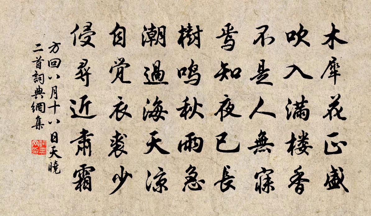 詩詞名句歷史字典書法欣賞書法字典國語詞典說文解字康熙字典古漢語字典標 題 作 者 詩 句 八月十八日天曉二首作者:方回 朝代:宋代八月十八日天曉二首原文木犀花正盛,吹入滿樓香。不是人無寐,焉知夜已長。樹鳴秋雨急,潮過海天涼。自覺衣裘少,侵尋近肅霜。詩詞問答問:八月十八日天曉二首的作者是誰?答:方回問:八月十八日天曉二首寫於哪個朝代?答:宋代方回八月十八日天曉二首書法欣賞八月十八日天曉二首書法作品詩詞推薦大梁途中作王昌齡〔唐代〕怏怏步長道,客行渺無端。郊原欲下雪,天地稜稜寒。當時每酣醉,不覺行路難。今日無酒錢,悽惶向誰嘆。贈黎安二生序曾鞏〔宋代〕趙郡蘇軾,余之同年友也。自蜀以書至京師遺余,稱蜀之士,曰黎生、安生者。既而黎生攜其文數十萬言,安生攜金錢花盧子發〔唐代〕輪廓休夸四字書,紅窠寫出對庭除。時時買得佳人笑,本色金錢卻不如。送臻師二首李商隱〔唐代〕昔去靈山非拂席,今來滄海欲求珠。楞伽頂上清涼地,善眼仙人憶我無。苦海迷途去未因,東方過此幾微塵。何當偈頌二十二首釋妙倫〔宋代〕月臨粉壁間尤白,燭入籠里花更紅。夜冷井邊聞落葉,已驚秋色到梧桐。題潘氏高遠台王柏〔宋代〕數曲梯階稍欠寬,略移武步到仙寰。詩懷納盡雙溪景,眼力推開千里山。方檻小欹煙雨外,飛蓬斜插鬥牛間。馮虛日曜上人還潤州皎然〔唐代〕送君何處最堪思,孤月停空欲別時。露茗猶芳邀重會,寒花落盡不成期。鶴令先去看山近,雲礙初飛到寺遲。莫倚善利閣次伯仁所題趙子良畫四首裘萬頃〔宋代〕箜篌君鄉來,分明記江樹。想君詩成時,夢作白鷗去。生查子吳潛〔宋代〕夜夜雲氣浮,帶得香菸濕。萬籟本無情,一一秋聲入。須臾離合間,應笑兒曹泣。新雨漲鄞江,明日桅檣立。旅悶十首方回〔宋代〕運啟奎占瑞,途殫彗告危。晚生違盛際,後死值衰期。何啻三歸備,寧虞九鼎移。焉知專夜妾,竟孕別人兒。宴清都(中呂)周邦彥〔宋代〕地僻無鐘鼓。殘燈滅,夜長人倦難度。寒吹斷梗,風翻暗雪,灑窗填戶。賓鴻謾說傳書,算過盡、千儔萬侶。始信食蓮有感戲為古興新體舒岳祥〔宋代〕青蘋先各秋,調遣入窗幾。荷花如六郎,一笑忽墮水。美人坐生愁,攬衣中夜起。繁華難久持,零落自茲始。所思生查子·關山魂夢長晏幾道〔宋代〕關山魂夢長,魚雁音塵少。兩鬢可憐青,只為相思老。歸夢碧紗窗,說與人人道。真箇別離難,不似相逢好。應制賀邊軍支春衣柳公權〔唐代〕去歲雖無戰,今年未得歸。皇恩何以報,春日得春衣。挾纊非真纊,分衣是假衣。從今貔武士,不憚戍金微。觀潮閣林芘〔宋代〕江山不受范,偃蹇散莫收。領略得要會,聚此百尺樓。霽色明千峰,斜陽帶歸舟。堪洗北客塵,似脫南冠囚。二子贈王建司馬姚合〔唐代〕久向空門隱,交親亦不知。文高輕古意,官冷似前資。老覺僧齋健,貧還酒債遲。仙方小字寫,行坐把相隨。行旅圖唐寅〔明代〕十年行李憶關山,紈褲何堪遣路艱。今日酒杯歌袖畔,竟忘門外到長安。寄張達道曹勛〔宋代〕茅峰何山亦何好,瑤木琪華並三島。其間岩洞邃且深,隱居仙人得窮討。遠業已跨雪色驢,諸孫何能玉顏老。黑虎傷虞將軍(一作傷河東虞押衙)許渾〔唐代〕白首從軍未有名,近將孤劍到江城。巴童戍久能番語,胡馬調多解漢行。對雪夜窮黃石略,望雲秋計黑山程。可憐頌古三十六首釋惟一〔宋代〕老倒趙州無本據,翻手為雲覆手雨,覿面當機不覆藏,往往少人知落處。知落處,是甚閒家具。名句推薦昨夜江邊春水生,艨艟巨艦一毛輕。朱熹《活水亭觀書有感二首·其二》 天地有正氣,雜然賦流形。文天祥《正氣歌》 十五彩衣年,承歡慈母前。孟浩然《送張參明經舉兼向涇州覲省》 二月巴陵日日風,春寒未了怯園公。陳與義《春寒》 露清枕簟藕花香,恨悠揚。顧敻《虞美人·觸簾風送景陽鍾》 聞名不如見面,見面勝似聞名。施耐庵《水滸傳·第三回》 得不為喜,去不為恨。司馬遷《史記·日者列傳》 善化不足,惡化有餘。佚名《增廣賢文·上集》 飛蓬各自遠,且盡手中杯。李白《魯郡東石門送杜二甫》 福無雙至,禍不單行。張南莊《何典·第三回》