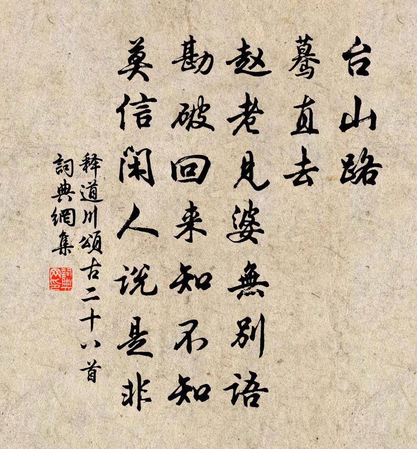 詩詞名句歷史字典書法欣賞書法字典國語詞典說文解字康熙字典古漢語字典標 題 作 者 詩 句 頌古二十八首作者:釋道川 朝代:宋代頌古二十八首原文台山路,驀直去,趙老見婆無別語。勘破回來知不知,莫信閒人說是非。詩詞問答問:頌古二十八首的作者是誰?答:釋道川問:頌古二十八首寫於哪個朝代?答:宋代釋道川頌古二十八首書法欣賞頌古二十八首書法作品詩詞推薦題韓亭韓木二首楊萬里〔宋代〕老大韓家十八郎,猶將雲錦製衣裳。至今南斗無精彩,只放文星一點光。吳容州仲一輓詞林光朝〔宋代〕竹屋繩橋自有村,牛山簫笛不堪聞。碑前更問何年月,為借容州舊使君。謝人惠丹藥齊己〔唐代〕別後聞餐餌,相逢訝道情。肌膚紅色透,髭發黑光生。仙洞誰傳與,松房自煉成。常蒙遠分惠,亦覺骨毛輕。春日雜言十一首趙蕃〔宋代〕渺渺春山啼杜鵑,開花解使碧山然。韓詩李賦紛難考,猶喜知名向謫仙。次雪峰空老韻二首曾幾〔宋代〕雪峰僧中龍,此道誰與共。蕭然兩伽陀,不舉似大眾。獨貽茶山老,以當蒲塞供。岩花與澗草,信手拈來用。孔明衛宗武〔宋代〕龍臥而長吟,胸次抱奇偉。立心不北向,特為三顧起。曹瞞下荊州,氣可吞權備。奮袂為一出,遂成鼎足勢。忠誠簡沈元陵求潮州韓文公廟碑並抄山谷碑詩二首趙蕃〔宋代〕公曾數載潮陽掾,筆力怪來韓與蘇。璧上廟碑當乞我,庶求涓滴潤焦枯。十山歌呈太守胡平一楊萬里〔宋代〕說似行人且細聽,螺岡門外莫宵征。前頭石斧韓婆嶺,第一單身不要行。孤竹圖唐寅〔明代〕歲寒有貞姿,孤竹勁而直。虛心足以容,堅節不撓物。可比君子人,窮年交不易。曄曄桃李花,旦暮改顏色。嘉禾百詠汾湖張堯同〔宋代〕我是滄浪叟,閒來系釣{左舟右雙}。如何一湖水,豐秀半吳江。攤破江城子/江城梅花引程垓〔宋代〕娟娟霜月又侵門。對黃昏。怯黃昏。愁把梅花,獨自泛清尊。酒又難禁花又惱,漏聲遠,一更更,總斷魂。斷魂。題梁國公主池亭姚合〔唐代〕平陽池館枕秦川,門鎖南山一帶煙。素奈花開西子面,綠榆枝種沈郎錢。裝簾玳瑁隨風落,庭岸趁暖眠。寂寞十月十九日大風作寒閉戶竟日陸游〔宋代〕霜風捲地起,落葉擁蝸廬。終日澹無事,一窗寬有餘。坐多知力耗,食少覺心虛。嬾惰無新句,松聲忽起予。勵學王建〔唐代〕買地不肥實,其繁系耕鑿。良田少鋤理,蘭焦香亦薄。勿以聽者迷,故使宮徵錯。誰言三歲童,還能分善惡。孜孜寄兗州張龍圖文潛二首陳師道〔宋代〕剩喜開三面,旋聞乞一州。力難隨鳥翼,行復立螭頭。今日騏驎閣,當年鸚鵡洲。寄書愁不達,書達得無愁。丙子兵禍台溫為烈寧海雖經焚掠然耕者不廢丁舒岳祥〔宋代〕事過清眠足,心寬緩步宜。古人無限事,煙蹙幾修眉。陳子厚送韶鴨將以七絕因次其韻吳芾〔宋代〕湖光深處恣沉浮,未讓波間鷺與鷗。舊侶此時應羨汝,欲來相就苦無由。文昌寓直鄭谷〔唐代〕何遜空階夜雨平,朝來交直雨新晴。落花亂上花磚上,不忍和苔蹋紫英。新州鹿鳴宴致語口號胡寅〔宋代〕秋氣清高肅雁行,賢侯勸駕會黃堂。賓朋滿座曳珠履,鼓吹喧天飛羽觴。題柱棄繻俱有志,班荊折桂正相望。明年時賢多以不才誚我因自詠宋庠〔宋代〕我本無心士,終非濟世才。虛舟人莫怒,疑虎石曾開。蚊負愁山重,葵傾喜日來。欲將嘲強解,真意轉悠哉。名句推薦剪不斷,理還亂,是離愁。別是一般滋味在心頭。李煜《相見歡·無言獨上西樓》 紅葉晚蕭蕭,長亭酒一瓢。許渾《秋日赴闕題潼關驛樓 / 行次潼關逢魏扶東歸》 楊柳絲絲弄輕柔,煙縷織成愁。王雱《眼兒媚·楊柳絲絲弄輕柔》 白狼河北音書斷,丹鳳城南秋夜長。沈佺期《古意呈補闕喬知之 / 古意 / 獨不見》 朝陽不再盛,白日忽西幽。阮籍《詠懷八十二首·其三十二》 屈指數春來,彈指驚春去。高觀國《卜運算元·泛西湖坐間寅齋同賦》 老來情味減,對別酒,怯流年。辛棄疾《木蘭花慢·滁州送范倅》 重九開秋節,得一動宸儀。韋安石《奉和九日幸臨渭亭登高應制得枝字》 田田初出水,菡萏念嬌蕊。龔翔麟《菩薩蠻·題畫》 北極懷明主,南溟作逐臣。宋之問《途中寒食題黃梅臨江驛寄崔融》