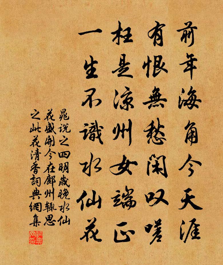 詩詞名句歷史字典書法欣賞書法字典國語詞典說文解字康熙字典古漢語字典標 題 作 者 詩 句 四明歲晚水仙花盛開今在鄜州輒思之此花清香作者:晁說之 朝代:宋代原文前年海角今天涯,有恨無愁閒嘆嗟。枉是涼州女端正,一生不識水仙花。詩詞問答問:《四明歲晚水仙花盛開今在鄜州輒思之此花清香》的作者是誰?答:晁說之問:該詩寫於哪個朝代?答:宋代書法欣賞四明歲晚水仙花盛開今在鄜州輒思之此花清香書法作品詩文賞析【原題】:四明歲晚水仙花盛開今在鄜州輒思之此花清香異常婦人戴之可留之日為多詩詞推薦米元章臨右軍玉潤帖贊岳珂〔宋代〕熠煜客星,顒逵之伍乎。軒冕相禪,泉石之嫵乎。美疢惡石,天所痼乎。情之所鍾,同此趣乎。排九閶之雲,巫鹹南鄉子許有壬〔元代〕暑室困蒸炊。呼鶴前來聽詠詩。鶴告不餐空碌碌,隨雞。諸仆無恩但有威。雲海夙相期。忍使清齋十二時。主者不假節宋祁〔宋代〕誤持軍印攝中牙,朔雪添成兩鬢華,大抵不侯寧戰罪,由來寡要是儒家。山南近暖先迎日,樹北緣寒晚作花。歲晏【南呂】一枝花_詠惜花春起佚名〔元代〕詠惜花春起早花間杜宇啼,柳外黃鶯囀。銀河青耿耿,玉露滴涓涓。潛入花園,露濕殘妝面,風吹雲髻偏。畫閣內悼張寺丞薛嵎〔宋代〕五馬歸來絕送迎,全將漚泡視浮榮。宅依林麓樓台小,門有詩書氣味清。身後只如曾冷淡,墓頭曾是手經營。夫人高宗祀明堂前朝享太廟二十一首真宗〔宋代〕歆我齋明,威行如存。牲牲是享,圭玉其溫。群公執事,變既駿奔。禮成告入,鹹福黎元。和梅鏡寄韻何夢桂〔宋代〕未能生翼化鯤魚,誰御泠風問太初。十載青衫關洛客,半生白首楚橋書。蹇驢豈解思長道,病鶴徒知戀舊廬。世有題處士黃公山居戴復古〔宋代〕行盡松坡與竹坡,沿溪窈窕上岩阿。山深每恨客來少,寺近莫教僧到多。但覺洞中人不老,不知雲外事如何。邊頭佛鑒和尚贊釋子益〔宋代〕雨過五峰,雲橫玉幾。日面月面,只這便是。道是佛鑒,舌拄梵天。道非佛鑒,眉毛拖地。更言兩對君王,三奉詔梅花落楊炯〔唐代〕窗外一株梅,寒花五出開。影隨朝日遠,香逐便風來。泣對銅鉤障,愁看玉鏡台。行人斷訊息,春恨幾裴回。光宗皇帝待月詩御書贊岳珂〔宋代〕疏篁陰陰,長松矯矯。苔靜雲閒,山清月皎。樂以心會,興因天隨。以詩觀詩,是謂管窺。晏齋余自名也故常以榜自隨乃以名廳事之東偏趙蕃〔宋代〕此晏名齋懼不安,居閒從仕莫殊看。蔥羹麥飯自可飽,惟去不須如井丹。村橋羅隱〔唐代〕村橋酒旆月明樓,偶逐漁舟系葉舟。莫學魯人疑海鳥,須知莊叟惡犧牛。心寒已分灰無焰,事往曾將水共流。除卻問邵武守劉無競遜求邵武紅硃三首王邁〔宋代〕自憐凡骨本難仙,安得泥壇七返丹。欲使身輕生羽翼,乞丹須是問劉安。初入姑蘇會飲鄭獬〔宋代〕涼風飄灑入高閣,滿城綠樹飛雲濤。渴來夢吞滄海闊,醉後眼掛青天高。湘江奼女碧瑤佩,金谷謫仙紅錦袍。吳兒雪後游石湖陳深〔宋代〕眾峰戴雪玉催鬼,風定湖光鏡面開。山色可堪西子笑,溪聲曾送越兵來。天寒野水搖孤艇,日落浮圖封古台。回首再贈硯工楊全長句方回〔宋代〕誰鑿山中龍尾石,遍與人間供翰墨。蛟螭妒嫉互盤踞,鬼神守護勤呵叱。苟非其人不輕出,似覺天公深愛惜。磨硯【越調】天淨沙_梅梢月黃昏張弘范〔元代〕梅梢月黃昏低映梅枝,照人兩處相思,那的是愁腸斷時。彎彎何以?渾如宮樣眉兒。西風落葉長安,夕陽老雁關山初冬即事白玉蟾〔宋代〕搘頤默默靠柴扉,頓放詩題塞翠微。三徑寒松含宿雨,一川衰草臥斜暉。孤煙白處丫峰露,亂葉紅邊個鳥歸。觸目次韻張公遠二首張耒〔宋代〕襄王坐上微詞客,子建車前步水妃。瞥過低鬟流盼處,爭先含笑獨來時。東邊日下終無雨,闕上書時合有碑。腸斷名句推薦嘆十年心事,休休莫莫。吳潛《滿江紅·豫章滕王閣》 雨恨雲愁,江南依舊稱佳麗。王禹偁《點絳唇·感興》 寒雨連天夜入吳,平明送客楚山孤。王昌齡《芙蓉樓送辛漸二首》 慈母倚門情,遊子行路苦。王冕《墨萱圖·其一》 見人不正,雖貴不敬也;見人有污,雖尊不下也。司馬遷《史記·日者列傳》 秋娘渡與泰娘橋,風又飄飄,雨又蕭蕭。蔣捷《一剪梅·舟過吳江》 不知江月待何人,但見長江送流水。張若虛《春江花月夜》 腳踏車欲問邊,屬國過居延。王維《使至塞上》 疊嶂西馳,萬馬迴旋,眾山欲東。辛棄疾《沁園春·靈山齋庵賦時築偃湖未成》 安危在出令,存亡在所任。司馬遷《史記·楚元王世家》