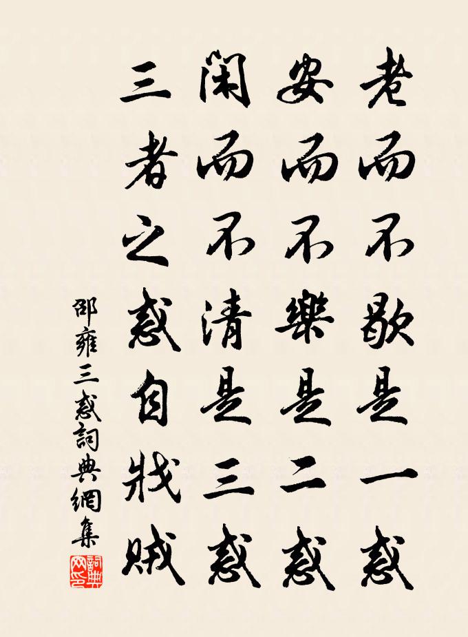 詩詞名句歷史字典書法欣賞書法字典國語詞典說文解字康熙字典古漢語字典標 題 作 者 詩 句 三惑作者:邵雍 朝代:宋代三惑原文老而不歇是一惑,安而不樂是二惑。閒而不清是三惑,三者之惑自戕賊。詩詞問答問:三惑的作者是誰?答:邵雍問:三惑寫於哪個朝代?答:宋代邵雍三惑書法欣賞三惑書法作品詩詞推薦十二月三日對月王冕〔元代〕今夜初生月,客中仍獨看。遙憐吾老幼,未解脫饑寒。破壁簞瓢壘,疏梅霜雪團。再思先子訓,默默淚闌乾。二世劉克莊〔宋代〕失國之君多咎政,興王者作著休符。亡秦天告由胡亥,非謂長城外有胡。小桃紅·雜詠盍西村〔元代〕海棠開過到薔薇,春色無多味。爭奈新來越憔悴。教他誰?小環也似知人意,疏簾捲起,重門不閉,要看燕雙飛。恣逍遙王哲〔元代〕物物拈來,般般打破。惺惺用、玉匙金鎖。瀝瀝澄源,炎火焰火。盈盈處,上下倒顛換過。妙妙神機,玄玄性果。霜天曉角(旅興)辛棄疾〔宋代〕吳頭楚尾。一棹人千里。休說舊愁新恨,長亭樹、今如此。宦遊吾倦矣。玉人留我醉。明日萬花寒食,得且住、為風流子佚名〔宋代〕淑景皇州滿,和風漸、催促柳花飛。過清明驟雨,五候台榭,青煙散入,新火開時。繡簾外、傍人飛燕子,映葉語子進昆仲俱和寄懷三詩複次韻趙蕃〔宋代〕吉途荊棘少人行,制禮難招魯二生。世上兒曹俱覆輸,公家伯仲自爭衡。一年欲盡見松秀,眾水莫污知渭清。保此將進酒白玉蟾〔宋代〕秋山蒼蒼秋雲黃,鴉浴鹹池忽扶桑。一月二十九日醉,百年三萬六千場。嗟君千太擎天來,而有萬卷懸河口。亂花秋夜陸游〔宋代〕侷促人間每鮮歡,秋來病骨愈酸寒。袷衣尚典雁聲過,斷簡未收雞唱殘。退士鬢毛紛似雪,老臣心事炳如丹。燈前瞎堂三句釋慧遠〔宋代〕我有不入驢耳句,日盈月昃未容呈。出門會得天平錯,未出門先舉向君。自維揚辭親暫歸里中登樓有作張紹文〔宋代〕爛漫家山景物妍,西風收拾下蠻箋。半分寒事梅花里,一段幽懷夕照邊。漁唱淒涼招野色,雁行縹緲帶晴煙。淮山過採石方岳〔宋代〕靈官行雨鱗幢濕,雷吼黑風吹水立。英雄不奈劍花寒。然犀夜午魚龍泣。雪浪掀天箭能急,紫茸投箠胡星失。吳宮合歡帶(林鐘商)柳永〔宋代〕身材兒、早是妖嬈。算風措、實難描。一個肌膚渾似玉,更都來、占了千嬌。妍歌 * ,鶯慚巧舌,柳妒纖腰。自遣家書張良臣〔宋代〕家住鄱城小洞天,經年烹鯉尚茫然。幾回鵲喜無訊息,吹殺燈花獨自眠。和鄧友直胡寅〔宋代〕坐看鼓樹溢枯流,快作南江汗漫遊。曉岸林巒光寫鏡,夜客風露冷涵秋。謏聞豈解論三豕,澀思真如曳九牛。但喜月夜陸游〔宋代〕小醉初醒月滿床,玉壺銀闕不勝涼。天風忽送荷香過,一葉飄然憶故鄉。無題二首高翥〔宋代〕風竹蕭蕭淡月明,孤眠真箇可憐生。不知昨夜相思夢,去到伊行是幾更。頌古九十八首釋印肅〔宋代〕標宗立法大瞞人,意氣彌陀局局親。黑白不分難下手,放過一著大驚神。季夏雜興陸游〔宋代〕熟睡一炊頃,清談數刻間。未言能近道,要得暫身閒。東宮生日六首甲午林光朝〔宋代〕仙掌秋容媚,銅樓曉色遲。猗蘭成漢殿,苞竹入周詩。鼎卜卿雲合,郊謀彩仗移。隆興乾道日,建武永平時。詹事名句推薦燕山雪花大如席,片片吹落軒轅台。李白《北風行》 私勿與人,謀必辟。來俊臣《羅織經·治下卷第三》 攀出牆朵朵花,折臨路枝枝柳。關漢卿《一枝花·不伏老》 滯雨通宵又徹明,百憂如草雨中生。薛逢《長安夜雨》 兒不嫌母醜,狗不嫌家貧。佚名《增廣賢文·下集》 上所用者,奸亦為忠;上所棄者,忠亦為奸。來俊臣《羅織經·察奸卷第八》 白頭宮女在,閒坐說玄宗。元稹《行宮》 七國三邊未到憂,十三身襲富平侯李商隱《富平少侯》 務本節用財無極。荀子《荀子·成相》 水流花謝兩無情,送盡東風過楚城。崔塗《春夕》