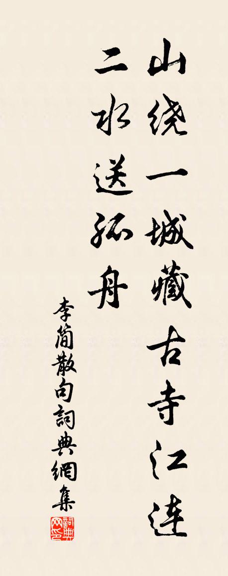詩詞名句歷史字典書法欣賞書法字典國語詞典說文解字康熙字典古漢語字典標 題 作 者 詩 句 句作者:李簡 朝代:宋代句原文山繞一城藏古寺,江連二水送孤舟。詩詞問答問:句的作者是誰?答:李簡問:句寫於哪個朝代?答:宋代李簡句書法欣賞句書法作品詩詞推薦為魏塘王居士留三日二首方回〔宋代〕水鄉熟處未全飢,舟楫安行盜亦稀。乘興聊為三日客,魏塘酒賤蟹螯肥。次韻毛君清居探菊蘇轍〔宋代〕眼前黃葉畏秋霜,耳畔啼蛩怨夜長。佳節欣聞近萸菊,清商試為奏伊涼。疏狂久笑謀生拙,貧病應憐為口忙。今日四月初二日出兵恰滿一月百姓未得下城方回〔宋代〕久謂兵當解,何知戰未休。屬方甜筍蕨,遽已艷葵榴。和陶擬古九首蘇軾〔宋代〕耡田種紫芝,有根未堪采。逡巡歲月度,太息毛髮改。晨朝玉露下,滴瀝投滄海。須芽忽長茂,枝葉行可待。夜燒梅花盛文韶〔宋代〕翠羽啁啾夜,空山偃蹇時。看人多冷眼,出手盡高枝。香細巡檐得,寒深踏雪知。紛紛後來者,紅紫莫矜奇。和沈仲一北湖十詠豫章閣陳傅良〔宋代〕人去岷峨水自流,豫章三字竟沈浮。懷人好上層樓看,木落山寒不肯秋。禪人並化主寫真求贊釋正覺〔宋代〕據胡床,握麈柄。句中起倒,機頭偏正。真得出思議,妙應亡眺聽。徹二儀萬象根源,識諸佛歷代性命。曲直逆順陋居五詠將徑汪莘〔宋代〕穿渠帶幽徑,列竹依清流。中有好鳥鳴,暮鎖星辰稠。北風攪雪花,更覺龍鳳遒。東皇憐歲寒,丹白如飛浮。細履題道院壁牟融〔唐代〕山中舊宅四無鄰,草淨雲和迥絕塵。神棗胡麻能飯客,桃花流水蔭通津。星壇火伏煙霞暝,林壑春香鳥雀馴。若使漁家傲楊無咎〔宋代〕菊暗枯秋已滿。棖黃橘綠冬初暖。草草杯盤成小宴。殷勤勸。尊前莫遣霞觴淺。兩鬢從教霜點半。人生最要長為伴山行葉茵〔宋代〕青山不識我姓字,我亦不識青山名。飛來白鳥似相識,對我對山三兩聲。和梁次張得酒之作吳芾〔宋代〕在處人爭饋五漿,風標端是紫微郎。已能遣興追工部,更欲消憂對杜康。闡教暫煩臨水泮,趨朝行見裛天香。老夫浣溪沙蘇軾〔宋代〕照日深紅暖見魚。連溪綠暗晚藏烏。黃童白叟聚睢盱。糜鹿逢人雖未慣,猿揉聞鼓不須呼。歸家說與採桑姑。賜陳摶宋太宗〔宋代〕曾向前朝出白雲,後來訊息杳無聞。如今若肯隨徵召,總把三峰乞與君。句嚴中和〔宋代〕畫扇題詩鸞背濕,銅彝煎腦鴨心香。鷓鴣天向子諲〔宋代〕召埭初逢兩妙年。遙林玉樹倚風前。疏梅影里春同醉,紅芰香中月一船。長悵恨,短因緣。空餘蝴蝶夢相連。誰知小三侄遠持兄嫂之命見訪於荒寒寂寞中將歸二曹勛〔宋代〕不見小阮久,相看情甚溫。肯來成宅相,端可大吾門。暖日長江路,梅花細雨村。真成好兄弟,言謝鄧忘言。喻景山索詩用石間韻陳宓〔宋代〕交遊二十載,恐負壁間名。圖籍有真味,林泉無俗情。我方穿短履,君始彯長纓。出處今殊致,同司山月明。華岩僧舍聳翠張明中〔宋代〕峻極攢空新潑藍,山山頭上立松杉。高僧高處存高躅,不但云蘿花作岩。送李季允赴召魏了翁〔宋代〕一傾鼎否一番新,但見新人笑故人。元佑至今迭更化,崇寧以後幾權臣。曾趨嘉定改元詔,又賀端平第一春。長把名句推薦傷心莫問前朝事,重上越王台。倪瓚《人月圓·傷心莫問前朝事》 少年辛苦終身事,莫向光陰惰寸功。杜荀鶴《題弟侄書堂》 胭脂洗出秋階影,冰雪招來露砌魂。曹雪芹《薛寶釵詠白海棠》 秉忠貞之誠,守退讓之實。陳壽《三國志·魏書·荀彧攸賈詡傳》 殷勤昨夜三更雨,又得浮生一日涼。蘇軾《鷓鴣天·林斷山明竹隱牆》 言不可盡信,必揆諸理;事未可遽行,必問諸心。王永彬《圍爐夜話·第二OO則》 靜女其姝,俟我於城隅。佚名《靜女》 移風易俗,莫善於樂。孔子及其弟子《孝經·廣要道》 盈盈一水間,脈脈不得語。佚名《迢迢牽牛星》 愛臣太親,必危其身;人臣太貴,必易主位。韓非及後人《韓非子·愛臣》