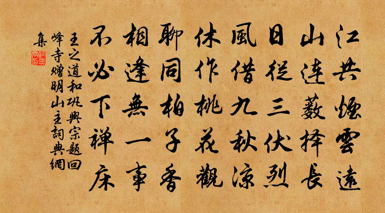 詩詞名句歷史字典書法欣賞書法字典國語詞典說文解字康熙字典古漢語字典標 題 作 者 詩 句 和鞏興宗題回峰寺贈明山主作者:王之道 朝代:宋代和鞏興宗題回峰寺贈明山主原文江共煙雲遠,山連藪擇長。日從三伏烈,風借九秋涼。休作桃花觀,聊同柏子香。相逢無一事,不必下禪床。詩詞問答問:和鞏興宗題回峰寺贈明山主的作者是誰?答:王之道問:和鞏興宗題回峰寺贈明山主寫於哪個朝代?答:宋代王之道和鞏興宗題回峰寺贈明山主書法欣賞和鞏興宗題回峰寺贈明山主書法作品詩詞推薦壽崔西清二首洪咨夔〔宋代〕武侯王佐材,有膽大如屋。愛之莫助之,只手挈全蜀。淋漓出師表,所舉良且淑。孔鸞非不佳,健翮欠鴻鵠。先生屏山陶弼〔宋代〕一峰高起塞天關,堪作皇家外屏山。可惜化工安著遠,半遮中國半遮蠻。餞秘書郎劉侯出守龍舒分韻得亭字程公許〔宋代〕皖伯疏封有故城,新堂猶寶李翱銘。三峰秀出塵區外,二水空流戰血腥。在昔建邦專地勢,祗今誤計奇沙汀。集鴻送悟藏主還姑蘇釋崇岳〔宋代〕玲瓏岩畔瞥不瞥,豎起脊梁生鐵橛。無端林下錯商量,攜手相隨入虎穴。瓮里驀然失卻鱉,個事明明向誰說。彼時壽嫩庵趙先生十首陳元晉〔宋代〕曩時吳畏齋,盤盤極宏毅。今時葉水心,表表負經濟。公游二老間,聖處心獨契。人物方眇然,甚矣夫子似。江梅引/江城梅花引 憶江梅洪皓〔宋代〕天涯除館憶江梅。幾枝開。使南來。還帶餘杭、春信到燕台。準擬寒英聊慰遠,隔山水,應銷落,赴訴誰。空恁遐與韓侍御同尋李七舍人不遇,題壁留贈獨孤及〔唐代〕三徑何寂寂,主人山上山。亭空檐月在,水落釣磯閒。藥院雞犬靜,酒壚苔蘚班。知君少機事,當待暮雲還題娥皇廟朱慶餘〔唐代〕娥皇揮涕處,東望九疑天。往事難重問,孤峰尚慘然。夜深寒峒響,秋近碧蘿鮮。未省明君意,遺蹤萬古傳。贈崔秋浦其三李白〔唐代〕河陽花作縣。秋浦玉為人。地逐名賢好。風隨惠化春。水從天漢落。山逼畫屏新。應念金門客。投沙吊楚臣。苦寒得酒二首王洋〔宋代〕因雪成寒勢未收,及時一醉比封侯,陽功亭毒無人見,已有春光亦信不。一落索王安中〔宋代〕欲訪瑤台蓬島。煙雲縹緲。清游卻到鳳皇池,聽檀板、新聲妙。天上除書催早。人瞻元老。東風煙柳罩河堤,更何小樓獨酌張伯玉〔宋代〕老去春來事事慵,春陰獨酌小樓中。一千里色江南岸,二十四般花信風。祗有豀山迎醉目,更無塵土倦樊籠。鷦鷯暮春陸游〔宋代〕憔悴都門白髮新,歸來一振客衣塵。啼鶯妒夢頻催曉,飛絮鍾情獨殿春。湖上風光猶淡沱,尊前懷抱頗清真。詩成有感二首許月卿六〔宋代〕日忽出天將有雪,雨將降地忽無風。陰陽二氣循環耳,靜入儒生一笑中。夜宿江浦聞元八改官因寄此什白居易〔唐代〕君游丹陛已三遷,我泛滄浪欲二年。劍佩曉趨雙鳳闕,煙波夜宿一魚船。交親盡在青雲上,鄉國遙拋白日邊。若報奉和御製讀前漢書夏竦〔宋代〕高祖寬仁主,淮陰變詐才。設壇誠有禮,推食本無猜。懷惠初顒若,誇功抑殆哉。何如中正者,千載仰高裁。訴衷情(友人生日)葛勝仲〔宋代〕清明寒食景暄妍。花映碧羅天。參差捍撥齊奏,豐頰擁芳筵。逢誕日,揖真仙。托爐煙。朱顏長似,頭上花枝,歲建隆以來祀享太廟十六首佚名〔宋代〕維犠維牲,以炰以烹。植其鞉鼓,潔彼鉶羹。孔碩北俎,於穆厥聲。肅雍示相,福祿來成。偈頌一百二十三首釋普度〔宋代〕雲收海山橫,月印江天曉。擾擾紅塵中,青春有多少。鐵壁銀山一拶開,落花流水空徘徊。景祐夏至皇地祗二首佚名〔宋代〕赫矣淳耀,俶載帝基。一牙以定,萬國來們。寅恭潔祀,博厚皇祗。威靈攸在,福祿如茨。名句推薦榆柳蕭疏樓閣閒,月明直見嵩山雪。孟郊《洛橋晚望》 野水參差落漲痕,疏林欹倒出霜根。蘇軾《書李世南所畫秋景二首》 梅定妒,菊應羞。畫闌開處冠中秋。李清照《鷓鴣天·桂花》 山圍故國周遭在,潮打空城寂寞回。劉禹錫《金陵五題·石頭城》 傷心庾開府,老作北朝臣。司空曙《金陵懷古》 暮雲收盡溢清寒。銀漢無聲轉玉盤。蘇軾《陽關曲 / 中秋月》 人皆欲多積財,石崇乃因多積財而喪命。王永彬《圍爐夜話·第七則》 日日花前常病酒,敢辭鏡里朱顏瘦。馮延巳《鵲踏枝·誰道閒情拋擲久》 曲屏先暖鴛衾慣,夜寒深、都是思量。吳文英《風入松·為友人放琴客賦》 余凡事喜獨出己見,不屑隨人是非。沈復《浮生六記·浪遊記快》