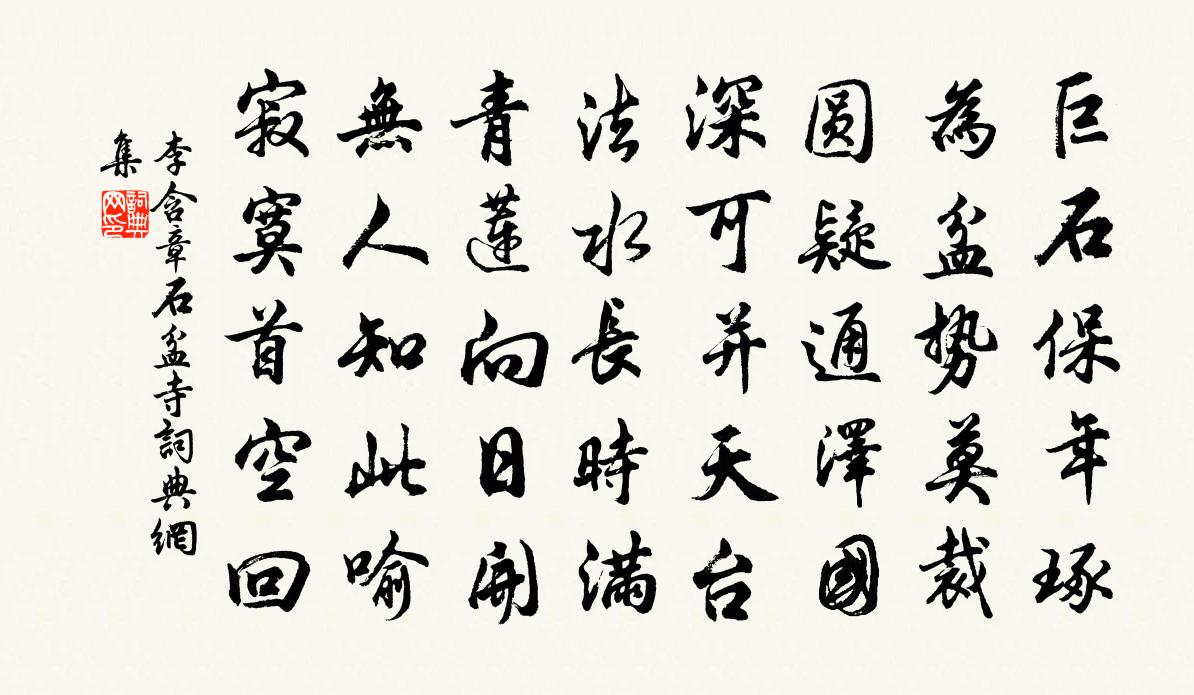 詩詞名句歷史字典書法欣賞書法字典國語詞典說文解字康熙字典古漢語字典標 題 作 者 詩 句 石盆寺作者:李含章 朝代:宋代石盆寺原文巨石保年琢,為盆勢莫裁。圓疑通澤國,深可並天台。法水長時滿,青蓮向日開。無人知此喻,寂寞首空回。詩詞問答問:石盆寺的作者是誰?答:李含章問:石盆寺寫於哪個朝代?答:宋代李含章石盆寺書法欣賞石盆寺書法作品詩詞推薦過陂子逕五十餘里,喬木蔽天,遣悶七絕句楊萬里〔宋代〕山窮喜見一平川,不似林中不識天。只出此山災便散,何須更問小行年。武夷九曲棹歌留元剛〔宋代〕一曲初篙上水船,翠峰蒼壁挾洄川。采幢幔屋今何在,空有丹爐石鼎煙。題惠嚴寺崔庸〔唐代〕人莫嫌山小,僧還愛寺靈。殿高神氣力,龍活客丹青。登度雪台楊萬里〔宋代〕欲問金沙信,聊登度雪台。碧桃良解事,開過架梢來。望海潮折元禮〔金代〕地雄河嶽,疆分韓晉,潼關高壓秦頭。山倚斷霞,江吞絕壁,野煙縈帶滄州。虎旆擁貔貅。看陣雲截岸,霜氣橫秋穢跡贊白玉蟾〔宋代〕寶杵動時天地黑,鐶鈴震處鬼神驚。釋迦臨入涅槃日,六慾天中現此身。現此身,無邊際。太圓鏡中點檢看,個個次魏知元韻三首陳造〔宋代〕江城半月從遊樂,別去知君剩有詩。相望置郵三舍便,幸能時寄慰相思。贈葉少卿范仲淹〔宋代〕退也天之道,東南事了人。風波拋舊路,花月伴閒身。湖外扁舟遠,門中駟馬新。心從今日泰,家似昔時貧。見子感興五首於石〔宋代〕群棲平沙雁,有警奴輒鳴。鳴多謂奴妄,哀嗷墮弓矰。甡甡中林鹿,以媒誘其群。相呼入網罟,鹿死媒獨生。骨肉貧居自警三首劉克莊〔宋代〕客過吾廬語至晡,旋營鹽酪刈薪芻。酒兼麟脯不時有,飯與魚羹何處無。力穡勿忘家世儉,堆金能使子孫愚。俗兒王昭君三首郭震〔唐代〕自嫁單于國,長銜漢掖悲。容顏日憔悴,有甚畫圖時。壓踐冰霜域,嗟為邊塞人。思從漠南獵,一見漢家塵。聞有題州北路傍老柳樹白居易〔唐代〕皮枯緣受風霜久,條短為經攀折頻。但見半衰當此路,不知初種是何人。雪花零碎逐年減,菸葉稀疏隨分新。莫道紹興以後時享二十五首真宗〔宋代〕於昭神祖,運撫明昌。筆新百度,克配三王。遐荒底績,聖武維揚。永言執競,上帝是皇。挽沈提刑李石〔宋代〕金馬堂堂有陸沉,斯人出處可重尋。豸冠議論回天力,繡節平反念母心。一代師承無別派,百年朋舊托遺音。便當冬日即事一首蘇籀〔宋代〕蠟梔五萬酬鞭直,洴絖百金真食封。蕭散不萌爭鬧趣,真醇繆覬養生慵。滌清研里憨凡筆,磨澈鑒中嚬窘容。暘旱黎明府見示令叔顯謨開國墓誌求詩為賦三首戴復古〔宋代〕虜橫干戈密,官清財賦強。飢年無餓莩,亂後有金湯。五郡樹佳政,諸公交薦章。忠言動天聽,惜去把麾忙。生查子(春晴寓興)汪莘〔宋代〕天上不知天,洞裡休尋洞。洞府天宮在眼前,春日都浮動。我自覺來看,他在迷時夢。覺則人人總是仙,步步乘鸞送將作監丞張唐卿通理陝州宋庠〔宋代〕春風秘殿翳華芝,親見枚皋作賦時。秀色並開棠樹萼,雋科先賞桂林枝。漢郵給傳蕃恩告,蜀醑浮觴薦壽祺。幾日懷舊第一百八文天祥〔宋代〕故人入我夢,相視涕闌乾。四海一塗炭,焉用身獨完。上東林和尚貫休〔唐代〕讓紫歸青壁,高名四海聞。雖然無一事,得不是要君。道只傳伊字,詩多笑碧雲。應憐門下客,餘力亦為文。名句推薦小人錯其在己者,而慕其在天者。荀子《荀子·天論》 無情有恨何人覺?月曉風清欲墮時。陸龜蒙《白蓮》 虛空落泉千仞直,雷奔入江不暫息。徐凝《廬山瀑布》 日長籬落無人過,惟有蜻蜓蛺蝶飛。范成大《四時田園雜興·其二》 黃葉仍風雨,青樓自管弦。李商隱《風雨》 讀書好處心先覺,立雪深時道已傳。袁枚《隨園詩話·卷三》 今我來思,雨雪霏霏。佚名《採薇》 草樹知春不久歸,百般紅紫斗芳菲。韓愈《晚春》 走馬西來欲到天,辭家見月兩回圓。岑參《磧中作》 飄風不終朝,驟雨不終日。孰為此者?天地。天地尚不能久,而況於人乎?老子《老子·道經·第二十三章》