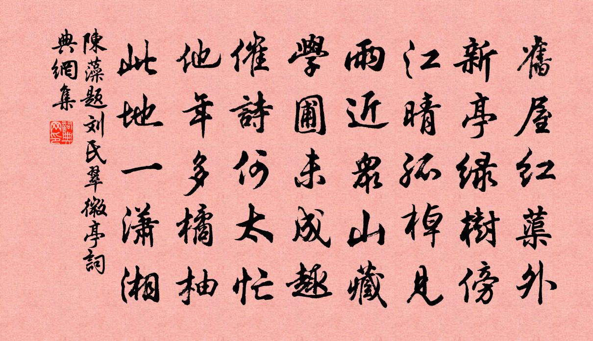 詩詞名句歷史字典書法欣賞書法字典國語詞典說文解字康熙字典古漢語字典標 題 作 者 詩 句 題劉氏翠微亭作者:陳藻 朝代:宋代題劉氏翠微亭原文舊屋紅蕖外,新亭綠樹傍。江晴孤棹見,雨近眾山藏。學圃未成趣,催詩何太忙。他年多橘柚,此地一瀟湘。詩詞問答問:題劉氏翠微亭的作者是誰?答:陳藻問:題劉氏翠微亭寫於哪個朝代?答:宋代陳藻題劉氏翠微亭書法欣賞題劉氏翠微亭書法作品詩詞推薦淮陽路李商隱〔唐代〕荒村倚廢營,投宿旅魂驚。斷雁高仍急,寒溪曉更清。昔年嘗聚盜,此日頗分兵。猜貳誰先致,三朝事始平。登嚴州北高峰用韻金履祥〔宋代〕雄蟠古睦東,俯視翠重重。白塔清涼界,烏龍伯仲峰。雲連天勢近,石釀井泉濃。更上最高處,扳躋意未慵。摸魚兒翁孟寅〔宋代〕卷西風、方肥塞草,帶鉤何事東去。月明萬里關河夢,吳楚幾番風雨。江上路。二十載頭顱,凋落今如許。涼生弄秋江偈釋祖欽〔宋代〕漾漾銀河玉宇流,淨如白練冷光浮。老胡一葦踏不著,零落西風斷岸頭。裴十六廳即事劉商〔唐代〕主人能政訟庭閒,帆影雲峰戶牖間。每到夕陽嵐翠近,只言籬障倚前山。次韻梅花方岳〔宋代〕雲藏山塢塢藏梅,春意適從何許來。天與此翁娛寂寞,日攜扶老上崔嵬。草堂須小難為客,霜月正高誰與杯。分上無題一首劉克莊〔宋代〕死以子托友,病將身付醫。友今多市道,醫或似屠兒。梅花喜神譜欲開八枝宋伯仁〔宋代〕斗醉石亦醉,無量不及亂。獨醒誰得知,憔悴滄江畔。偈頌十首釋曇密〔宋代〕連綿雨不晴,穀子多損失。二麥未入泥,憂心常惕惕。來歲不饑荒,未敢相委悉。啟告梵天帝釋天玉皇大帝天,且頌古十二首釋法泰〔宋代〕十分風采露堂堂,玉蘂瓊華未比量。剛被傍人論好醜,因茲難嫁與潘郎。出江鄭剛中〔宋代〕淨練已欣平似熨,更因過雨助清深。何人孤笛穿雲杪,遠岸歸舟入樹陰。鷗鳥慣看遷客面,江山偏識老夫心。半鉤聞蛩釋懷古〔宋代〕幽蟲侵暮急,斷續苦相親。夜魄沈荒壘,寒聲出壤鄰。霜清空思切,秋永幾愁新。徒感流年鬢,莖莖暗結銀。大帝權徐鈞〔宋代〕鼎峙東吳命世雄,甘心俯受魏丕封。炎劉已盡猶餘蜀,唇齒胡為反內攻。蝶戀花(東湖)黃裳〔宋代〕南北兩山驕欲斗。中有漣漪,莫道壺山小。落落情懷臨漂渺。駕言來處鈴齋悄。行到桃溪花解笑。人面相逢,競好代贈蘇泂〔宋代〕隔溪楊柳絲絲綠,比妾心情少日時。待得楊花逐流水,此時妾意有誰知。生查子·含羞整翠鬟歐陽修〔宋代〕含羞整翠鬟,得意頻相顧。雁柱十三弦,一一春鶯語。嬌雲容易飛,夢斷知何處。深院鎖黃昏,陣陣芭蕉雨。過建昌李野夫公擇故居蘇軾〔宋代〕彭蠡東北源,廬阜西南麓。何人修水上,種此一雙玉。思之不可見,破宅余修竹。四鄰戒莫犯,十畝森似束。我來春帖子詞二十首皇帝合六首歐陽修〔宋代〕熙熙人物樂春台,風送春從天上來。玉輦經年不游幸,上林花好莫爭開。偈頌一百五十首釋心月〔宋代〕敕書來自九重天,寶墨琳琅色尚鮮。移怪岩間枯樹子,和根植向鷲峰巔。三次劉寺韻賦張以道新居與約齋夾湖相望項安世〔宋代〕寒綠新軒對馬頭,陂南陂北□銷愁。合添漁艇兩三隻,時與約齋來往游。欹枕孤鴻煙雨漲,鉤簾宿鷺曉光流。何時名句推薦涓涓不壅,終為江河佚名《孔子家語·觀周》 一郡官閒唯副使,一年冷節是清明。王禹偁《清明日獨酌》 龜靈未免刳腸患,馬失應無折足憂。白居易《放言五首·其二》 貧居往往無煙火,不獨明朝為子推。孟雲卿《寒食》 可有梅花寄一枝?雪來翠羽飛。吳錫麒《長相思·以書寄西泠諸友即題其後》 江天一色無纖塵,皎皎空中孤月輪。張若虛《春江花月夜》 聽於無聲,視於無形。戴聖《禮記·曲禮上》 擬借寒潭垂釣,又恐鷗鳥相猜,不肯傍青綸。蘇舜欽《水調歌頭·滄浪亭》 凡令之行也,必待近者之勝也,而令乃行。管仲《管子·重令》 虛靜無事,以暗見疵。韓非及後人《韓非子·主道》
