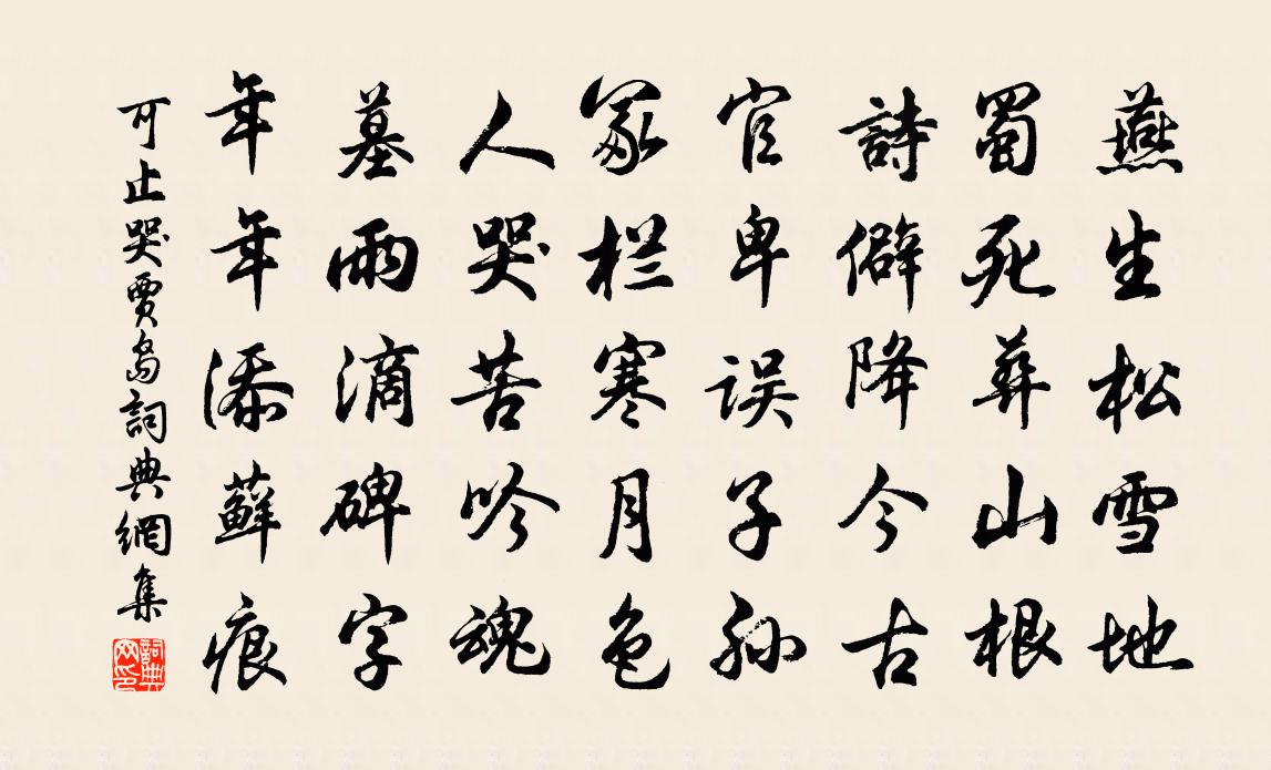 詩詞名句歷史字典書法欣賞書法字典國語詞典說文解字康熙字典古漢語字典標 題 作 者 詩 句 哭賈島作者:可止 朝代:唐代哭賈島原文燕生松雪地,蜀死葬山根。詩僻降今古,官卑誤子孫。冢欄寒月色,人哭苦吟魂。墓雨滴碑字,年年添蘚痕。詩詞問答問:哭賈島的作者是誰?答:可止問:哭賈島寫於哪個朝代?答:唐代問:哭賈島是什麼體裁?答:五律可止哭賈島書法欣賞哭賈島書法作品注釋全唐詩:卷825-5詩詞推薦秘閣修撰雷文卿挽章二首曹彥約〔宋代〕殄瘁連鄉黨,凋零及老成,玉亡修水秀,星掩壽沙明。不上論思直,空餘餽饟名。蓋棺隆眷在,論譔見哀榮。瞧陽五老會詩朱貫〔宋代〕各還朝政遇堯年,鶴髮俱宜預道冠。乍到林泉能放曠,全拋簪紱尚盤桓。君恩至重如天覆,相坐時親畏地寒。九老贈河間隱者苑君年八十有一家鉉翁〔宋代〕海上有三山,瀛洲居其一。何年飛來神州赤縣東,其上至今猶有神仙宅。龐眉皓前方瞳翁,喬松羨門乃其匹。深衣寄蔡昆宋白〔宋代〕卻憶醉相逢,雲深太白東,離別經臘雪,魂夢又春風。芳草晴天滋闊,黃鸝細雨中。倚筇愁望處,煙樹過錯蒙籠。代同舍上郎中許應龍〔宋代〕人物依然呂洞賓,冰霜風骨玉精神。退朝花底千官散,標格如公有幾人。迎春樂方千里〔宋代〕紅深綠暗春無跡。芳心蕩、冶遊客。記搖鞭跋馬銅駝陌。凝睇認、珠簾側。絮滿愁城風卷白。遞多少、相思訊息。觀梅王柟〔宋代〕誰見梅花正發時,江天天雪意欲垂垂。疏枝冷蕊春無幾,斷水殘雲意自奇。疏影偶因明月見,暗香惟有好風知。何寄徐州鄭使君韓翃〔唐代〕江城五馬楚雲邊,不羨雍容畫省年。才子舊稱何水部,使君還繼謝臨川。射堂草遍收殘雨,官路人稀對夕天。雖臥十二時行孝文白居易〔唐代〕平旦寅,早起堂前參二親。處分家中送疎水,莫[教]父母喚頻聲。 琢句蘇泂〔宋代〕琢句真無益,論詩新有名。客懷無遠近,人事只翻騰。積水明寒樹,飢鴻咽夜聲。半年安坐得,又作雨中行。長溪秋望唐彥謙〔唐代〕柳短莎長溪水流,雨微煙暝立溪頭。寒鴉閃閃前山去,杜曲黃昏獨自愁。滎陽唐高祖太宗石刻像蘇轍〔宋代〕誰言膚寸像,勝力妙人天。欲療眾生病,陰扶濟世賢。身微須覆護,眼淨照幾先。豈為成功報,猶應歷劫緣。呂顏野飲醉中寄五絕句次其韻李廌〔宋代〕醉倒南山臥白雲,滿天詩思不勝春。黃雞白酒真堪樂,誰道蓬蒿有此人。滿江紅(四月初六)佚名〔宋代〕天佑生賢,安排處、麥秋六日。人盡道、英雄慷慨,中興人物。佛祖慶生宜後兩,洞賓初度猶遲七。欲急流勇退作玉樓春歐陽修〔宋代〕夜來枕上爭閒事。推倒屏山褰繡被。盡人求守不應人,走向碧紗窗下睡。直到起來由自殢。向道夜來真箇醉。大家【越調】寨兒今_春晚次韻紅張可久〔元代〕春晚次韻紅漸稀,綠將肥,一聲杜鵑殘夢裡。踏雪尋梅,看到荼蘼,猶自怨春遲。錦雲中翠繞珠圍,碧人邊玉走金送馮介迎覲魏野〔宋代〕離聲無管弦,空把指頻彈。惟子猶為客,何人不作官。前程貧豈易,後會老應難。拜想高堂下, * 淚始乾。夜宴安樂公主新宅岑羲〔唐代〕金榜重樓開夜扉,瓊筵愛客未言歸。銜歡不覺銀河曙,盡醉那知玉漏稀。自勉歐陽修〔宋代〕引水澆花不厭勤,便須已有鎮陽春。官居處處如郵傳,誰得三年作主人。婦女之孝二十首北宮女林同〔宋代〕妾身期不嫁,至老養雙親。何意趙威后,殷勤問使人。名句推薦石門流水遍桃花,我亦曾到秦人家。李白《下途歸石門舊居》 漢月垂鄉淚,胡沙費馬蹄。岑參《磧西頭送李判官入京》 橫槊題詩,登樓作賦,萬事空中雪文天祥《酹江月·和友驛中言別》 一枝紅艷露凝香,雲雨巫山枉斷腸。李白《清平調·其二》 喃喃教言語,一一刷毛衣。白居易《燕詩示劉叟》 終古閒情歸落照,一春幽夢逐遊絲。納蘭性德《浣溪沙·楊柳千條送馬蹄》 願我如星君如月,夜夜流光相皎潔。范成大《車遙遙篇》 敵未滅,何以家為?脫脫《宋史·列傳·卷一百二十四》 曉風不散愁千點,宿雨還添淚一痕。曹雪芹《詠白海棠》 只願君心似我心,定不負相思意。李之儀《卜運算元·我住長江頭》