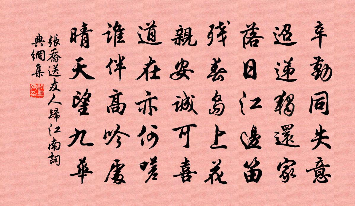 詩詞名句歷史字典書法欣賞書法字典國語詞典說文解字康熙字典古漢語字典標 題 作 者 詩 句 送友人歸江南作者:張喬 朝代:唐代送友人歸江南原文辛勤同失意,迢遞獨還家。落日江邊笛,殘春島上花。親安誠可喜,道在亦何嗟。誰伴高吟處,晴天望九華。詩詞問答問:送友人歸江南的作者是誰?答:張喬問:送友人歸江南寫於哪個朝代?答:唐代問:送友人歸江南是什麼體裁?答:五律張喬送友人歸江南書法欣賞送友人歸江南書法作品注釋全唐詩:卷638-30詩詞推薦東園池上書所見五首宋庠〔宋代〕靜岸無風斂夕霏,田田香葉滿空地。戲魚未必能知我,我自知魚最樂時。小三洞於石〔宋代〕斷崖怒涌四時雪,虛壁寒凝六月霜。倚樹老僧閒洗缽,碧桃花落澗泉香。昭武太守王子文日舉李賈嚴羽共觀前輩一兩家戴復古〔宋代〕古今胸次浩江河,才比諸公十倍過。時把文章供戲謔,不知此體誤人多。水調歌頭 此首前原有水調歌頭不用尋神水一佚名〔宋代〕東風捲簾*幕,時物又新奇。桃花院落,小橋流水柳依依。正是清明天氣,茅草池塘鮮麗,何處不相宜。紫燕添新立春和孫子紹二首王之道〔宋代〕南浦初開凍,東郊未去寒。芳華歸草木,生意入門闌。綠蟻供瑤瓮,青絲送玉盤。新詩妙當世,賦答敢辭難。夜雨楊時〔宋代〕似聞疏雨打篷聲,枕上悠揚夢半醒。明日覺來渾不記,隔船相語過前汀。好事近(次韻昌甫)韓淲〔宋代〕梅雨快晴風,苔竹定翻新籜。相望得尋幽調,把陳言都略。大江東去更飛雲,心事共回薄。彷佛散庵佳處,一聲聲過申州戴叔倫〔唐代〕萬人曾戰死,幾處見休兵。井邑初安堵,兒童未長成。涼風吹古木,野火入殘營。牢落千餘里,山空水復清。發金陵折柳亭二首張耒〔宋代〕桃李蕃晴日,江山秀晚春。孤舟多病客,長道未歸人。豪俗競行樂,倦遊慵問津。南山還暮雨,疑有楚台神。偈頌十首釋如淨〔宋代〕秋風清,秋月明,大地山河露眼睛。瑞岩點瞎重相見,棒喝交馳驗衲僧。哭方碧山前惠州同知方回〔宋代〕四年登八十,壽過古來稀。辭郡非關瘴,思親自合歸。千詩存老筆,二紀掩閒扉。雞絮臨筵几,隨潮夜夢飛。倪昭卿賦贈葉神童白玉蟾〔宋代〕神童天縱何聰明,十幅一息增榮名。若非唐朝李太白,靖通真人當復生。擊石轟雷驚四座,寶卷拈出安群情。八卦句繆鑒〔宋代〕門因好客時時掃,窗為看山面面閉。偈頌七十六首釋子益〔宋代〕菊花黃,茱萸香。時節既至,其理自彰。次韻楊宰食蟹陳造〔宋代〕長翁服食僧樣清,灌園得閒收落英。壯歲頗營口腹事,岡有罝罟梁有罾。大胾每快屠門嚼,美酒慣陪豪士傾。酒邊效孔文舉贈柳聖功三首黃庭堅〔宋代〕妙言玉質金相,學問日月悠長。良賈故要深藏,屈體下心堂堂,灰頭土面輝光。偈釋善昭〔宋代〕胡僧金錫光,為法到汾陽。六人成大器,勸請為敷揚。念奴嬌(題釣台)王自中〔宋代〕扁舟夜泛,向子陵台下,偃帆收櫓。水闊風搖舟不定。依約月華新吐。細酌清泉,痛澆塵臆,喚起先生語。當年綸寒窗聽雪陳宗道〔宋代〕水浸樓台月,山圍花柳春。宸居一望近,風景四時新。畫舫斷橋聚,清簫夾岸聞。遊人歸去晚,車馬鬧紅塵。晚秋遊中溪四首戴表元〔宋代〕休折山中松桂枝,溪魚亦小莫垂絲。沙田翻白收秔後,霜樹著紅嘗柿時。日落牛羊歸徑熟,天寒烏鳥向人慈。出雲名句推薦親朋無一字,老病有孤舟。杜甫《登岳陽樓》 白骨露於野,千里無雞鳴。曹操《蒿里行》 芳草無情,更在斜陽外范仲淹《蘇幕遮·懷舊》 並刀如水,吳鹽勝雪,縴手破新橙。周邦彥《少年游·並刀如水》 謙謙君子,卑以自牧佚名《易傳·象傳上·謙》 小人不激不勵,不見利不勸。王通《中說·卷一·王道篇》 有情不管別離久。情在相逢終有。晏幾道《秋蕊香·池苑清陰欲就》 月落沙平江似練。望盡蘆花無雁。張炎《清平樂·候蛩淒斷》 天之生民,非為君也;天之立君,以為民也。荀子《荀子·大略》 鳥下綠蕪秦苑夕,蟬鳴黃葉漢宮秋。許渾《鹹陽城東樓 / 鹹陽城西樓晚眺 / 西門》