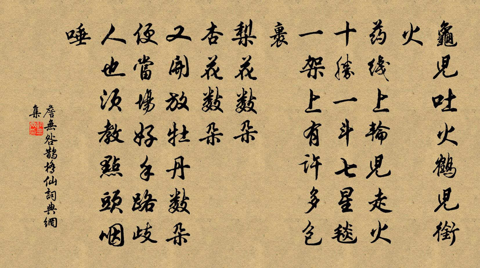 詩詞名句歷史字典書法欣賞書法字典國語詞典說文解字康熙字典古漢語字典標 題 作 者 詩 句 鵲橋仙作者:詹無咎 朝代:宋代鵲橋仙原文龜兒吐火,鶴兒銜火。藥線上、輪兒走火。十勝一斗七星毯,一架上、有許多包裹。梨花數朵。杏花數朵。又開放、牡丹數朵。便當場好手路歧人,也須教、點頭咽唾。詩詞問答問:鵲橋仙的作者是誰?答:詹無咎問:鵲橋仙寫於哪個朝代?答:宋代問:鵲橋仙是什麼體裁?答:詞詹無咎鵲橋仙書法欣賞鵲橋仙書法作品詩詞推薦江月五首蘇軾〔宋代〕一更山吐月,玉塔臥微瀾。正似西湖上,涌金門外看。冰輪橫海闊,香霧入樓寒。停鞭且莫上,照我一杯殘。歸括蒼如山堂挈家出宅姜特立〔宋代〕今日如山堂,攜家如逆旅。為誰十日留,南山看煙雨。王東卿惠墨戲副之以詩因次韻謝之蔡戡〔宋代〕近時畫手說超然,小景仍推趙大年。誰識當家老摩詰,有如珠玉韞溫淵。癸丑記顏劉克莊〔宋代〕放逐歸來寂寞濱,顛毛雪色麵皮皴。怪奇昔有觀邕者,老醜今無看玠人。一枕喚回將覺夢,三薰惜取已來身。繡裳箜篌引姜夔〔宋代〕箜篌且勿彈,老夫不要聽。河邊風浪起,亦作箜篌聲。古人抱恨死,今人抱恨生。南鄰賣妻者,秋夜難為情。長安水調歌頭(武昌南樓落成,次王漕韻)李廷忠〔宋代〕撫景幾今古,遺恨此江山。百年形勝,但見幽草雜枯菅。多少名流登覽,賴有神扶壞棟,詩墨尚斑斑。風月要磨洗送王尉李覯〔宋代〕義激中心不再思,宦途從此抱瑕疵。誰憐君子篤親意,況是明王孝治時。靖節田園應久發,尚平婚嫁豈宜遲。一官滿江紅(寄壽宋子淵,宋生朝先餘一日)管鑒〔宋代〕去歲茲辰,記稱壽、曾陪燕席。明朝更、屈公扶醉,相過為客。間世生賢元自異,偶然先後歡連日。悵如今、五嶺途次憶故居晁說之〔宋代〕自喜白髯翁,深居看歲窮。雪迷石嶺上,月在草堂中。樵客曉來市,田家夜半舂。豈期胡騎到,無地得相容。次韻十詩棋會樓鑰〔宋代〕歸來鄉曲大家閒,同社仍欣取友端。無事銜杯何不可,有時會面亦良難。少曾環坐坐長滿,賴有主盟盟未寒。琴弈將赴雪峰示圭上人釋惟一〔宋代〕上人辭我去行腳,我亦早晚行腳去。天涯海角或重逢,缽飯莖虀又相聚。自笑年登六十七,眼昏耳聵腳無力。觸事奉祠東歸蔡戡〔宋代〕老來不復嘆飄零,遊宦真如水上萍。綿力何堪分閫寄,寬恩猶許奉祠庭。休夸仙去騎鯨李,剩喜歸來化鶴丁。料得呈周昭禮二首趙蕃〔宋代〕又向江頭覓去船,故山歸路反茫然。秋鴻社燕各千里,落日殘霞同一川。酒得老兵猶可飲,詩須我輩始堪傳。經行送徐秀才之吳齊己〔唐代〕吳都霸道昌,才子去觀光。望闕雲天近,朝宗水路長。海門收片雨,建業泊殘陽。欲問淮王信,仙都即帝鄉。溪居柳宗元〔唐代〕久為簪組束,幸此南夷謫。閒依農圃鄰,偶似山林客。曉耕翻露草,夜榜響溪石。來往不逢人,長歌楚天碧。登樓有題韓偓〔唐代〕暑氣檐前過,蟬聲樹杪交。待潮生浦口,看雨過山坳。才見蘭舟動,仍聞桂楫敲。窣雲朱檻好,終睹鳳來巢。秋夜獨坐聞里中鼓吹聲陸游〔宋代〕收盡浮雲見素娥,青天脈脈映明河。時平里巷吹彈鬧,歲熟人家嫁娶多。高會不知清夜永,散歸想見醉顏酡。小窗題謝艮齋畫笥四首王炎〔宋代〕萬點青山一曲溪,門闌疑是辟塵犀。筆端更有詩中畫,細細冥搜為品題。讀夷堅志趙汝淳〔宋代〕千古丘明法度書,豕啼蛇斗未為誣。後來更有無窮事,付與蘭台鬼董狐。壬戌清明作屈大均〔清代〕朝作輕寒暮作陰,愁中不覺已春深。落花有淚因風雨,啼鳥無情自古今。故國江山徒夢寐,中華人物又銷沉。龍蛇名句推薦時不可再,機不可失魏徵《隋書·列傳·卷三》 大凡物不得其平則鳴韓愈《送孟東野序》 一寸柔腸情幾許?薄衾孤枕,夢回人靜,徹曉瀟瀟雨。惠洪《青玉案·絲槐煙柳長亭路》 閨中風暖,陌上草薰江淹《別賦》 葉潤林塘密,衣乾枕席清。杜甫《水檻遣心二首》 今夜不知何處宿,平沙萬里絕人煙。岑參《磧中作》 居善地,心善淵,與善仁,言善信,政善治,事善能,動善時。夫唯不爭,故無尤。老子《老子·道經·第八章》 虛則知實之情,靜則知動者正。韓非及後人《韓非子·主道》 堪怨王孫,不記歸期早。梅堯臣《蘇幕遮·草》 四月十七,正是去年今日,別君時。韋莊《女冠子·四月十七》