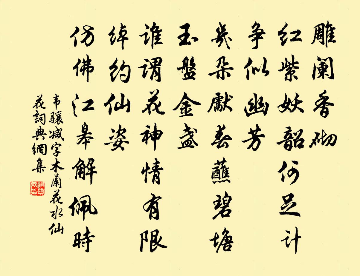 詩詞名句歷史字典書法欣賞書法字典國語詞典說文解字康熙字典古漢語字典標 題 作 者 詩 句 減字木蘭花(水仙花)作者:韋驤 朝代:宋代減字木蘭花(水仙花)原文雕闌香砌。紅紫妖韶何足計。爭似幽芳。幾朵先春蘸碧塘。玉盤金盞。誰謂花神情有限。綽約仙姿。仿佛江皋解佩時。詩詞問答問:減字木蘭花(水仙花)的作者是誰?答:韋驤問:減字木蘭花(水仙花)寫於哪個朝代?答:宋代問:減字木蘭花(水仙花)是什麼體裁?答:詞韋驤減字木蘭花(水仙花)書法欣賞減字木蘭花(水仙花)書法作品詩詞推薦烏青賈似道〔宋代〕烏青生來似定墨,腿腳班狸肉帶黑。鉗若細長似血紅,合戰交鋒如霹靂。送裴員外往江南李嘉祐〔唐代〕公務江南遠,留歡幕下榮。楓林緣楚塞,水驛到湓城。岸草知春晚,沙禽好夜驚。風帆幾度泊,處處暮潮聲。送中兄典邵州韓翃〔唐代〕官騎連西向楚雲,朱軒出餞晝紛紛。百城兼領安南國,雙筆遙揮王左君。一路諸侯爭館穀,洪池高會荊台曲。玉顏偈釋智勤〔宋代〕今年五十五,腳未蹋寸土。山河是眼睛,大海是我肚。頌古十一首釋普濟〔宋代〕風頭策起羅生綱,更向無風暖處張。兩度勞心又勞力,更無鸞鳳敢呈祥。長楊賦揚雄〔兩漢〕 明年,上將大誇胡人以多禽獸。秋,命右扶風發民入南山。西自褒斜,東至弘農,南驅漢中,張羅網罝罘,捕鷺鷥鄭獬〔宋代〕小屏飛鷺雪褵褷,窗影初搖晚竹枝。獨倚枕函無一事,無何鄉里覺來時。甲辰年得男子經道以詩相賀因報之鄭剛中〔宋代〕兩夢嘗占女子祥,偶懸弧矢亦非常。渥窪方合生騏驥,枳棘安能出鳳凰。自顧此身無遠業,所期前世有遺芳。新詩記夢陸游〔宋代〕夢遊異境不可識,翠壁蒼崖立千尺。樓台縹緲出其上,揮手直登無羽翼。門楣扁牓作八分,奇勁非復人間跡。主人冬夜劉應時〔宋代〕濁酒有真味,軟火如春和。跧居身懶動,卒歲養微痾。世境淡無染,心源湛不波。舍爾短檠樂,如此良夜何。苦雨過玄妙池觀蓮張埴〔宋代〕門外惟攻蠹,幾間如絕機。飈車何處去,汗馬是誰歸。此日炎炎極,吾身往往非。有時同白羽,無語立紅衣。送李明甫召除奉常簿陳棣〔宋代〕壑主臨軒達四聰,皎如麗日明高穹。傾葵發蔀燭幽隱,熙然萬物還春風。鼎新百度躋時雍,西垣東省羅鵷鴻。鋒車蟄室方岳〔宋代〕室中度以幾,其修去尋一。廣長尺而贏,崇為咫者七。牖一以為明,墐三以為密。不供並橫肱,所貴劣容膝。蠖屈題共樂堂錢暄〔宋代〕疏就湖山秀氣濃,花林茂列景爭雄。管弦交奏客歡合,台榭競登人喜同。環嶂鷺行飛早晚,平波魚陣躍西東。荒蕪送宮人入道韋應物〔唐代〕舍寵求仙畏色衰,辭天素麵立天墀。金丹擬駐千年貌,寶鏡休勻八字眉。公主與收珠翠後,君王看戴角冠時。從來登楚州城楊萬里〔宋代〕望中白處日爭明,個是淮河凍作冰。此去中原三里許,一條玉帶界天橫。懷寄披雲峰誠上人曹汝弼〔宋代〕院高窮木盛,野極靜無言。險路通岩頂,香泉出石根。微風飄磬韻,幽鳥啄苔痕。常記相留夜,秋堂共聽猿。九歌·東君屈原〔先秦〕暾將出兮東方,照吾檻兮扶桑。撫余馬兮安驅,夜晈晈兮既明。駕龍輈兮乘雷,載雲旗兮委蛇。長太息兮將上,心慶全庵桃花謝枋得〔宋代〕尋得桃源好避秦,桃紅又是一年春。花飛莫遣隨流水,怕有漁郎來問津。蘭無可〔唐代〕蘭色結春光,氛氳掩眾芳。過門階露葉,尋澤徑連香。畹靜風吹亂,亭秋雨引長。靈均曾採擷,紉珮掛荷裳。名句推薦滿則慮嗛,平則慮險,安則慮危荀子《荀子·仲尼》 數萼初含雪,孤標畫本難。崔道融《梅花》 念蘭堂紅燭,心長焰短,向人垂淚。晏殊《撼庭秋·別來音信千里》 不說自己井繩短,反說他人箍井深。佚名《增廣賢文·下集》 輕汗微微透碧紈,明朝端午浴芳蘭。蘇軾《浣溪沙·端午》 今之孝者,是謂能養。至於犬馬皆能有養;不敬,何以別乎?孔子弟子《論語·為政篇》 別院深深夏席清,石榴開遍透簾明。蘇舜欽《夏意》 但怪得、當年夢緣能短。吳文英《三姝媚·過都城舊居有感》 玩人喪德,玩物喪志。佚名《尚書·周書·旅獒》 不挾長,不挾貴,不挾兄弟而友。孟子《孟子·萬章章句下·第三節》