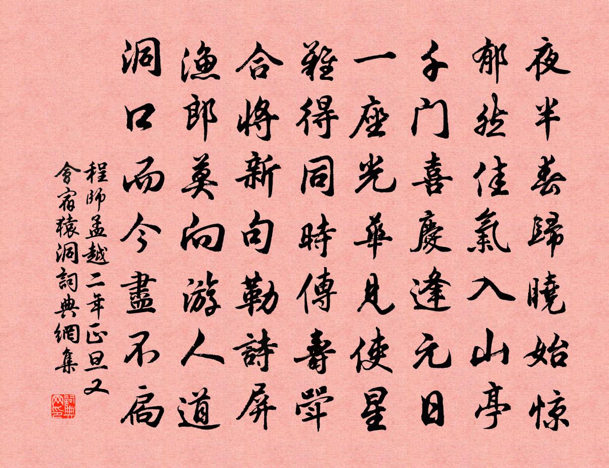 詩詞名句歷史字典書法欣賞書法字典國語詞典說文解字康熙字典古漢語字典標 題 作 者 詩 句 越二年正旦又會宿猿洞作者:程師孟 朝代:宋代越二年正旦又會宿猿洞原文夜半春歸曉始驚,郁然佳氣入山亭。千門喜慶逢元日,一座光華見使星。難得同時傳壽斝,合將新句勒詩屏。漁郎莫向遊人道,洞口而今盡不扃。詩詞問答問:越二年正旦又會宿猿洞的作者是誰?答:程師孟問:越二年正旦又會宿猿洞寫於哪個朝代?答:宋代程師孟越二年正旦又會宿猿洞書法欣賞越二年正旦又會宿猿洞書法作品詩詞推薦偈頌九十三首釋梵琮〔宋代〕不離家舍,常在途中。途中家舍,觸處相逢。人從明州來,卻入廬山去。雲間逢五老,因問途中事。難難,狂風吹石盆水窠姜特立〔宋代〕數葉玉簪敷翠,一拳水石含秋。何須坐我濠濮,自覺心清境幽。句諶祜〔宋代〕漢殿落花龍袞棄,周原荒棘虎營新。新定旅館中作趙湘〔唐代〕歲月鄉關外,溪山螟色中。孤城秋閉雨,獨客夜聞鴻。病使新髭出,貧令舊業空。思歸不得夢,欹枕近梧桐。秋晴陸游〔宋代〕身健心閒百慮輕。秋晴未必減春晴。晨窗暖日烘花氣,午枕微風送鳥聲。韞玉硯凹宜墨色,冷金牋滑助詩情。少年後天易吟三十首方回〔宋代〕學者欲學易,當觀羑里時。如何是敬字,恐懼畏憂危。題驛壁佚名〔宋代〕記得離家日,尊親囑咐言。逢橋須下馬,過渡莫爭船。雨宿宜防夜,難鳴更相天。若能依此語,行路免迍邅。採桑子·水亭花上三更月吳文英〔宋代〕水亭花上三更月,扇與人閒。弄影闌乾。玉燕重抽攏墜簪。心期偷卜新蓮子,秋入眉山。翠破紅殘。半簟湘波生曉達磨贊釋大觀〔宋代〕一花移自西,五葉香燦爛。嗅蕊與尋芳,紛如蜂蝶亂。地闊天寬,難圖滋蔓。減字木蘭花沈瀛〔宋代〕十巡今止。樂事要須防極喜。燭影搖風。月落參橫影子通。粗茶淡酒。五十狂歌供宴壽。敬謝來何。再得尋盟後日萬壽寺避暑讀書趙孟堅〔宋代〕梵寺齋殿深,屋古洞陰冷。火雲自空飛,此地暑盡屏。乍至心已清,坐久體如冰。官清務乃簡,居易事亦省。是為清平樂李之儀〔宋代〕蕭蕭風葉。似與更聲接。欲寄明璫非為怯。夢斷蘭舟桂楫。學書只寫鴛鴦。卻應無奈愁腸。安得一雙飛去,春風芳南澗小飲夜過景德次仲止韻徐文卿〔宋代〕嫩柳行邊行未匝,落梅香裹立多時。一杯徑醉歸來晚,江上伶俜瘦影隨。送何端卿帥瀘黃彥平〔宋代〕何侯石友平生事,傅粉風流詎可同。誰使擁旄三峽外,不留持橐五雲中。啼猿此去欺殘月,回雁因來吒便風。亦念句文同〔宋代〕北客若來休問事,西湖雖好莫吟詩。夜遊宮(宮詞)陸游〔宋代〕獨夜寒侵翠被。奈幽夢、不成還起。欲寫新愁淚濺紙。憶承恩,嘆餘生,今至此。蔌蔌燈花墜。問此際、報人何事宿柞樹下見趙行之所題詩趙蕃〔宋代〕人道朝霞不出門,今朝失喜見晴暾。長林未減霜前翠,疊巘全收雨後昏。兀兀不知為底日,悠悠又復度前村。眼明酒泉子辛棄疾〔宋代〕流水無情,潮到空城頭盡白,離歌一曲怨殘陽。斷人腸。東風官柳舞雕牆。三十六宮花濺淚,春聲何處說興亡。燕王家五弦張祜〔唐代〕五條弦出萬端情,撚撥間關漫態生。唯羨風流田太守,小金鈴子耳邊鳴。前漢門僭號公孫述周曇〔唐代〕劍蜀金湯孰敢爭,子陽才業匪雄英。方知在德不在險,危棧何曾阻漢兵。名句推薦君在陰兮影不見,君依光兮妾所願。傅玄《車遙遙篇》 小住京華,早又是,中秋佳節。秋瑾《滿江紅·小住京華》 相呼相應湘江闊,苦竹叢深日向西。鄭谷《鷓鴣》 弔影分為千里雁,辭根散作九秋蓬。白居易《望月有感》 桃花落,閒池閣。山盟雖在,錦書難托。陸游《釵頭鳳·紅酥手》 聽人以言,樂於鐘鼓琴瑟。荀子《荀子·非相》 陌上花開蝴蝶飛,江山猶是昔人非。蘇軾《陌上花三首》 關山多雨雪,風水損毛衣。李遠《詠雁》 酷暑天,葵榴發,噴鼻香十里荷花。白樸《得勝樂·夏》 千雷萬霆,激繞其身,霰雪雨雹,一時皆下。李朝威《柳毅傳》
