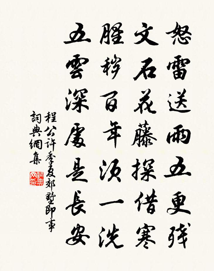 詩詞名句歷史字典書法欣賞書法字典國語詞典說文解字康熙字典古漢語字典標 題 作 者 詩 句 季夏郊墅即事作者:程公許 朝代:宋代季夏郊墅即事原文怒雷送雨五更殘,文石花藤探借寒。腥穢百年須一洗,五雲深處是長安。詩詞問答問:季夏郊墅即事的作者是誰?答:程公許問:季夏郊墅即事寫於哪個朝代?答:宋代程公許季夏郊墅即事書法欣賞季夏郊墅即事書法作品詩詞推薦阮郎歸趙眘〔宋代〕留連春意晚花稠。雲疏雨未收。新荷池面葉齊抽。涼天醉碧樓。能達理,有何愁。心寬萬事休。人生還似水中漚。又上監察御史王珪〔唐代〕一札興賢聖化新,觀光上國已彬彬。右文幸際休明世,奉昭猶須牧守臣。鵜鴃不為芳草計,鷦鷯似畏罻羅人。軺車山居即事釋紹嵩〔宋代〕老罷休無賴,吟詩報答閒。圓扉長寂寂,騰口任{左口右顏}{左口右顏}。護塔雲偏重,棲林鳥自還。榮枯不經端正好杜安世〔宋代〕欄菊愁煙沾秋露。天微冷、雙燕辭去。月明空照別離苦。透素光、穿朱戶。夜來西風雕寒樹。憑闌望、迢遙長路。書來上人房王之道〔宋代〕十里清風水拍天,老僧齋罷抱頭眠。丹楹畫棟看摧厭,好為僧伽作勝緣。滿江紅佚名〔宋代〕雪共梅花,念動是、經年離拆。重會面、玉肌真態,一般標格。誰道無情應也妒,暗香埋沒教誰識。卻隨風、偷入蝶陸游〔宋代〕庭下幽花取次香,飛飛小蝶占年光。幽人為爾憑窗久,可愛深黃愛淺黃?永明樂 九謝朓〔南北朝〕生蔑{艹/阡}蘿性。身與嘉惠隆。飛纓入華殿。屣步出重宮。途中楊炯〔唐代〕悠悠辭鼎邑,去去指金墉。途路盈千里,山川亘百重。風行常有地,雲出本多峰。鬱郁園中柳,亭亭山上松。客心采芡文同〔宋代〕芡盤團團開碧輪,城東壕中如疊鱗。漢南父老舊不識,日日岸上多少人。駢頭鬅忪露秋熟,綠刺紅鍼割寒玉。提籠題僦樓壁川官〔宋代〕朝看貝葉牢籠佛,夜禮星辰取奉天。呼召歸來聞好語,初三初四亦欣然。漢州房公湖孫應時〔宋代〕陰陰老木匝平湖,想見房公用意初。眼底園池那有此,胸中丘壑故須渠。風流正自能傳世,成敗應難盡信書。萬里北窗偶題陸游〔宋代〕爾叢香百合,一架粉長春。堪笑龜堂老,歡然不記貧。偈三十五首釋祖珍〔宋代〕是處青山可垛跟,白雲流水繞孤村。笑攜拄杖出門去,三世誰知一口吞。文與可嘗雲老僧墨竹一派近在湖州吾竹雖不及黃庭堅〔宋代〕東坡雖是湖州派,竹石風流各一時。前世畫師今姓李,不妨還作輞川詩。句李良臣〔宋代〕士恥無名字,吾兒早振聲。和石昌言學士官舍十題葵花梅堯臣〔宋代〕此心生不背朝日,肯信眾草能蘙之。真似節旄思屬國,向來零落誰能持。同魏進道晚過湖上韓維〔宋代〕春風湖上泮,奈此淨綠何。平堤看瀲灩,皎如鏡新磨。支流別而東,下走萬玉珂。俜俜橋邊柳,芳牙綴柔柯。中洲燕坐張鎡〔宋代〕為君刻意五七字,甫壯知心一兩人。百計縱疎終辦此,直疑賈孟是前身。翁通判通輓詞徐璣〔宋代〕處已先能儉,為官易得清。長卿詩最好,叔度德難名。歸旐郴江遠,新墳秀嶺平。松楸本相望,惆悵不堪情。名句推薦藍橋何處覓雲英。只有多情流水、伴人行。蘇軾《南歌子·寓意》 小軒窗。正梳妝。相顧無言,惟有淚千行。蘇軾《江城子·乙卯正月二十日夜記夢》 牆倒眾人推。曹雪芹《紅樓夢·第五十五回》 江上往來人,但愛鱸魚美范仲淹《江上漁者》 青山欲共高人語。聯翩萬馬來無數。辛棄疾《菩薩蠻·金陵賞心亭為葉丞相賦》 十五彩衣年,承歡慈母前。孟浩然《送張參明經舉兼向涇州覲省》 奸巧語,穢污詞。市井氣,切戒之。李毓秀《弟子規·信》 依舊桃花面,頻低柳葉眉。韋莊《女冠子·昨夜夜半》 蚤是傷春夢雨天,可堪芳草更芊芊。韋莊《長安清明》 山下出泉,蒙;君子以果行育德。佚名《易傳·象傳上·蒙》