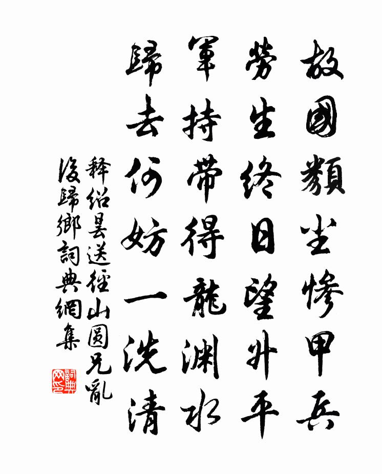 詩詞名句歷史字典書法欣賞書法字典國語詞典說文解字康熙字典古漢語字典標 題 作 者 詩 句 送徑山圓兄亂後歸鄉作者:釋紹曇 朝代:宋代送徑山圓兄亂後歸鄉原文故國類塵慘甲兵,勞生終日望昇平。軍持帶得龍淵水,歸去何妨一洗清。詩詞問答問:送徑山圓兄亂後歸鄉的作者是誰?答:釋紹曇問:送徑山圓兄亂後歸鄉寫於哪個朝代?答:宋代釋紹曇送徑山圓兄亂後歸鄉書法欣賞送徑山圓兄亂後歸鄉書法作品詩詞推薦繡線菊史鑄〔宋代〕天成素縷結秋深,巧刺由來不犯針。籬下工夫可絢爛,條條綰綴紫花心。溪山堂三首王阮〔宋代〕地勝年年別,人閒事事幽。水流縈檻角,山奮入簾鈞。舊好空馳馬,新盟但狎鷗。故人紼得路,何日共茲游。廢觀林景英〔宋代〕羽衣人已化,無下問殊庭。春色桃誰種,天香藥正靈。片霞飛絕頂,一鶴下青冥。荒蘚空階下,猶聞夜祭星。親祀南郊詩蔡襄〔宋代〕天畀元統,赤運開祉。聖祖神宗,海域平砥。思皇真考,岳封汾祀。餌系戎胡,包束戈矢。丕顯靈德,光被萬里。吊岳文二公二首何夢桂〔宋代〕擬吊英雄酒一觴,二公什膽一冰霜。金人未殄將軍死,宋事無成國土亡。湖上黃埃寒柏慘,沙場青血夜燐光。生芻西窗徐太玉〔宋代〕十日書窗九日扃,春晴無處不閒行。瓶花落盡無人管,留得殘枝葉自生。青樓行李流謙〔宋代〕踏空驕馬足鐵踣,萬里一鞭驚滅沒。青樓美人顏如花,笑揭珠簾邀客入。小槽珠溜紅滴滴,左持瓊觴右瑤瑟。得君失調名佚名〔宋代〕黃葉無風自落,彩雲不雨空歸。金峨途中鄭清之〔宋代〕石路索紆水繞村,酒帘深處見柴門。橫塘樹密鳩攜婦,老屋籬深犢有孫。麥莟菜花成綿繡,筍牙薤甲當雞豚。竹輿漁家傲梵琦〔元代〕聽說西方無量樂。四方上下天垂幕。不比娑婆田地惡。無垠*。純將一片琉璃作。能掃愛河波浪涸。盡翻苦樹枝條會節園梅花下作崔鶠〔宋代〕去年白玉花,結子深林間。小憩藉清影,低顰啄微酸。故人不復見,春事今已闌。繞樹尋履跡,空餘土花班。晨起覽鏡六首劉克莊〔宋代〕少日手抄尤謹楷,中年目視稍眵昏。如今天罰偏盲了,燭下殘書尚覆翻。老去吟邵雍〔宋代〕老去無成鬢已斑,縱心年歲合清閒。如何得意雲山外,更欲游心詩酒間。大字寫詩酬素志,小杯斟酒發酡顏。春雷觀法駕自鳳翔回錢起〔唐代〕欃搶一掃滅,閶闔九重開。海晏鯨鯢盡,天旋日月來。聖情蘇品物,龍御辟雲雷。曉漏移仙仗,朝陽出帝台。周慚登頭陀寺峰頂庵賀鑄〔宋代〕磴道淩虛掛白虹,頭陀上方黃鵠東。滄溟五夜浴新日,老木三伏來淒風。北夢南雲展張闊,縱江橫漢併吞雄。楚鄉賦以鶴羽代銀甲琴士〔宋代〕嶧陽孤桐鳴素絲,玉為軫兮金為徽。四珍合就已奇絕,猶嫌指聲未清徹。負金翅管長且尖,剪成爪樣鸞膠粘。輕弦行香子侯善淵〔元代〕天地玄黃。率化無疆。太虛高、日月飛。龍磨星斗,鳳熾玄網。見海神潮,江神會,穀神張。煥煥煌煌。照耀十臨清樓釋行海〔宋代〕樓影斜侵賀鑑湖,月隨天遠極蒼梧。青山不受秦封禪,白鳥猶驚越霸圖。煙帶夕陽籠野樹,雨生春漲沒平蕪。好詩鷓鴣天向子諲〔宋代〕莫問清江與洛陽。山林總是一般香。兩家地占西南勝,可是前人例姓楊。石作枕,醉為鄉。藕花菱角滿池塘。雖無河傳(秋夜旅懷)趙鼎〔宋代〕秋光向晚,嘆羈游坐見。年華將換。一紙素書,擬托南來征雁。奈雪深、天更遠。東窗皓月今宵滿。淺酌芳尊,暫名句推薦春來秋去相思在,秋去春來信息稀。魚玄機《閨怨》 塞馬一聲嘶,殘星拂大旗。納蘭性德《菩薩蠻·朔風吹散三更雪》 三顧頻煩天下計,兩朝開濟老臣心。杜甫《蜀相》 自古驕兵多致敗,從來輕敵少成功。羅貫中《三國演義·第六十九回》 不管三七二十一馮夢龍《醒世恆言·卷一》 差之毫厘,失之千里。佚名《增廣賢文·上集》 雁柱十三弦,一一春鶯語。歐陽修《生查子·含羞整翠鬟》 欹枕數秋天,蟾蜍下早弦。納蘭性德《菩薩蠻·蕭蕭幾葉風兼雨》 思來江山外,望盡煙雲生。張九齡《秋晚登樓望南江入始興郡路》 人胸中各有個聖人,只自信不及,都自埋倒了。王陽明《傳習錄·卷下·門人陳九川錄》