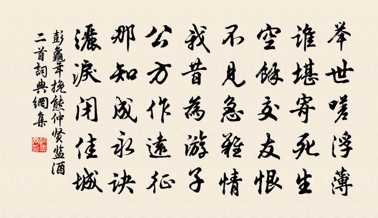 詩詞名句歷史字典書法欣賞書法字典國語詞典說文解字康熙字典古漢語字典標 題 作 者 詩 句 挽熊仲賢監酒二首作者:彭龜年 朝代:宋代挽熊仲賢監酒二首原文舉世嗟浮薄,誰堪寄死生。空餘交友恨,不見急難情。我昔為遊子,公方作遠征。那知成永訣,灑淚閉佳城。詩詞問答問:挽熊仲賢監酒二首的作者是誰?答:彭龜年問:挽熊仲賢監酒二首寫於哪個朝代?答:宋代彭龜年挽熊仲賢監酒二首書法欣賞挽熊仲賢監酒二首書法作品詩詞推薦送強甫赴惠安六言十首劉克莊〔宋代〕警報環四面至,急符寓一分寬。吾兒行矣無怨,太守似元次山。憑欄人張可久〔元代〕小玉欄桿月半掐,嫩綠池塘春幾家。鳥啼芳樹丫,燕銜黃柳花。二月十七日欲招客飲而風霾不果有作張耒〔宋代〕欲攜佳客燕高堂,園館春風又作狂。猶挾冰霜余意氣,未分桃李好風光。青山無賴藏雲岫,流水生波灩野塘。不飲隆興書堂自警三十五首陳淳〔宋代〕心藏隱奧中,乘間亦易動。須於動之微,堅持勿使縱。贈雪林李和甫周弼〔宋代〕忽地相逢便解顏,況兼終日看青山。精神摘柳喔詩際,標度尋梅集句間。春淡野橋孤艇遠,暮寒溪寺一鍾閒。匆匆與羅隱之聯句鄭遨〔唐代〕一壺天上有名物,兩個世間無事人。 ——鄭遨醉卻隱之雲叟外,不知何處是天真。 ——羅隱之浣溪沙(春深)趙長卿〔宋代〕寒食風霜最可人。梨花榆火一時新。心頭眼底總宜春。薄暮歸吟芳草路,落紅深處鷓鴣聲。東風疏雨喚愁生。送趙君十絕汪莘〔宋代〕風雨黃昏自掩扉,燈前時復一噓欷。兒曹相問緣何事,為道君侯早晚歸。掛金索佚名〔宋代〕三更里,陽生子母朝金闕。海底靈龜,吸盡金鳥烏血。一*綿綿,三關都透徹。萬道霞光,捧出西江月。閒居吟金朋說〔宋代〕斗室安居廣,爐香樂性閒。不欺幽獨境,無愧兩儀間。滿江紅楊炎正〔宋代〕壽酒如澠,拼一醉、勸君休惜。君不記、濟河津畔,當年今夕。萬丈文章光焰里,一星飛墮從南極。便御飛、乘興送人之南嶽釋真淨〔宋代〕境幽南嶽寺,路向碧岩分。遠近松相接,高低鍾共聞。靈禽時奏樂,香石日籠雲。想到經行處,超然趣不群。宴坐陸游〔宋代〕氣住即存神,心安自保身。誰歟二豎子,卓爾一真人。氣泝如潮上,津流若酒醇。幽居幸無事,莫玩物華新。懷古題雪十首李伋郊雪方鳳〔宋代〕西湖無舟波凍合,孤山照人如玉立。太守徒行訪隱君,門前淨掃茶煙濕。坐談會公幽懷開,寒梅吹香當酒杯。隱君同游嶽麓道遇大雪馬上次敬夫韻林用中〔宋代〕遙瞻衡岳頂,雲盡碧參差。人從南方至,雪墜西崖垂。談玄問老子,鳴佩邀神妃。飛花舞瓊瑤,青壁比珠璣。平生梅花滕岑〔宋代〕欲尋好句乞梅花,從實平章不要夸。且道色香誰可比,只才擬議即成差。贈三局能師二絕蘇轍〔宋代〕得失從來似偶然,因師聊復問行年。此生竟墮陰陽數,方信修行力未全。旅食江乾秋復春,歸耕未遂不勝貧。憑師題寶岩寺寒碧亭二首王安石〔宋代〕風吹洞口雲,水動山頭月。野老時問人,前村多少雪。和秦壽之春晚偶成八絕王之道〔宋代〕官閒時醉秀溪春,醉里吟詩字字新。欲報自慚無好語,年來胸次亦埃塵。畫堂春·寄子由蘇軾〔宋代〕柳花飛處麥搖波,晚湖淨鑒新磨。小舟飛棹去如梭,齊唱采菱歌。平野水雲溶漾,小樓風日晴和。濟南何在暮雲多名句推薦海畔尖山似劍鋩,秋來處處割愁腸。柳宗元《與浩初上人同看山寄京華親故》 打起黃鶯兒,莫教枝上啼。金昌緒《春怨 / 伊州歌》 兩株桃杏映籬斜,妝點商州副使家。王禹偁《春居雜興·兩株桃杏映籬斜》 人皆欲會說話,蘇秦乃因會說而殺身王永彬《圍爐夜話·第七則》 數叢沙草群鷗散,萬頃江田一鷺飛。溫庭筠《利州南渡》 公天下之身,公天下之物,其唯至人矣!列子及其弟子《列子·楊朱》 先到為君,後到為臣。佚名《增廣賢文·上集》 蘭有秀兮菊有芳,懷佳人兮不能忘。劉徹《秋風辭》 五馬如飛龍,青絲結金絡。李白《陌上桑》 何當載酒來,共醉重陽節。孟浩然《秋登蘭山寄張五》