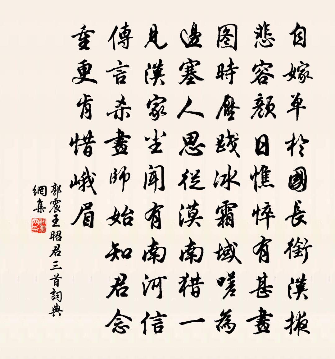 詩詞名句歷史字典書法欣賞書法字典國語詞典說文解字康熙字典古漢語字典標 題 作 者 詩 句 王昭君三首作者:郭震 朝代:唐代王昭君三首原文自嫁單于國,長銜漢掖悲。容顏日憔悴,有甚畫圖時。壓踐冰霜域,嗟為邊塞人。思從漠南獵,一見漢家塵。聞有南河信,傳言殺畫師。始知君念重,更肯惜峨眉。詩詞問答問:王昭君三首的作者是誰?答:郭震問:王昭君三首寫於哪個朝代?答:唐代郭震王昭君三首書法欣賞王昭君三首書法作品注釋全唐詩:卷66_6詩詞推薦巴嶺張至龍〔宋代〕處處柴門掩半邊,鶯啼綠樹隔炊煙。竹梯閒倚柔桑畔,定是人家蠶正眠。風流子張元乾〔宋代〕飛觀插雕粱。憑虛起、縹緲五雲鄉。對山滴翠嵐,兩眉濃黛,水分雙派,滿眼波光。曲欄乾外,汀煙輕冉冉,莎草綺羅香 紅葉王沂孫〔宋代〕玉杵餘丹,金刀剩彩,重染吳江孤樹。幾點朱鉛,幾度怨啼秋暮。驚舊夢、綠鬢輕凋,訴新恨、絳唇微注。最堪憐除官行至昭應聞友人出官因寄杜牧〔唐代〕賤子來千里,明公去一麾。可能休涕淚,豈獨感恩知。草木窮秋後,山川落照時。如何望故國,驅馬卻遲遲?採桑子馮延巳〔唐代〕櫻桃謝了梨花發,紅白相催。燕子歸來,幾度香風綠戶開。人間樂事知多少,且酹金杯。管咽弦哀,慢引蕭娘舞袖寄元九白居易〔唐代〕一病經四年,親朋書信斷。窮通合易交,自笑知何晚。元君在荊楚,去日唯雲遠。彼獨是何人,心如石不轉。憂我景祐元年親享景靈宮二首真宗〔宋代〕真館奉幣,潔齊致聲。靈因斯格,社稷慶寧。恭次家大人初抵海陵官舍元韻孫應時〔宋代〕風饕雪虐苦侵陵,已免寒舟問水程。葦屋虛檐交夜氣,邊城疏鼓逗天明。囊空尚可充飢色,官冷何妨遠市聲。且辨三高祠江東步兵孫銳〔宋代〕秋風不為紫鱸香,適志徒勞夢水鄉。惟是此生一杯酒,宦情無日不滄浪。暮春偶成四首廖行之〔宋代〕殘花自開落,遲日半晴陰。翡翠山容暗,蒲萄江漲深。綠楊渾作絮,黃鳥欲成瘖。春事今如許,誰能首酒斟。念奴嬌劉辰翁〔宋代〕枯寒生晚,復何似、張緒少年時意。薄命不逢何至此,滿眼啼妝齲齒。城是城非,年來年去,萬八千能幾。半痴半酬張祜處士見寄長句四韻杜牧〔唐代〕七子論詩誰似公?曹劉須在指揮中。薦衡昔日知文舉,乞火無人作蒯通。北極樓台長掛夢,西江波浪遠吞空。可憐渾侍中宅牡丹劉禹錫〔唐代〕徑尺千餘朵,人間有此花。今朝見顏色,更不向諸家。蒼梧謠/歸字謠蔡伸〔宋代〕天。休使圓蟾照客眠。人何在,桂影自嬋娟。二月晦日夜夢欲卜居近邑道遇老父告以不利欣陸游〔宋代〕夢中行卜居,道遇白髯叟,一面出苦言,戒我棄勿取,人之生實難,失腳墮虎口。我深感其言,解衣奉杯酒,豈知庵中雜書陸游〔宋代〕茅茨一室有餘樂,轍環四海誰知心?輟耕壟上鴻鵠志,長嘯山中鸞鳳音。頌古二十六首釋嗣宗〔宋代〕鬼子掛起那吒面,赤腳跨定須彌盧。鐵牛鞭起黃河岸,大洋海底食珊瑚。家園小酌陸游〔宋代〕滿林春筍生無數,竟日鸕鶿來百回。衣上塵埃真一洗,酒邊懷抱得頻開。池魚往者憂奇禍,社櫟終然幸散材。世世歲暮雜感十首曾國藩〔清代〕韶華彈指總悠悠,我到人間首五秋。自愧望洋迷學海,更無清福住糟邱。尊前瓦注曾於局,腳底紅塵即九州。自笑十四弟歸洪州賦莫如兄弟四章贈行黃庭堅〔宋代〕大父無恙時,刻意教子弟。歸掃松楸下,灑我萬里涕。名句推薦置酒長安道,同心與我違。王維《送綦毋潛落第還鄉 / 送別》 巴山楚水淒涼地,二十三年棄置身。劉禹錫《酬樂天揚州初逢席上見贈》 遊子乍聞征袖濕,佳人才唱翠眉低。鄭谷《鷓鴣》 外內表里,自相副稱。王充《論衡·卷十三·超奇篇》 貴出如糞土,賤取如珠玉。司馬遷《史記·貨殖列傳》 不盡眼中青,是愁來時節張元乾《石州慢·寒水依痕》 私勿與人,謀必辟。來俊臣《羅織經·治下卷第三》 賢達哀樂,不在窮通禍福之間。脫脫《遼史·列傳·卷三十四》 奇文共欣賞,疑義相與析。陶淵明《移居二首》 路逢俠客須呈劍,不是才人莫獻詩。佚名《增廣賢文·上集》