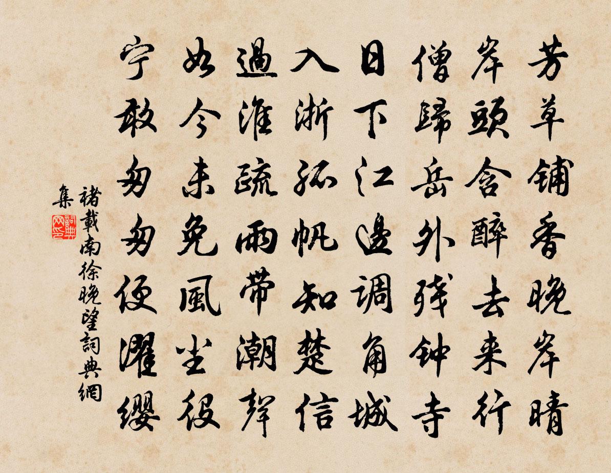 詩詞名句歷史字典書法欣賞書法字典國語詞典說文解字康熙字典古漢語字典標 題 作 者 詩 句 南徐晚望作者:褚載 朝代:唐代南徐晚望原文芳草鋪香晚岸晴,岸頭含醉去來行。僧歸岳外殘鍾寺,日下江邊調角城。入浙孤帆知楚信,過淮疏雨帶潮聲。如今未免風塵役,寧敢匆匆便濯纓。詩詞問答問:南徐晚望的作者是誰?答:褚載問:南徐晚望寫於哪個朝代?答:唐代問:南徐晚望是什麼體裁?答:七律褚載南徐晚望書法欣賞南徐晚望書法作品注釋全唐詩:卷694-28詩詞推薦投知己皎然〔唐代〕若為令憶洞庭春,上有閒雲可隱身。無限白雲山要買,不知山價出何人。素梅 四九王冕〔元代〕月明海底夜無煙,恰似西湖雪後天。清氣逼人禁不得,玉簫吹上大樓船。送房處士閒遊李群玉〔唐代〕採藥陶貞白,尋山許遠遊。刀圭藏妙用,岩洞契冥搜。花月三江水,琴尊一葉舟。羨君隨野鶴,長揖稻粱愁。新作火閣陸游〔宋代〕旋設篝爐下紙簾,樂哉容膝似陶潛。囊中佩藥無時服,架上堆書信手拈。似玉秋菰殊未老,如雲宿麥不須占。掃空再和項安世〔宋代〕湖海崢嶸老氣,風雲慘澹高情。可惜元龍雙鬢,江南江北詩聲。過盧北山陳藻〔宋代〕西成課罷赴群居,中路誰家倦憩予。恰見主人方早起,檐前觀我所為書。重陽二首蘇泂〔宋代〕為客時多不解愁,亦逢佳節強登樓。酒闌自摘茱萸望,何處青山是越州。同安權縣林丞和餘二首趁韻答之劉克莊〔宋代〕雖與尊公甲子同,懸鶉久矣愧華蟲。程仇不□□□魏,王貢安能勝鮑龔。時有放歌吟屋破,且無□□□途窮。故山出塞(一作塞上曲)張籍〔唐代〕秋塞雪初下,將軍遠出師。分營長記火,放馬不收旗。月冷邊帳濕,沙昏夜探遲。征人皆白首,誰見滅胡時。送王子文宰昭武真德秀〔宋代〕樵川古礫國,誰遣生榛菅。往事忍復言,念之輒長吸。子往字其人,寄任良亦艱。傷哉周余民,十室九孤鰥。深心過廣德宿開元寺上人房王之道〔宋代〕滿城花草斗欣榮,嫩綠夭紅照眼明。會有禪房通野色,解鞍聊復憩予行。宿翠岩寺呈李弘齋簽判裘萬頃〔宋代〕匡廬勝處君曾到,誰是淵明與遠公。幸有和陶詩卷在,好依蓮社此山中。雜劇·逞風流王煥百花亭佚名〔元代〕第一折(老旦扮卜兒引旦賀憐憐、梅香盼兒上,詩云)教你當家不當家,及至當家亂如麻。早晨起來七件事,柴米讀道書作游九言〔宋代〕岩居秉貞操,所慕在玄虛。清夜眠齋宇,終身觀道憶。形忘氣自充,性達理不余。於道雖未庶,已超名跡拘。至樂過荻塘次韻衛宗武〔宋代〕平林歷歷曉雲迷,津堠將迎客棹西。千古興亡泰伯國,一川經緯鍬公堤。雨添柳色成蛾綠,春剩花香散麝臍。去去讀黃節推卷梅堯臣〔宋代〕磊落黃從事,清吟古氣多。少年知任俠,欲老解登科。辨起公卿坐,時為慷慨歌。又持珠玉贈,將奈老貧何。昭武太守王子文日舉李賈嚴羽共觀前輩一兩家戴復古〔宋代〕欲參詩律似參禪,妙趣不由文字傳。個裡稍關心有誤,發為言句自超然。題畫四首唐寅〔明代〕黃葉山家繞會琴,斜陽流水路陰陰。東西茅屋雞豚社,氣象粗疏有古心。沁園春(和蘇宣教韻)廖行之〔宋代〕直下承當,本來能解,莫遣干休。算如今蹉過,崢嶸歲月,分陰可惜,一日三秋。鬧里偷聲,日中逃影,用盡機關出塞曲陸游〔宋代〕佩刀一刺山為開,壯士大呼城為摧。三軍甲馬不知數,但見動地銀山來。長戈逐虎祁連北,馬前曳來血丹臆;卻回名句推薦遠雁下平沙,嘹亮遺淒唳。劉道著《湘江秋曉》 猶有遺簪,不展秋心,能卷幾多炎熱。張炎《疏影·詠荷葉》 遠送從此別,青山空復情。杜甫《奉濟驛重送嚴公四韻》 獨坐幽篁里,彈琴復長嘯。王維《竹里館》 寒夜客來茶當酒,竹爐湯沸火初紅。杜耒《寒夜》 梧桐樹,三更雨,不道離情正苦。溫庭筠《更漏子·玉爐香》 風雨送春歸,飛雪迎春到。 * 《卜運算元·詠梅》 細雨魚兒出,微風燕子斜。杜甫《水檻遣心二首》 江山留勝跡,我輩復登臨。孟浩然《與諸子登峴山》 佳節又重陽,玉枕紗廚,半夜涼初透。李清照《醉花陰·薄霧濃雲愁永晝》
