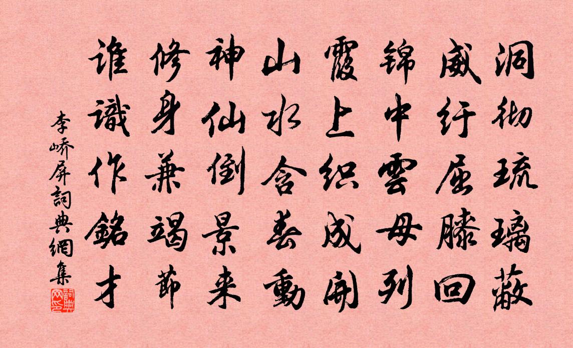 詩詞名句歷史字典書法欣賞書法字典國語詞典說文解字康熙字典古漢語字典標 題 作 者 詩 句 屏作者:李嶠 朝代:唐代屏原文洞徹琉璃蔽,威紆屈膝回。錦中雲母列,霞上織成開。山水含春動,神仙倒景來。修身兼竭節,誰識作銘才。詩詞問答問:屏的作者是誰?答:李嶠問:屏寫於哪個朝代?答:唐代問:屏是什麼體裁?答:五律李嶠屏書法欣賞屏書法作品注釋全唐詩:卷60_17詩詞推薦三衢椿監寺修造佛殿釋崇岳〔宋代〕黃面瞿野放搭痴,千方百計討便宜。而今無著渾身處,卻要兒孫蓋覆伊。次韻袁升之游雲寺鴻慶院山茶之什蒲瀛〔宋代〕山茶兩本上連空,疊葉棲枝占佛宮。雀尾有金輪紺碧,鶴頭無火鑲所紅。優於峽茗稱呼異,劣興梅花氣候同。誰識舟中遇柳伯存歸潛山,因有此贈吳筠〔唐代〕澆風久成俗,真隱不可求。何悟非所冀,得君在扁舟。目擊道已存,一笑遂忘言。況觀絕交書,兼睹箴隱文。見君贈星翁郭若水吳泳〔宋代〕月臨宮斗退這懼宮,宮直南宮箕蘇子憂。片文隻字不經世,赤口白知空招尤。我生之初函二氣,地則五行天五緯。元豐行示德逢王安石〔宋代〕四山翛翛映赤日,田背坼如龜兆出。湖陰先生坐草室,看踏溝車望秋實。雷蟠電掣雲滔滔,夜半載雨輸亭皋。旱禾送冷朝陽擢第後歸金陵覲省錢起〔唐代〕萊子晝歸今始好,潘園景色夏偏濃。夕陽流水吟詩去,明月青山出竹逢。兄弟相歡初讓果,鄉人爭賀舊登龍。佳期戲題洞霄鍾震〔宋代〕之徑縈紆略彴橫,松風和作步虛聲。泉流珠玉千年潤,山作靈丹九轉成。瓊館向曾迎帝輦,冰銜今尚帶朝纓。若非再登蓬萊閣釋紹嵩〔宋代〕不到蓬萊又幾時,且搘筇杖看雲移。等閒遇事成歌詠,人道新詩勝舊詩。送錢副使黎陽發運徐鉉〔唐代〕一杯寒食酒,珍重送君行。花影黎陽渡,春風浚水聲。泛舟無廢事,聘驥有修程。套用方無暇,何須愴別情。游金精次韻曾原郕〔宋代〕鯨奔獸駭羅群峰,晴嵐濕霧深幾重。世言番君勇穿石,此事荒唐敢雲實。仙凡聚散那得知,祗今流水篆元之。沖升偈頌七十一首釋了惠〔宋代〕仲冬嚴寒年年事,須知事上大有事。若人知得事上事,到了全然不幹事。題小桃源圖胡銓〔宋代〕閒愛鶴立木,靜嫌僧叩門。是非花莫笑,白黑手能言。心遠闊塵境,路幽迷水村。逢人不須說,自喚小桃源。謁金門·秋已暮牛希濟〔唐代〕秋已暮,重疊關山岐路。嘶馬搖鞭何處去,曉禽霜滿樹。夢斷禁城鐘鼓,淚滴枕檀無數。一點凝紅和薄霧,翠蛾愁驟雨呈質夫兄陳棣〔宋代〕屏翳驅馳雲陣疾,西山猶銜半輪日。迅雷震地窗戶搖,急雨翻盆溝澮溢。紫電燒空天為低,黑風逆浪海欲立。縱多見牆間竹影擬而畫之終不近也郭印〔宋代〕東牆才過午,寫此此君真。日翳倏無跡,雲開俄有神。因緣鹹自爾,形似竟誰親。筆墨有非偽,天公恐笑人。春詞毛滂〔宋代〕冰銷玉液鳧鷖喜,日暖宜春草木長。忠厚家風傳八葉,太平光景接三王。小圃茅亭初成即事十絕句程公許〔宋代〕手劚西牆擇地偏,疏篁慣與養風煙。鋤荒當得經綸否,聊作仙曹小有天。夏日觀農尤概〔宋代〕行行曠野間,田家功正甫。老農謂予言,此中情難數。焦枯慮連旱,陰損慮積雨。插蒔復耕耘,酷日無從拒。豈不頌古五首釋守仁〔宋代〕鋸解秤錘,油煎石磉。兩手擎來,有功者賞。水調歌頭 代贈醫者葛道夫吳存〔元代〕欲問花長生藥,花句漏有丹花砂。只今花醫國妙手,還屬葛仙家。出入聖神工巧,操縱溫涼寒熱,功用妙無涯。談名句推薦出師一表通今古,夜半挑燈更細看。陸游《病起書懷》 登山則情滿于山,觀海則意溢於海劉勰《文心雕龍·神思》 有花有酒春常在,無燭無燈夜自明蒲松齡《聊齋志異·卷一·考城隍》 君子以遠小人,不惡而嚴。佚名《易傳·象傳下·遯》 偶然值林叟,談笑無還期。王維《終南別業 / 初至山中 / 入山寄城中故人》 澗影見松竹,潭香聞芰荷。孟浩然《夏日浮舟過陳大水亭 / 浮舟過滕逸人別業》 民不畏死,奈何以死懼之?老子《老子·德經·第七十四章》 白草黃沙。月照孤村三兩家。蔣氏女《減字木蘭花·題雄州驛》 人不可以無恥。無恥之恥,無恥矣。孟子《孟子·盡心章句上·第六節》 迴廊一寸相思地,落月成孤倚。納蘭性德《虞美人·銀床淅瀝青梧老》